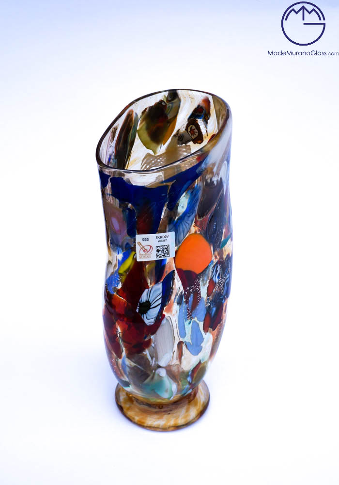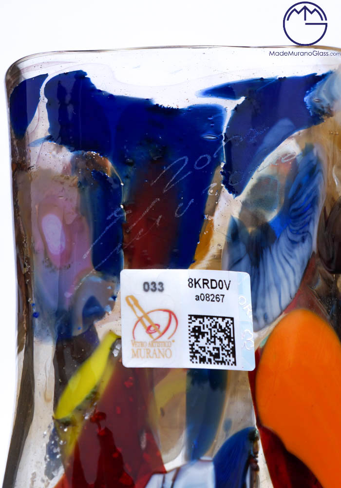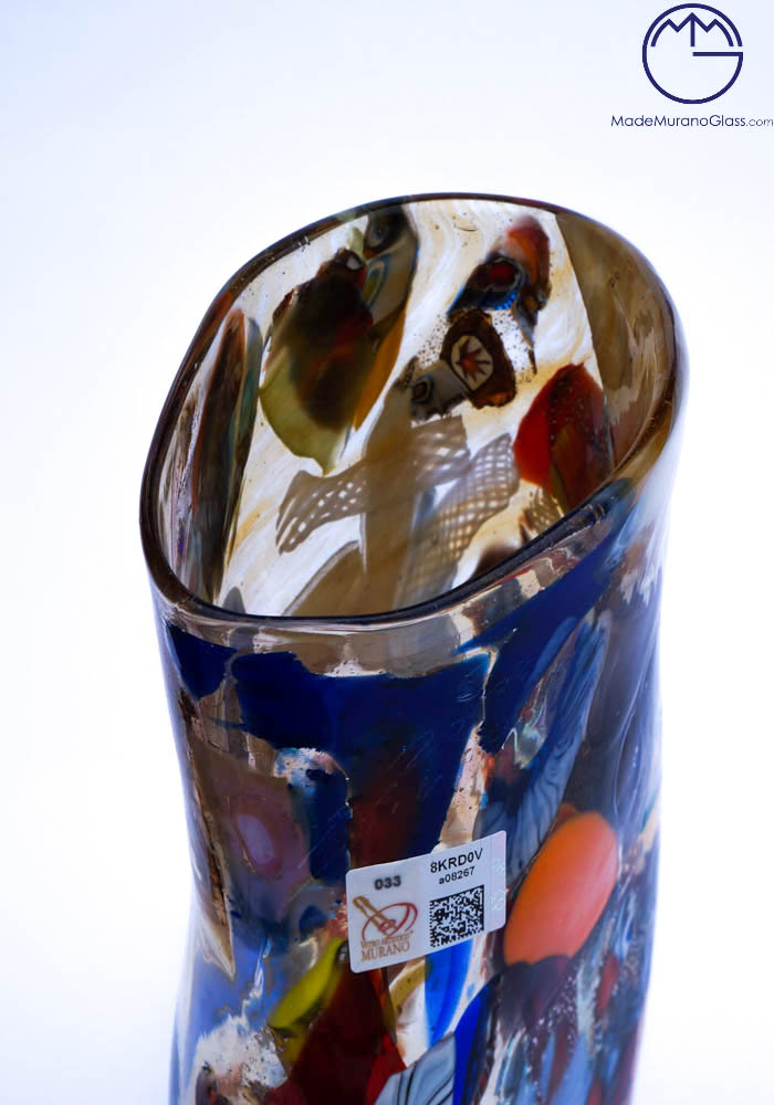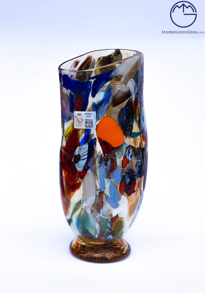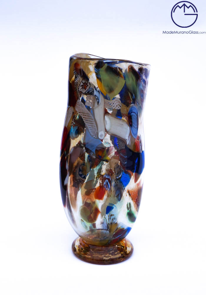 Venetian blown glass amber vase with assorted filigree decorations, Millefiori, “Mace” and silver. “Mario Costantini” glassmaker Master mixes these colors in an ever different way, making the works so unique and inimitable. Vase signed with cold engraving as photos. The venetian glass vase has the label Marchio Vetro Artistico®. View Photo.