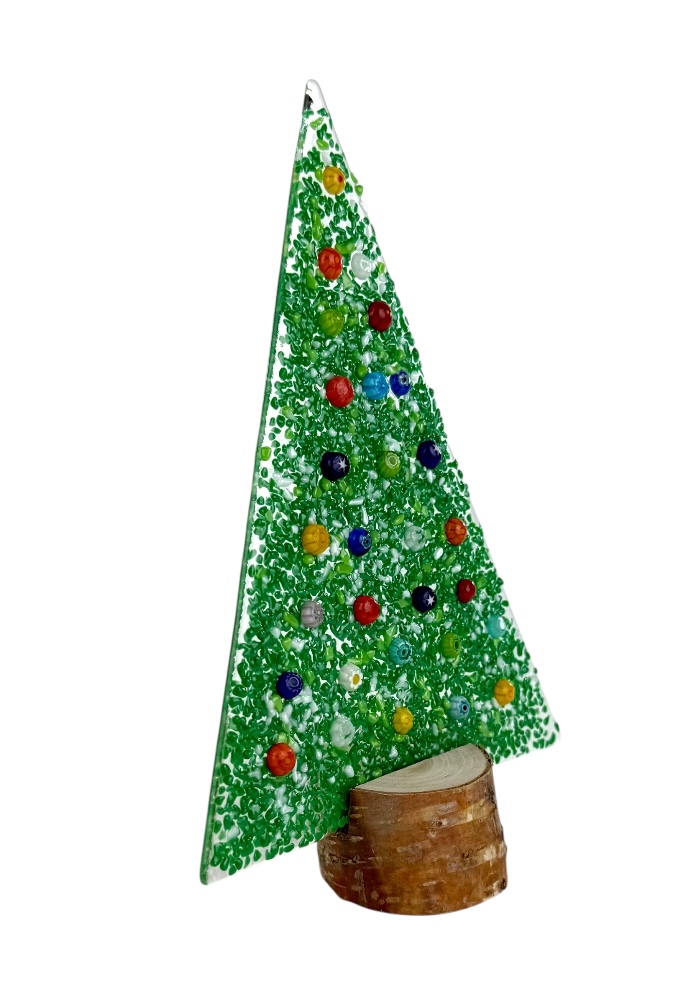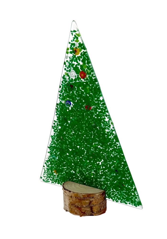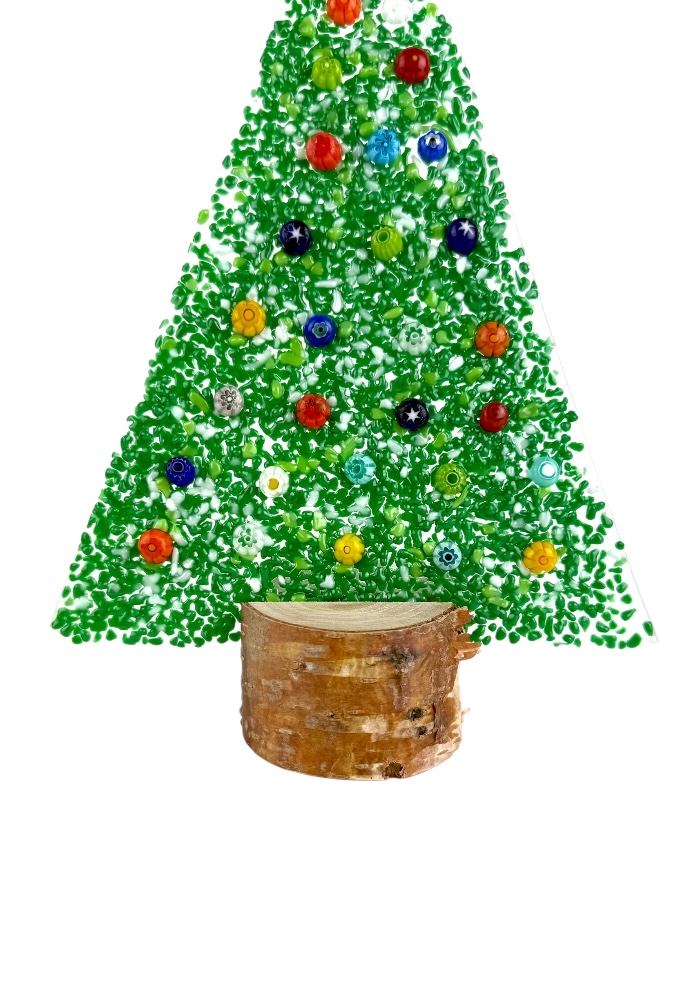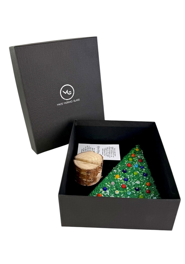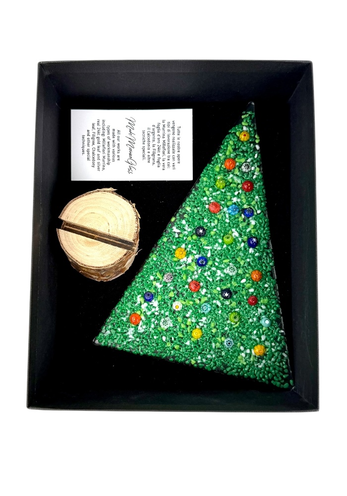 Murano glass Christmas tree with real wood base, supplied with a personalized box.