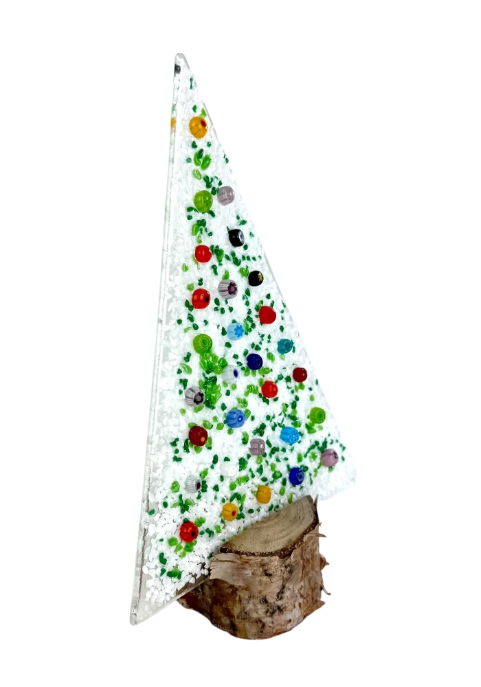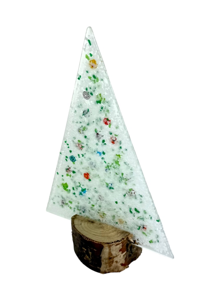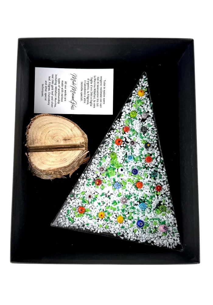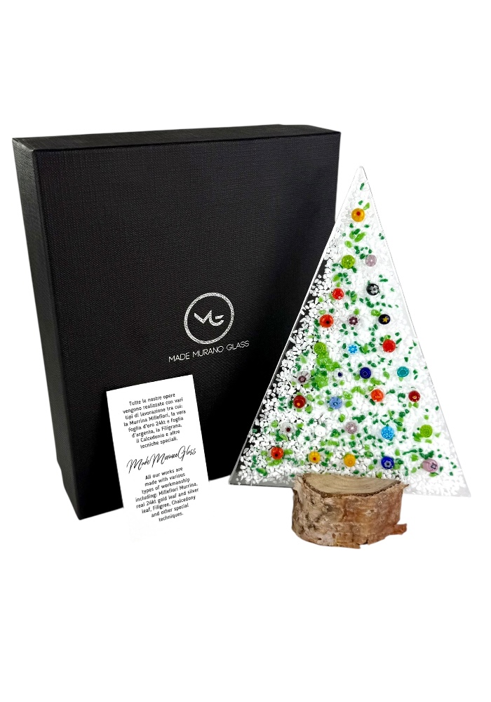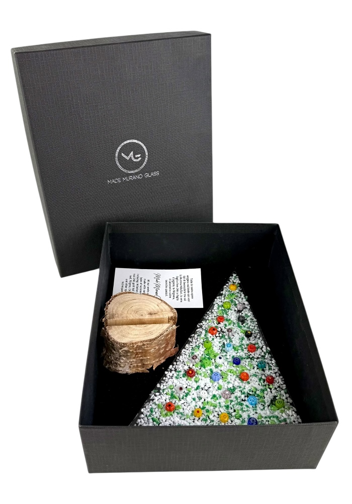 Murano glass Christmas tree with real wood base, supplied with a personalized box.