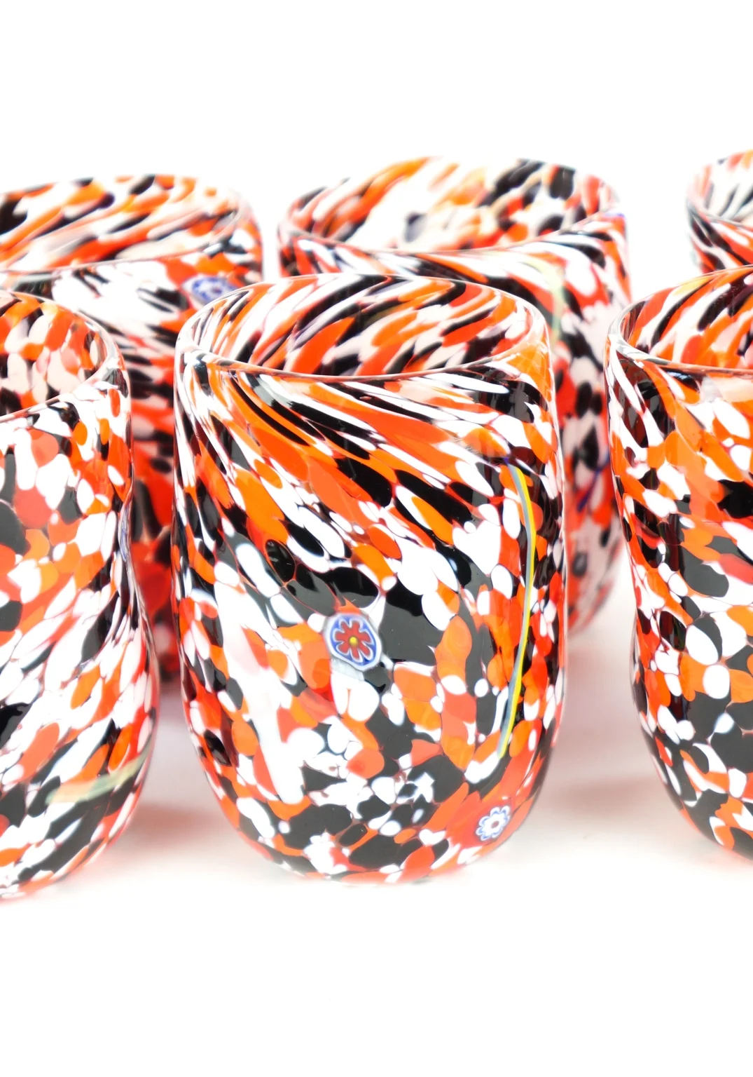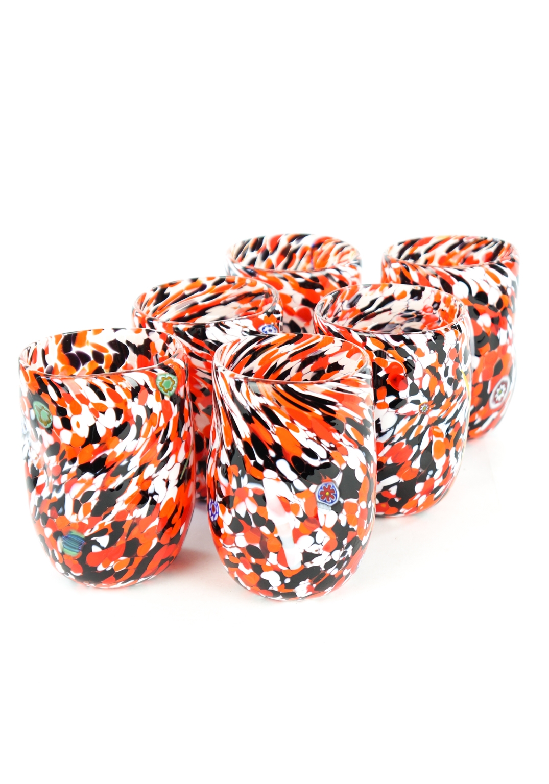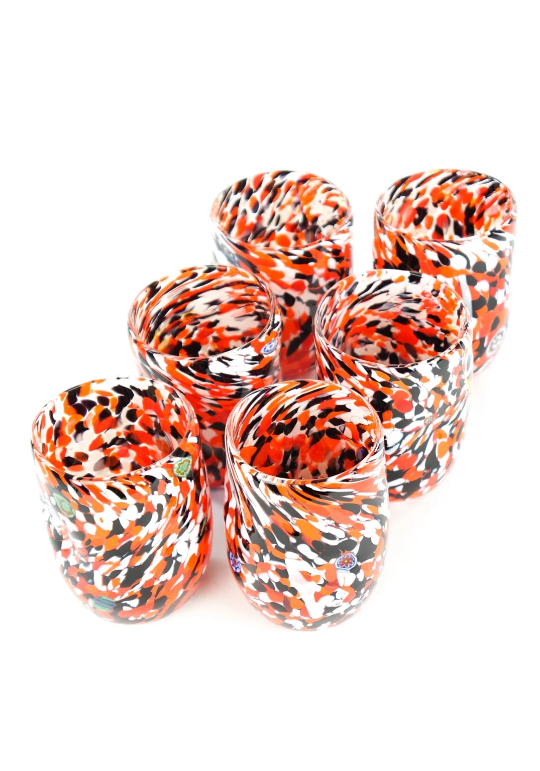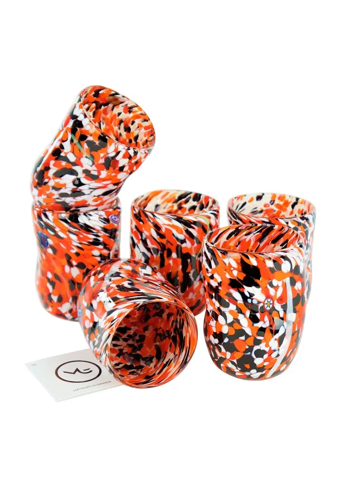 The set includes Six Murano Glass Tumblers with decoration in “Mace” color Red, White, Black, and Murrina.