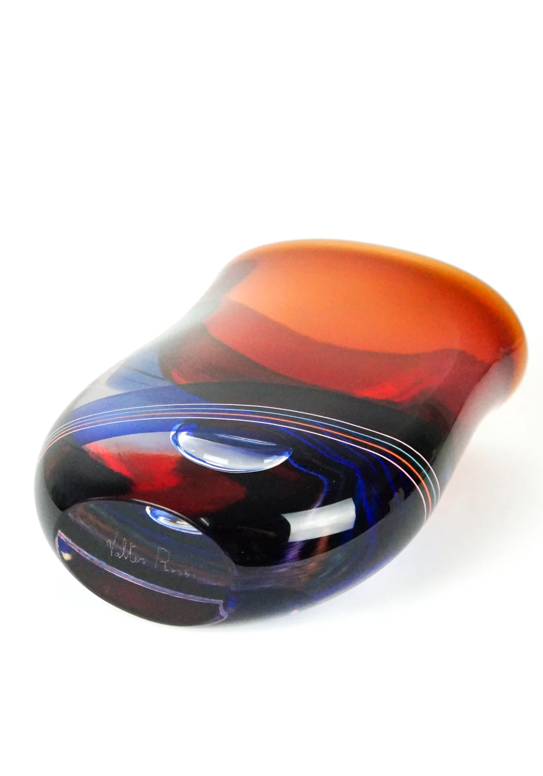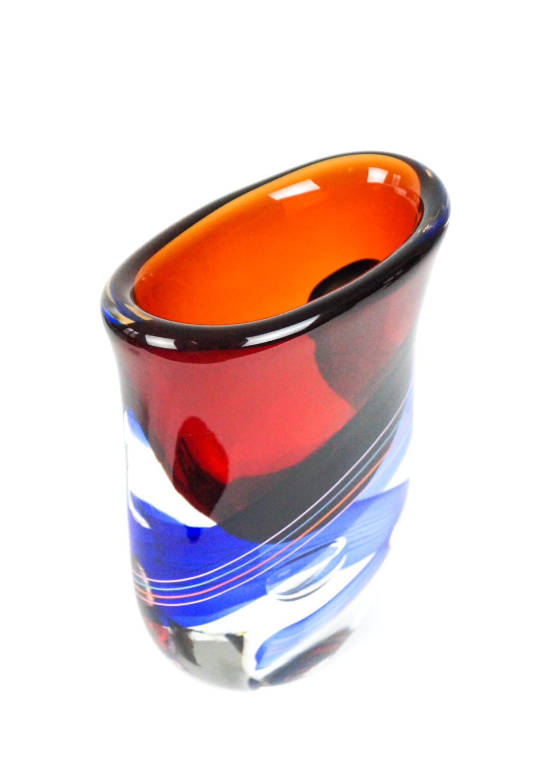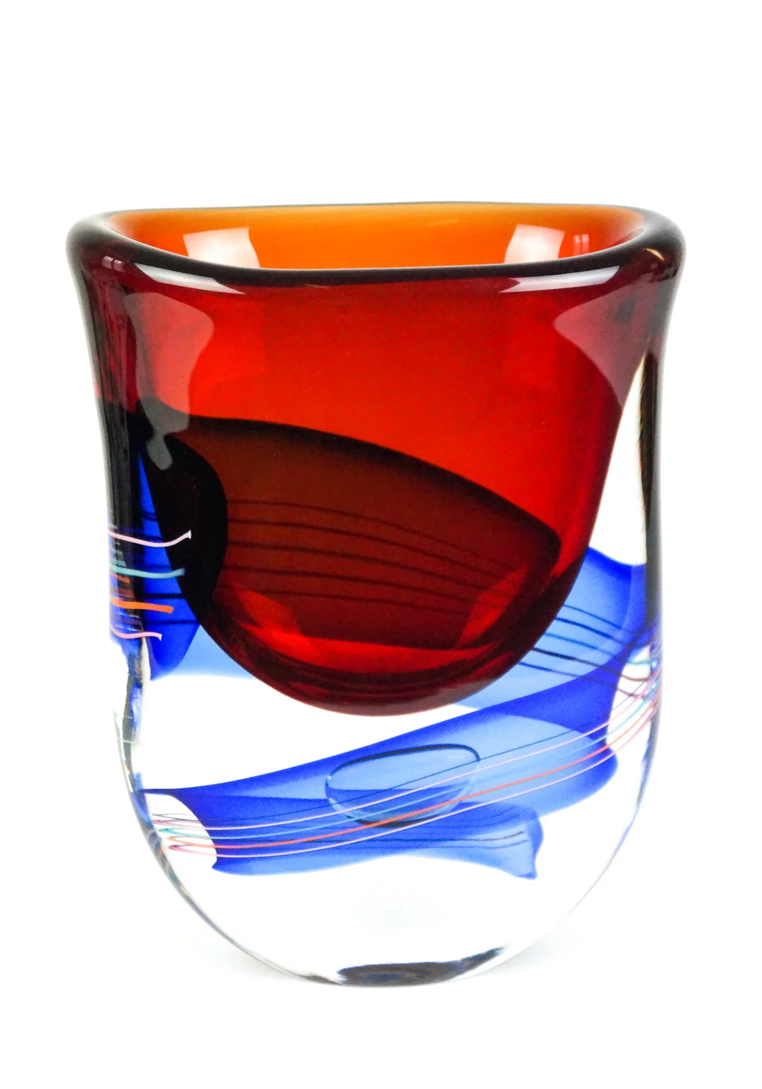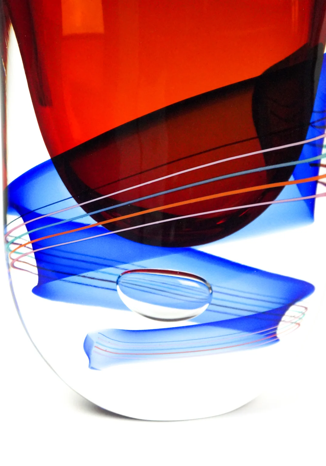 Exclusive Murano blown glass vase entirely handmade in thick, transparent crystal, red, blue color with colored filigree threads.