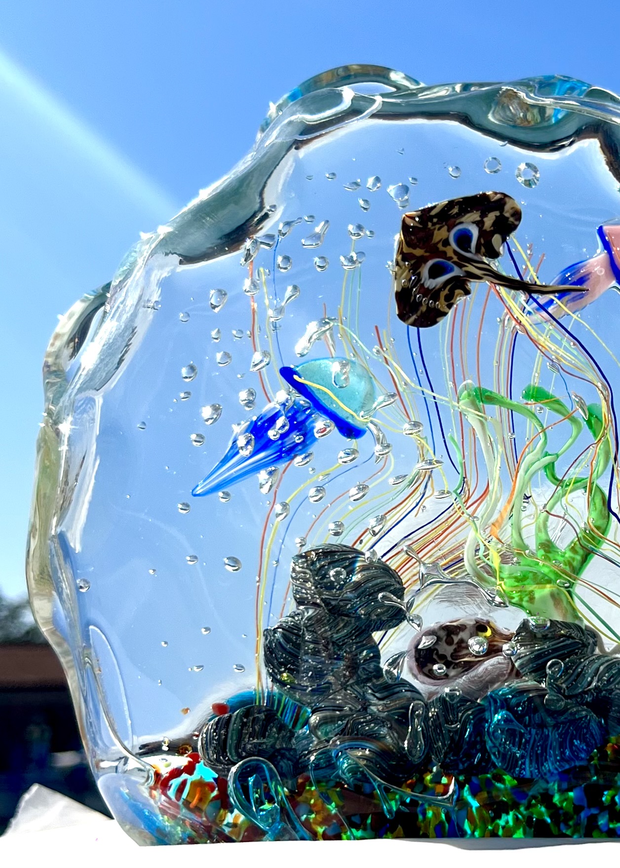 Half-moon aquarium sculpture in Murano glass.