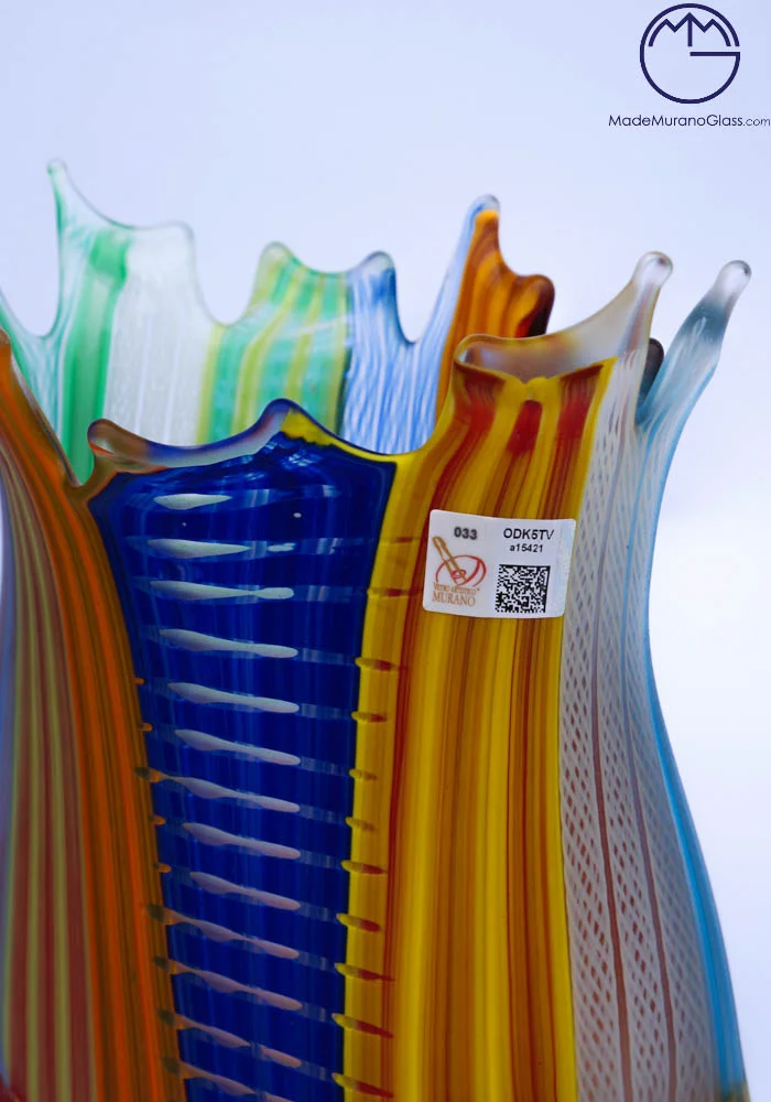 The vibrant colors, which surround this blown Murano glass vase, remember the Carnival period. Venice and its islands are colored by a lot of colors. To complete its uniqueness, this work is signed with a cold engraving by Murano glassmaker Master Mario Costantini. The vase has the label Marchio Vetro Artistico®
