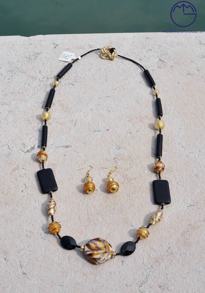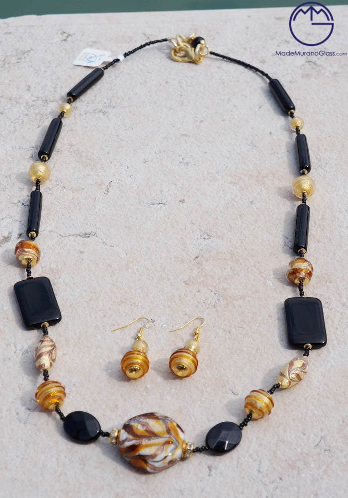 Wonderful necklace and earrings in Murano glass, completely handmade with coloured beads covered with gold leaf 24 carats and “avventurina“. Venetian glass jewellery are carried out with “lume” technique. Elegant, class and sophistication are suitable words for this amazing Murano collection jewellery.