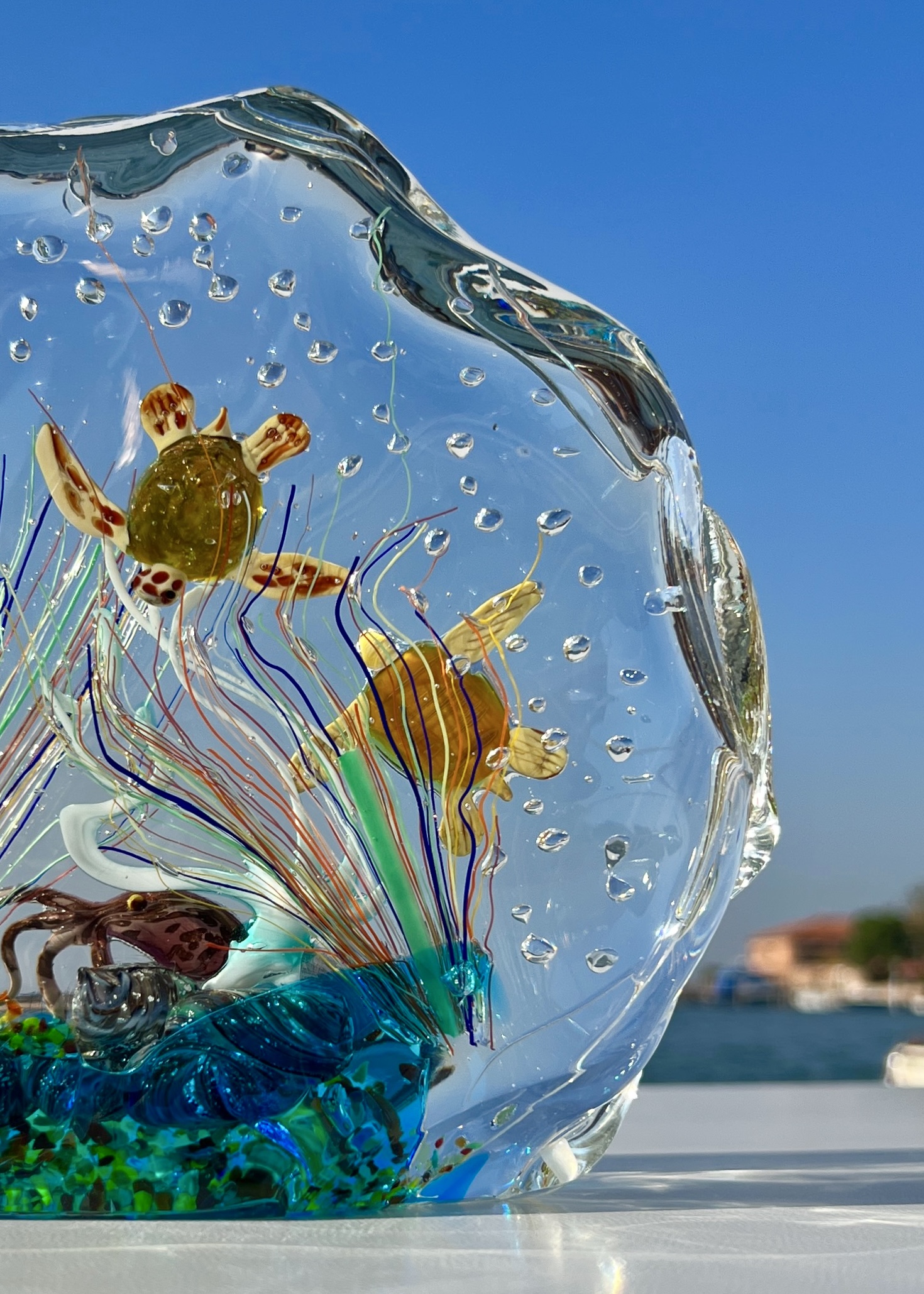 Half-moon aquarium sculpture in Murano glass.