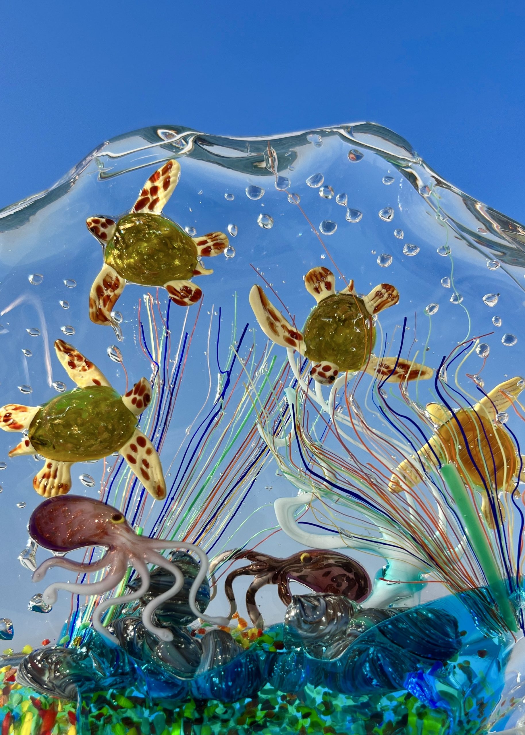 The sculpture contains 4 sea turtles, 2 octopuses, 1 sea anemone, 1 cliff and various marine decorations.