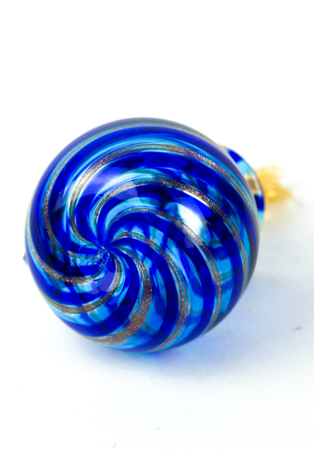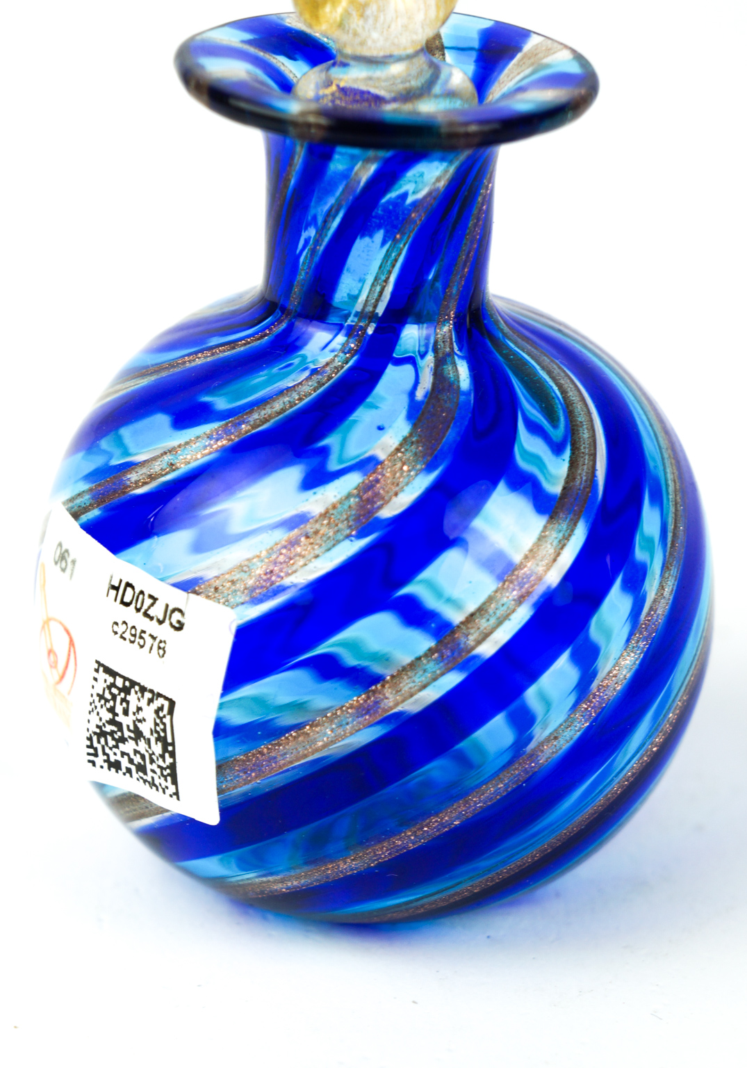 Elegant venetian blown glass that represents a bottle in the shape of round with “Canna” (pipe) blue and gold leaf 24 carats.