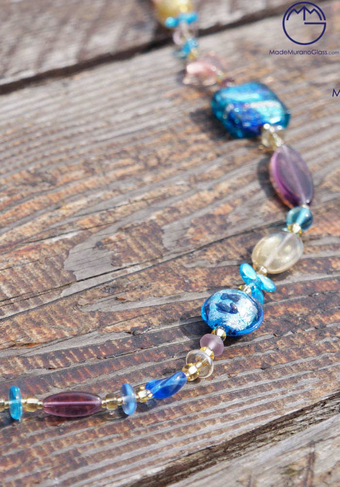 Wonderful necklace and earrings in Murano glass, completely handmade with coloured beads. Venetian glass jewellery are carried out with “lume” technique. Elegant, class and sophistication are suitable words for this amazing Murano collection jewellery.