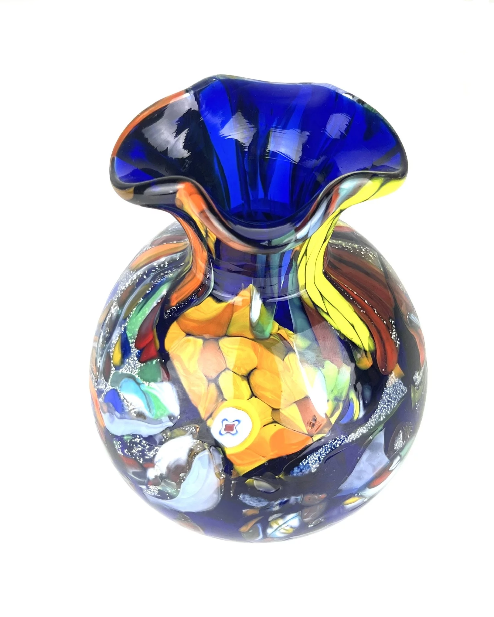 Murano glass vase with assorted decorations in filigree, aventurine, murrina millefiori, “mace” and real silver leaf.
