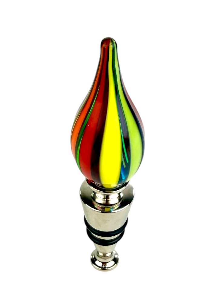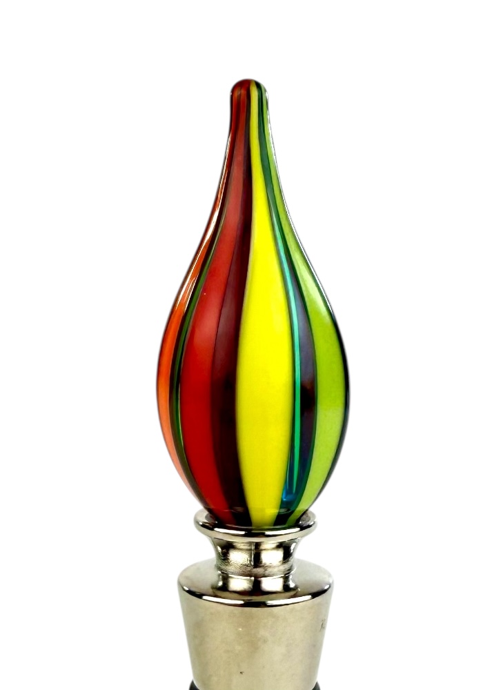 Murano glass bottle stopper with blue, light blue, green, amber, yellow, orange and red kanne.