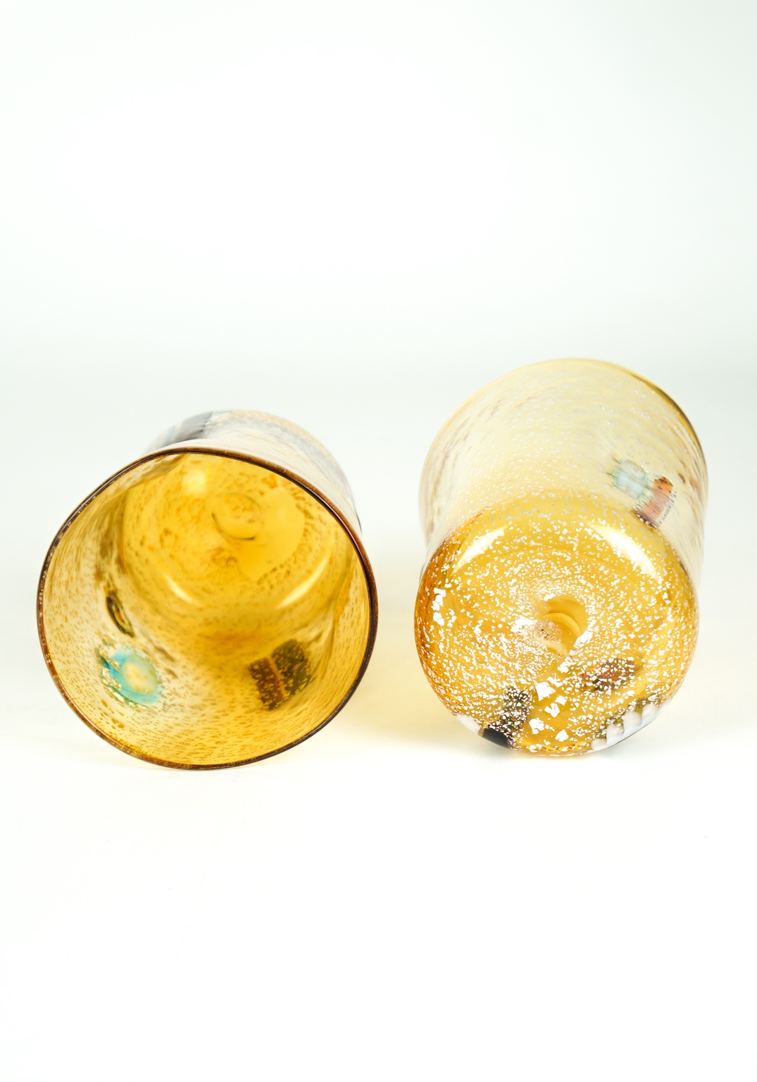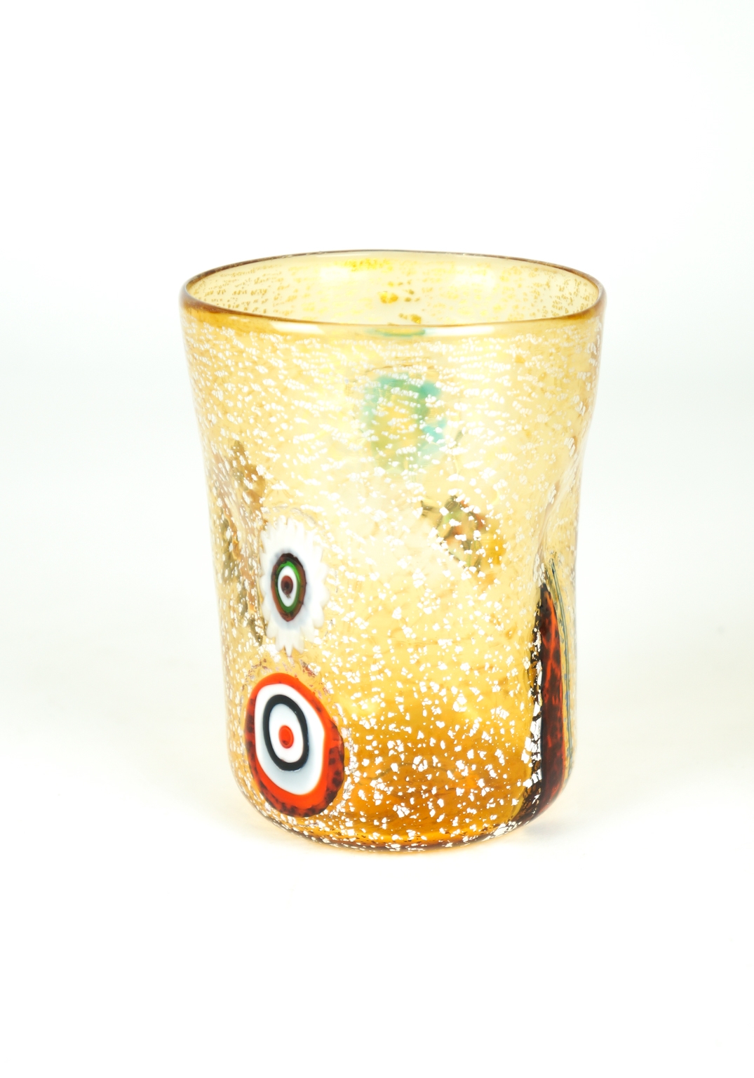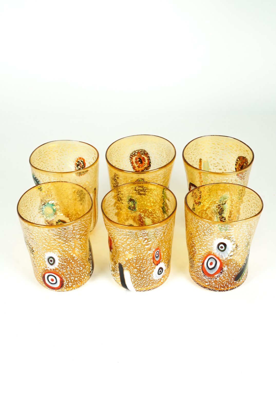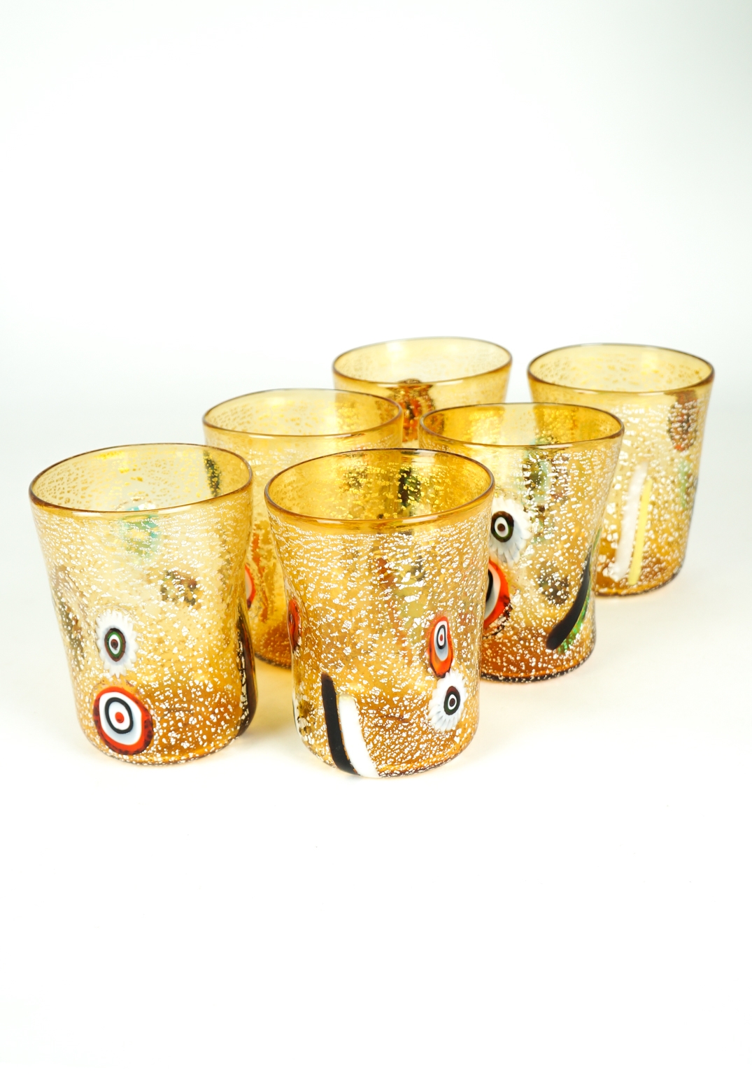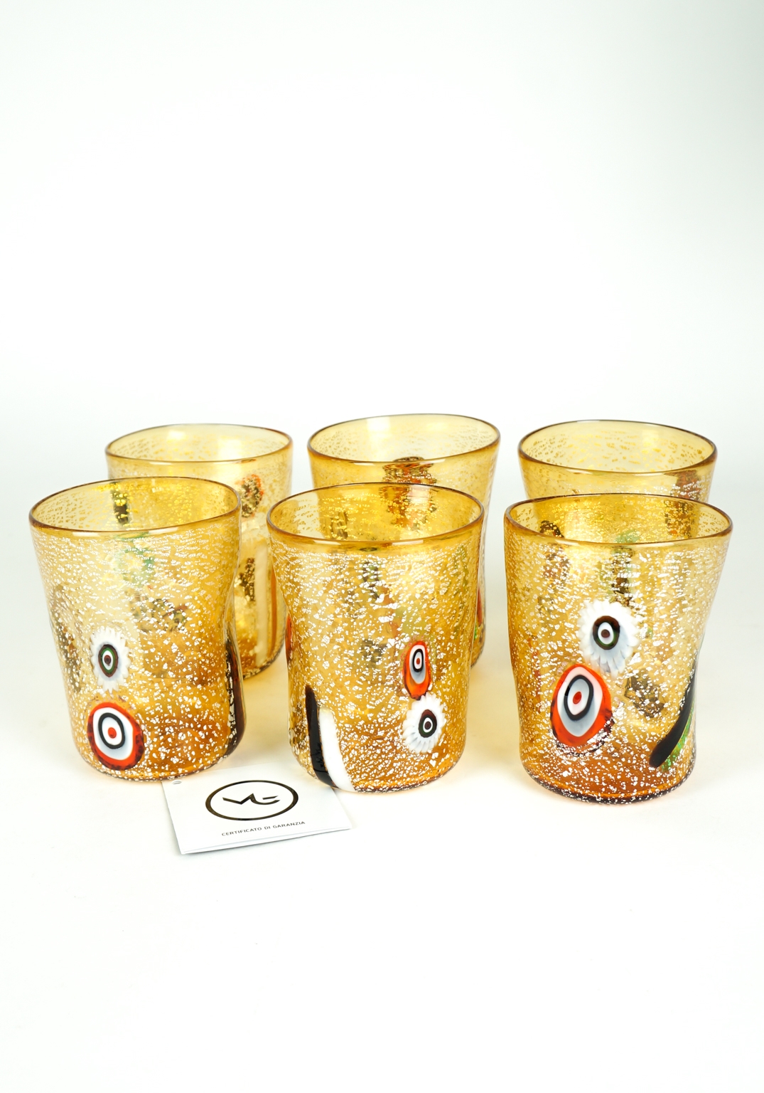 The set includes Six Murano Glass Tumblers with decoration in murrina Millefiori and real silver leaf.