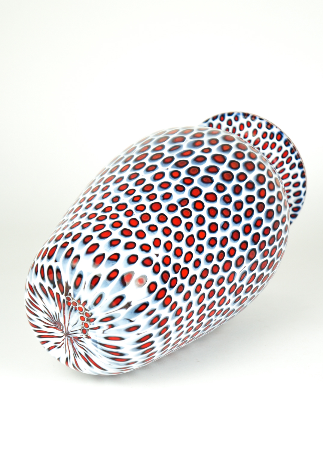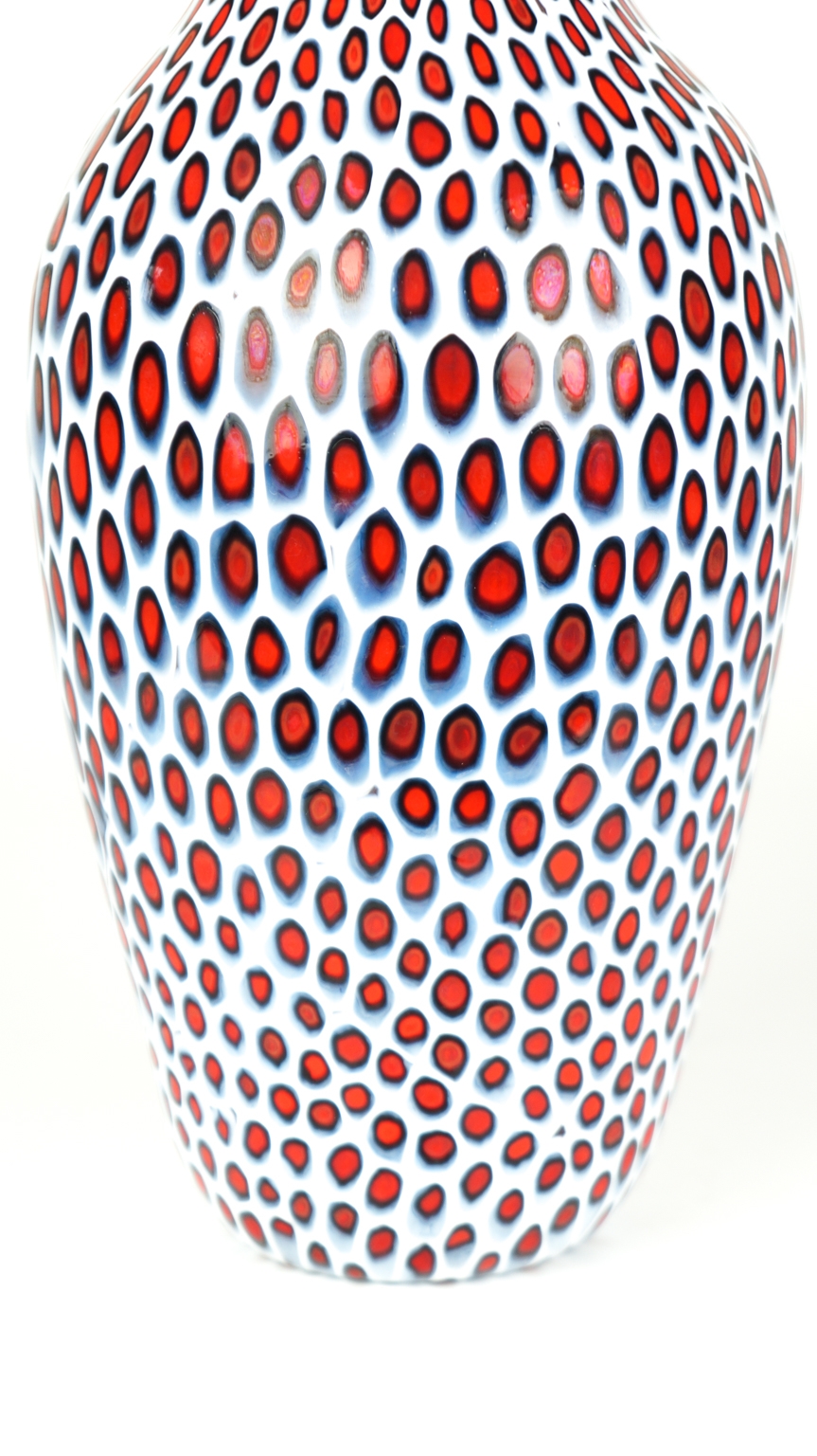 A surprising Murano blown glass vase with Millefiori murrina processing, white color, black and red.