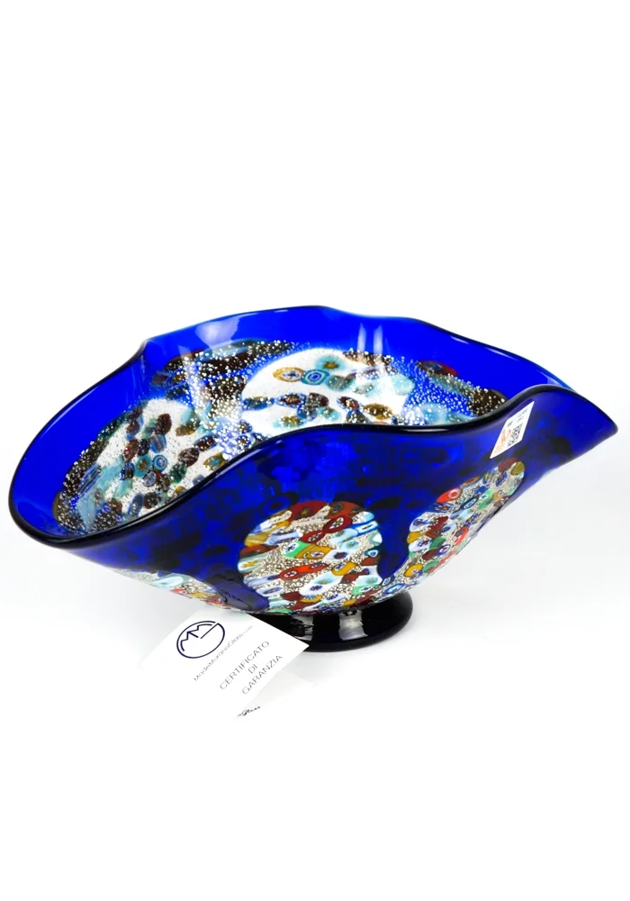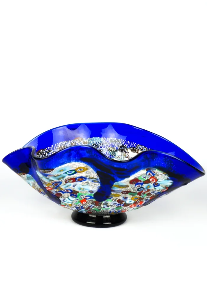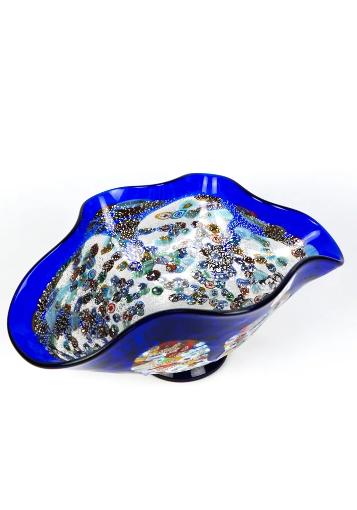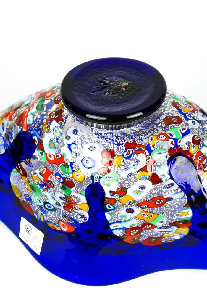 Liberty is a Bowl in blown blue glass with decorations in Murrina Millefiori and silver leaf.