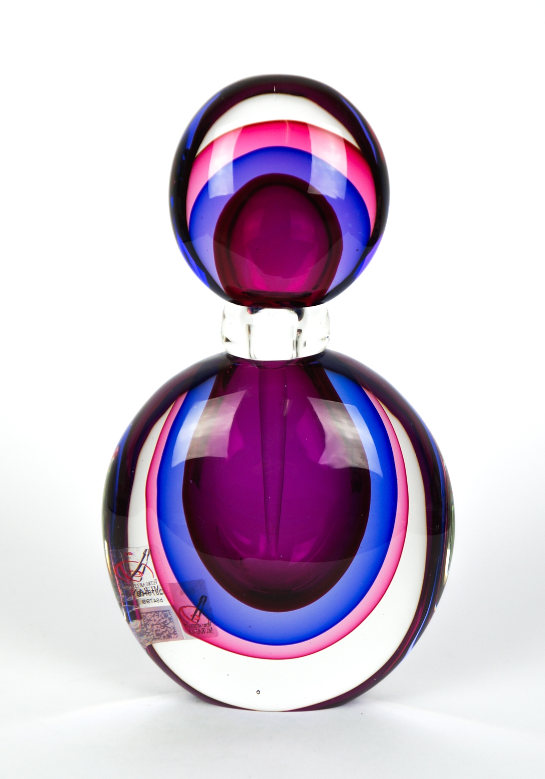Blown Murano glass bottle, entirely handmade with transparent, rubin, pink and blue crystal “Sommerso” processing.