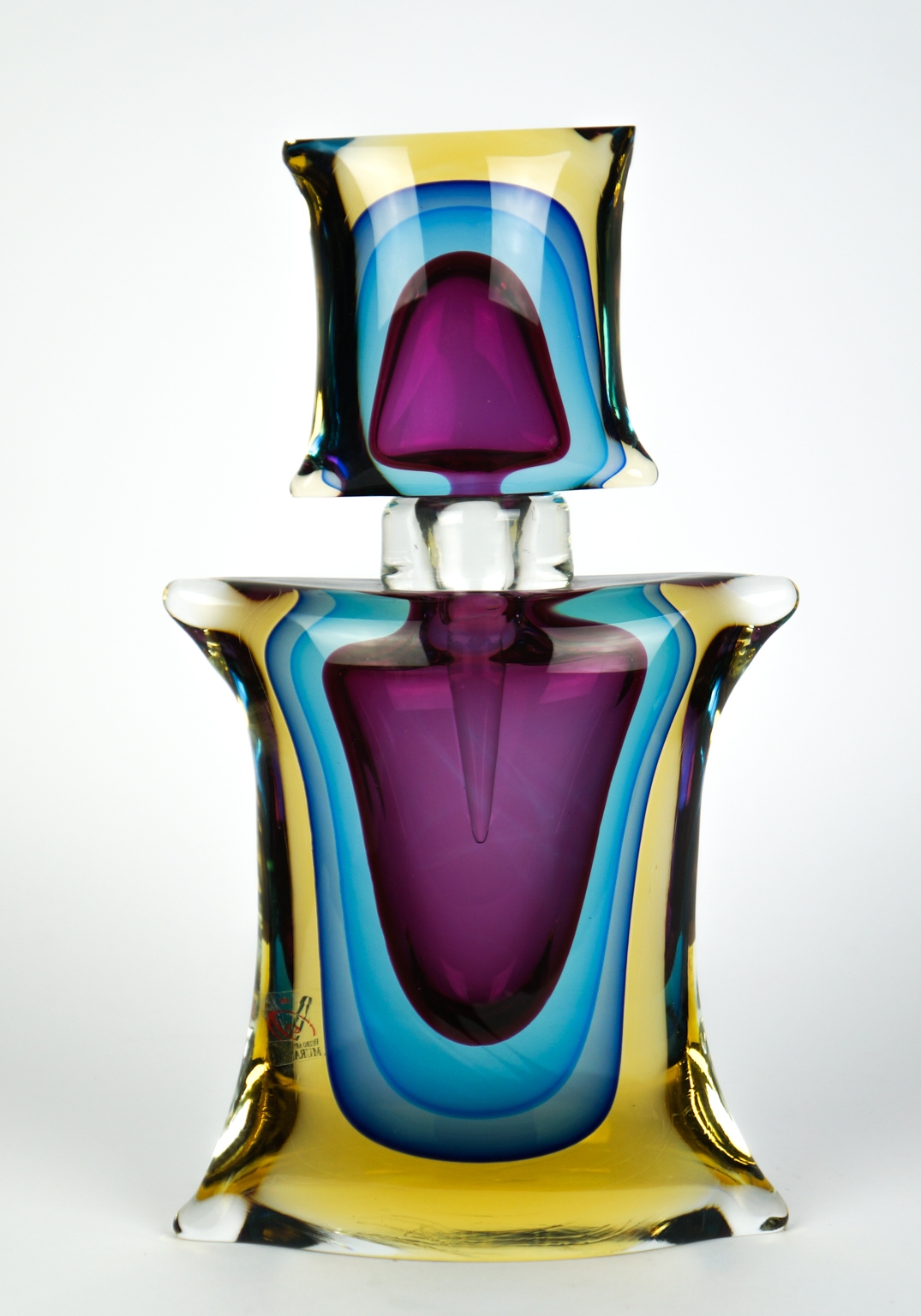 Blown Murano glass bottle, entirely handmade with transparent, aquamarine, blue, rubin and amber crystal “Sommerso” processing.