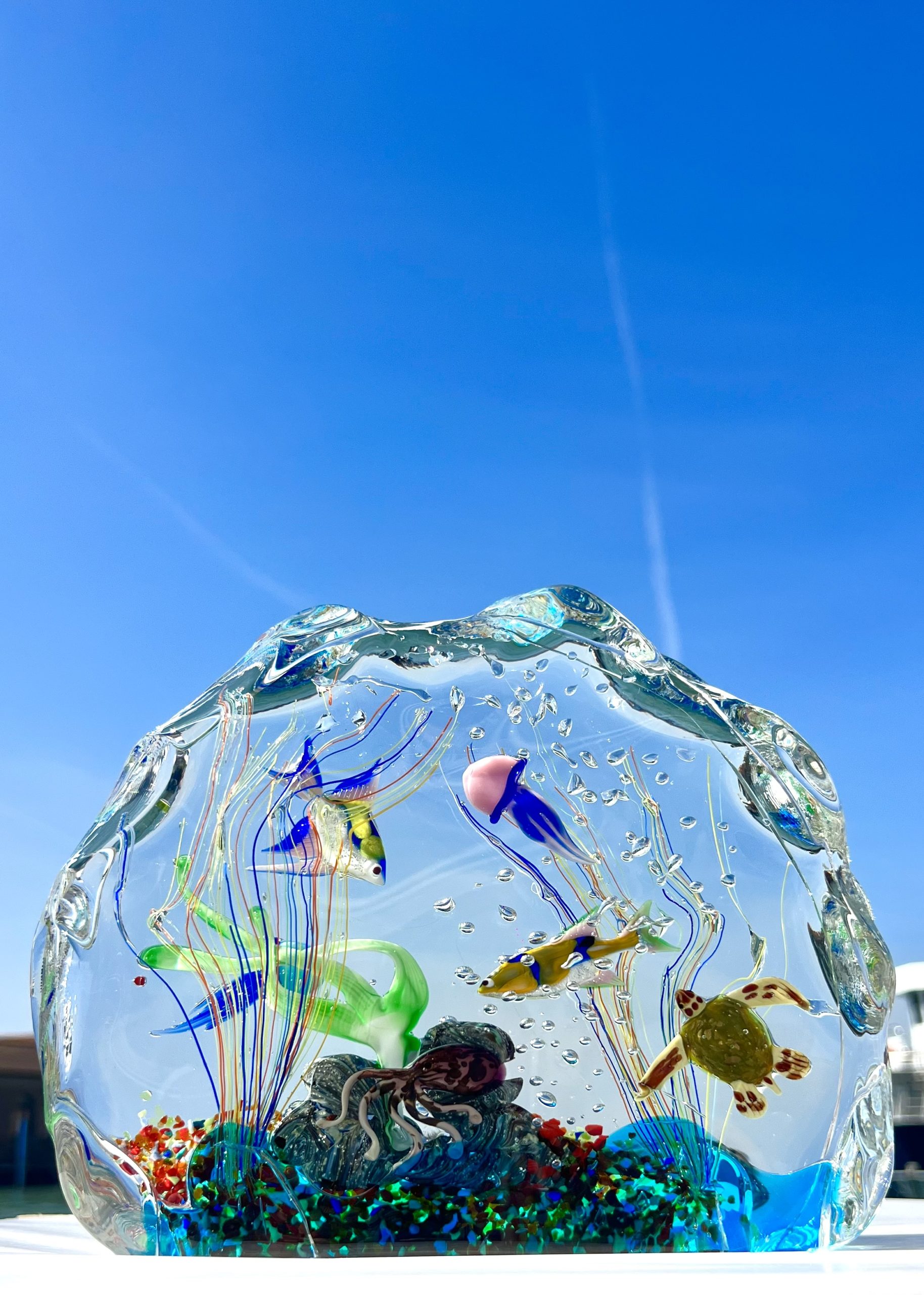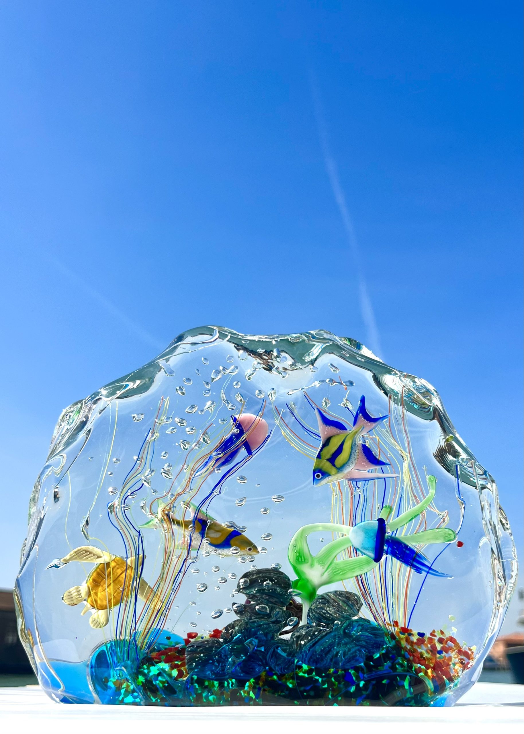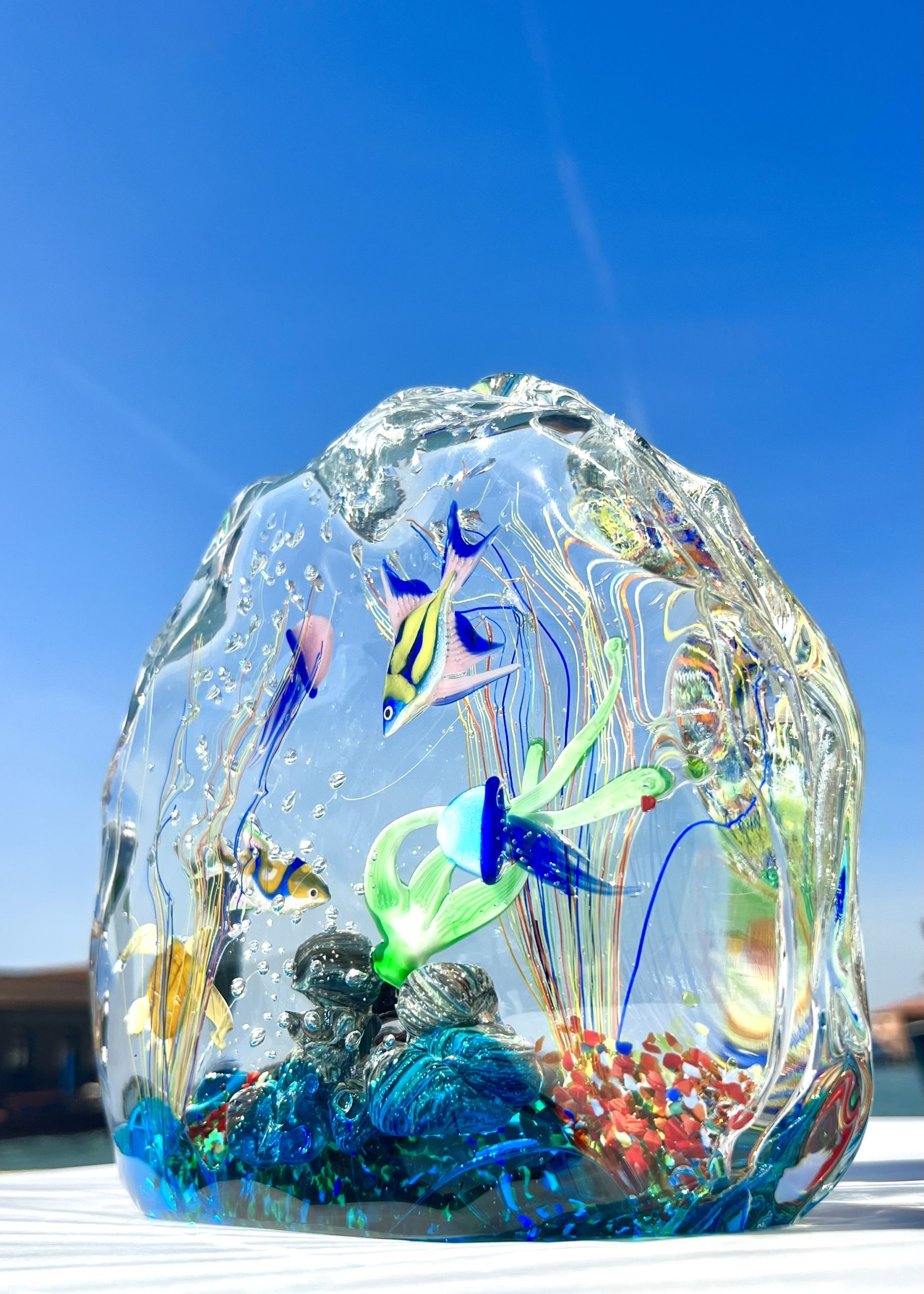 Half-moon aquarium sculpture in Murano glass.