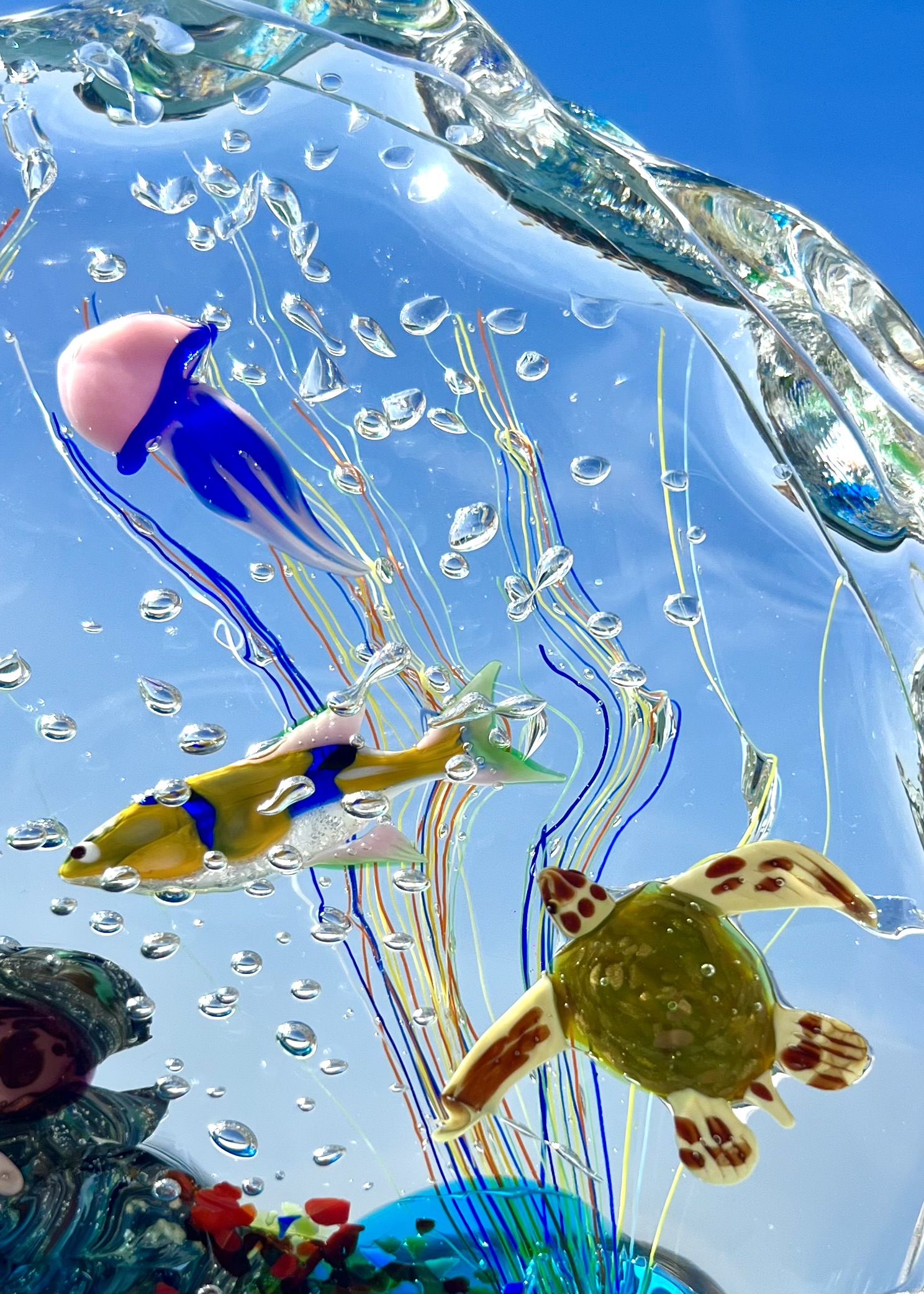 The sculpture contains 1 sea turtle, 1 octopus, 2 jellyfish, 2 tropical fish, 1 sea anemone, 1 cliff and various marine decorations.