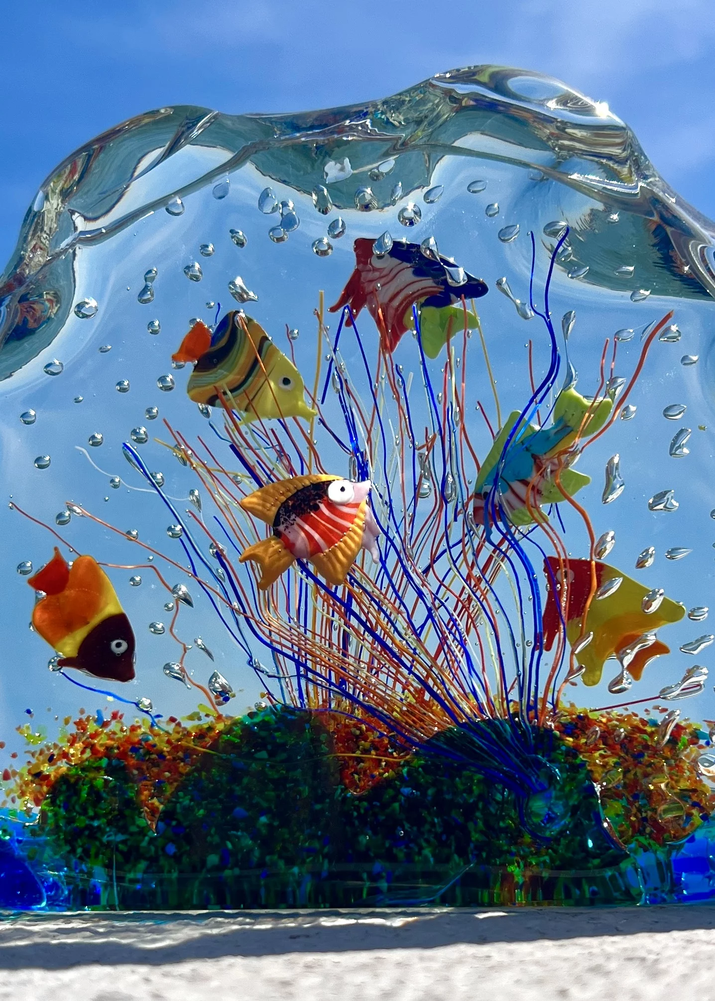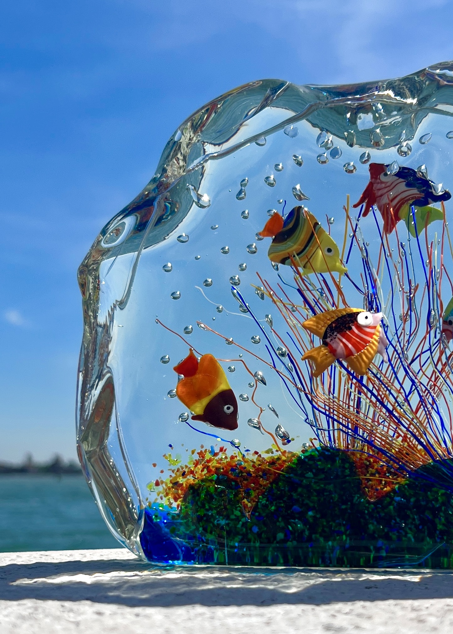 Working of “Lume” glass and working of submerged glass, the first to make fish and the second to immerse them in a cascade of molten glass, making everything unique and inimitable.