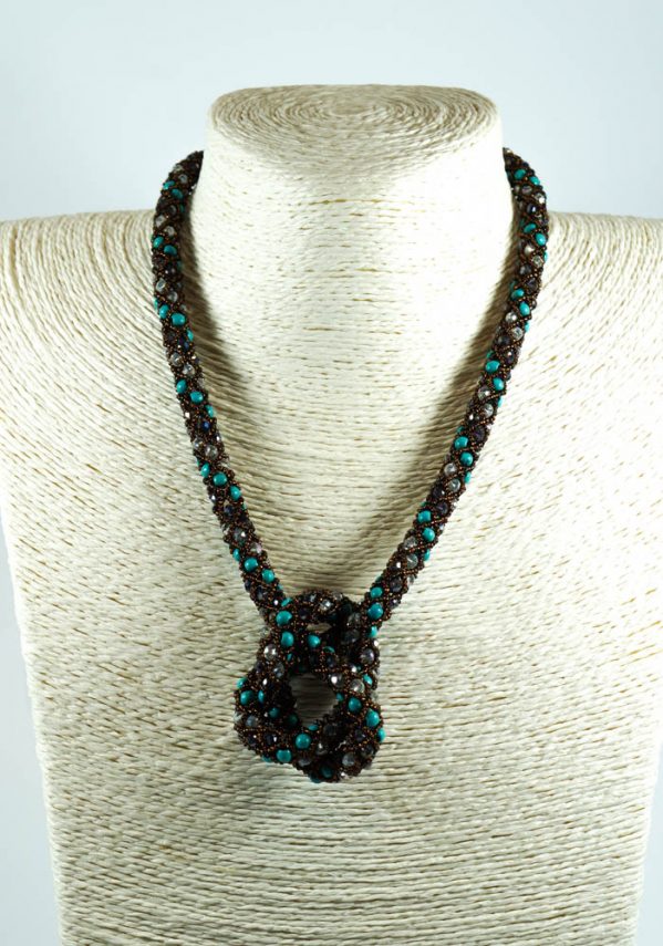 Enchanting set “Egiziana I”, consisting of necklace and earrings, entirely carried out by hand with micro beads in Murano glass turquoise colored.