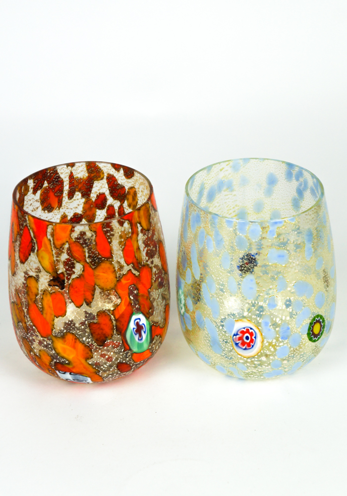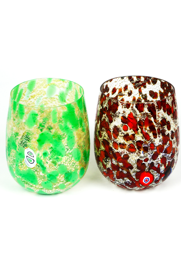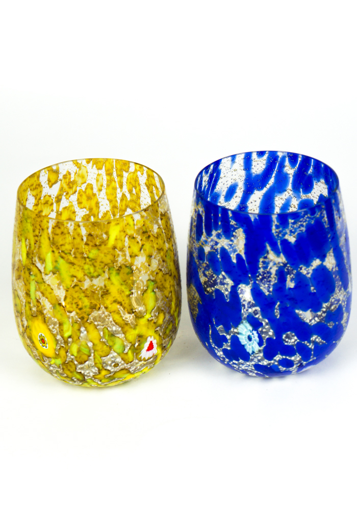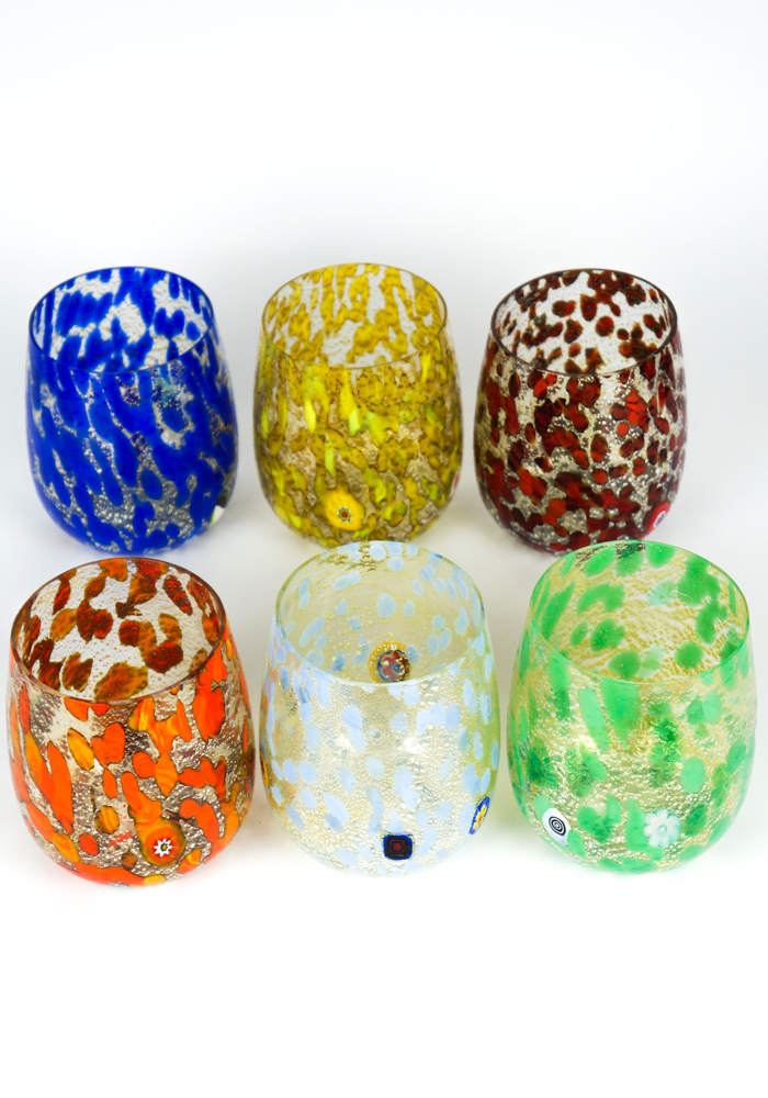 Elba is a Set composed of 6 glasses for water or wine in Murano glass entirely handmade, multicolored with details in Murrina Millefiori and silver leaf. This Set is a combination of Design and elegance, every single detail is worked with great care and precision.