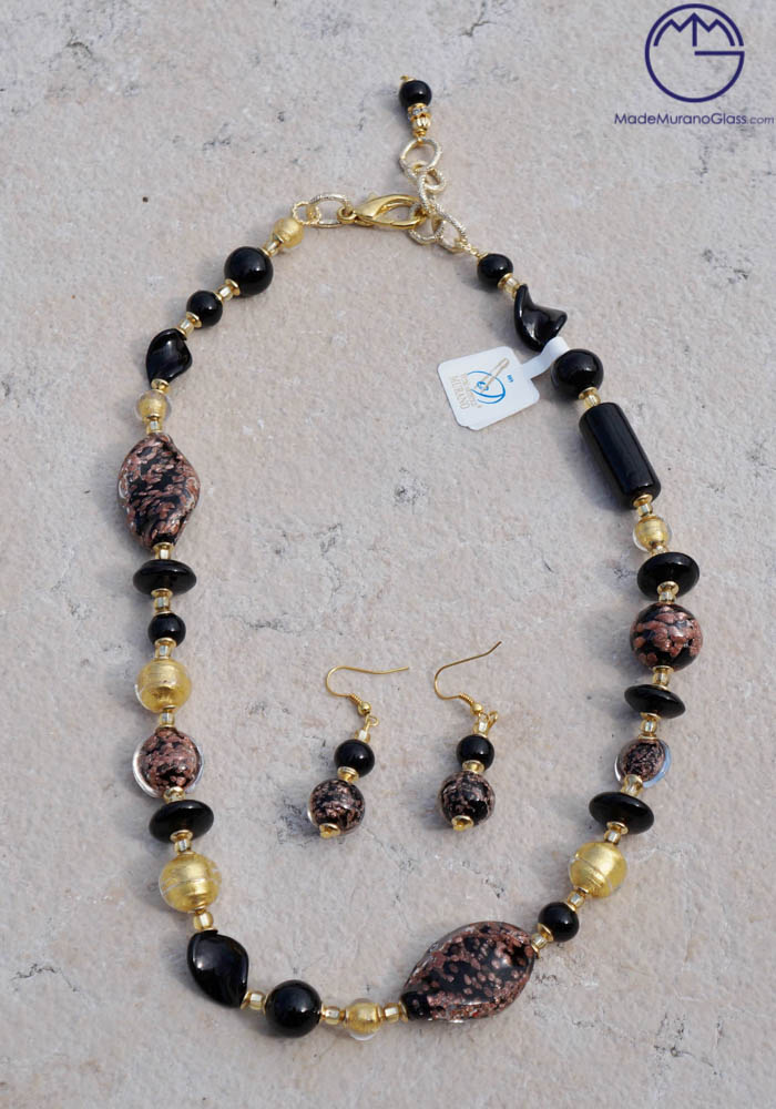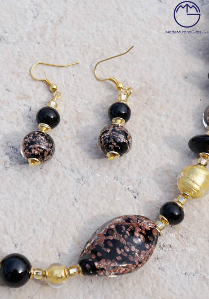 Wonderful necklace and earrings in Murano glass, completely handmade with black beads, gold 24 carats and “avventurina”.