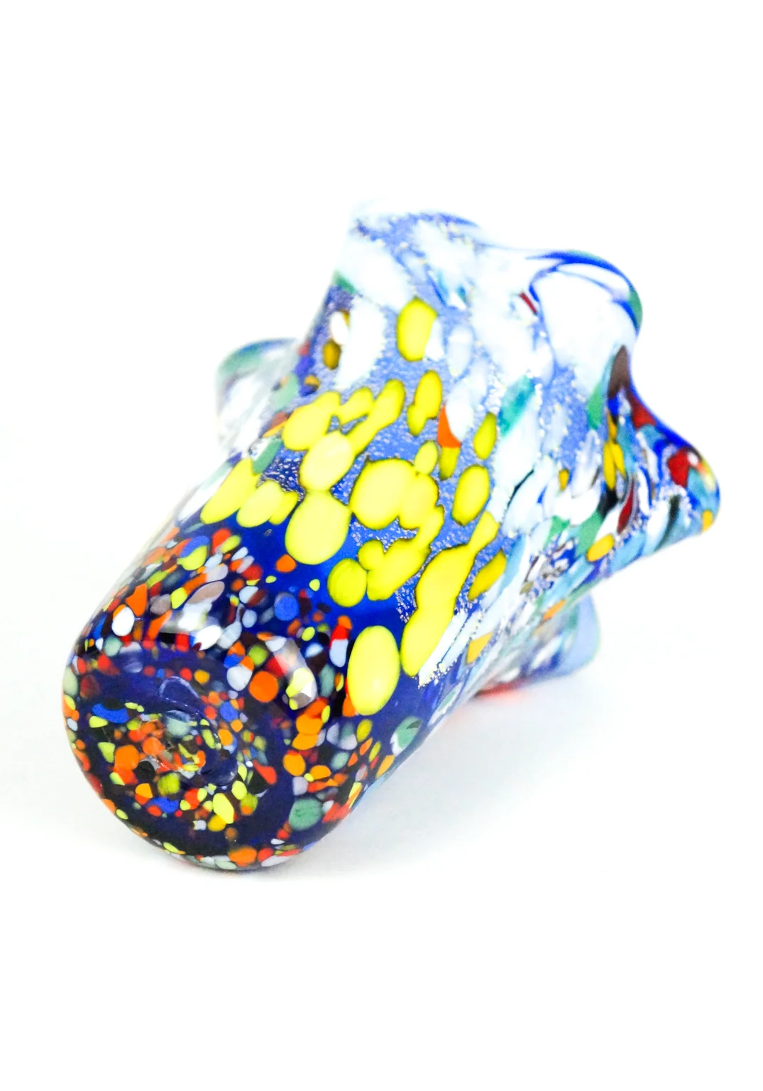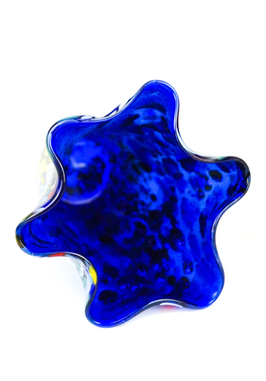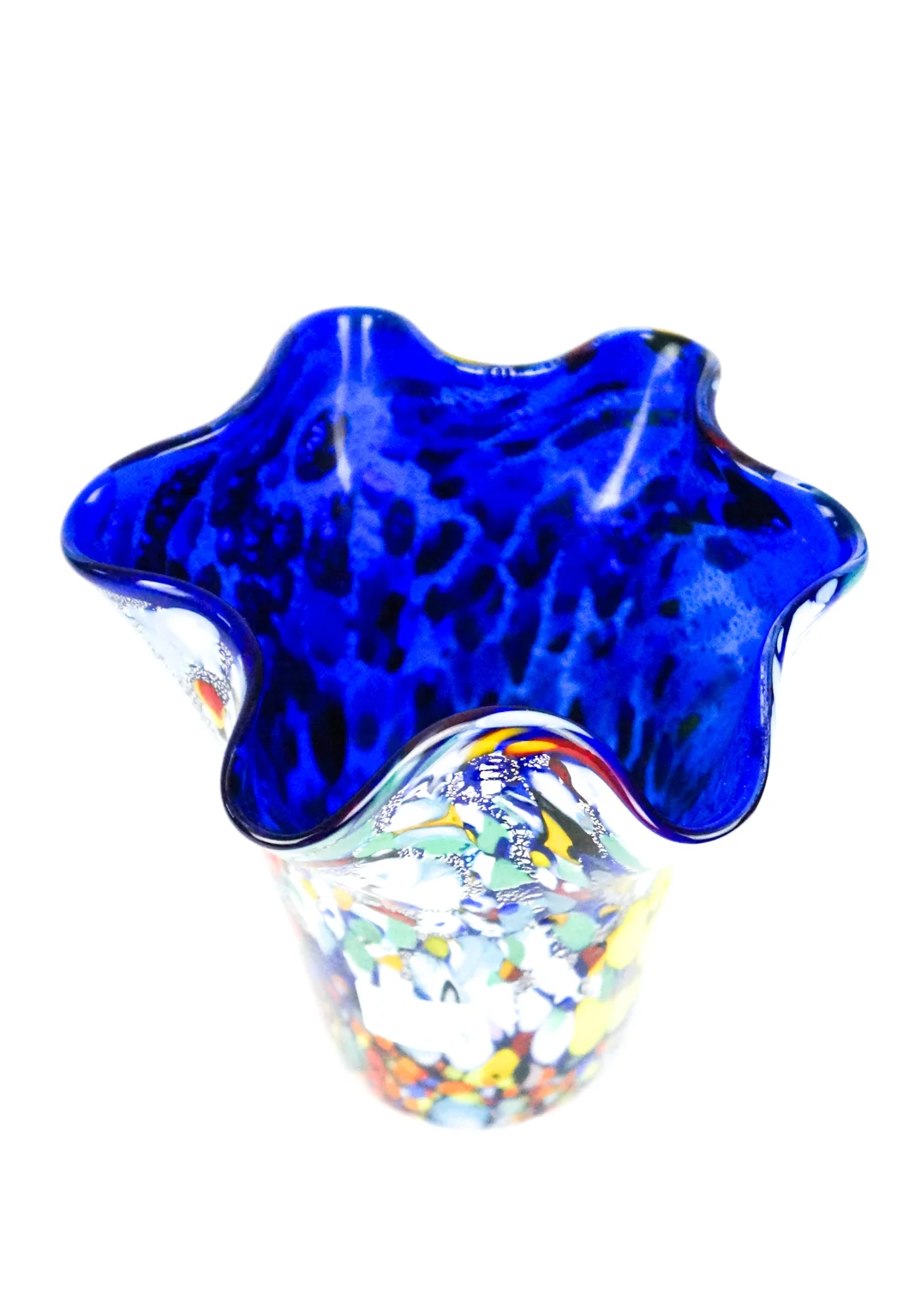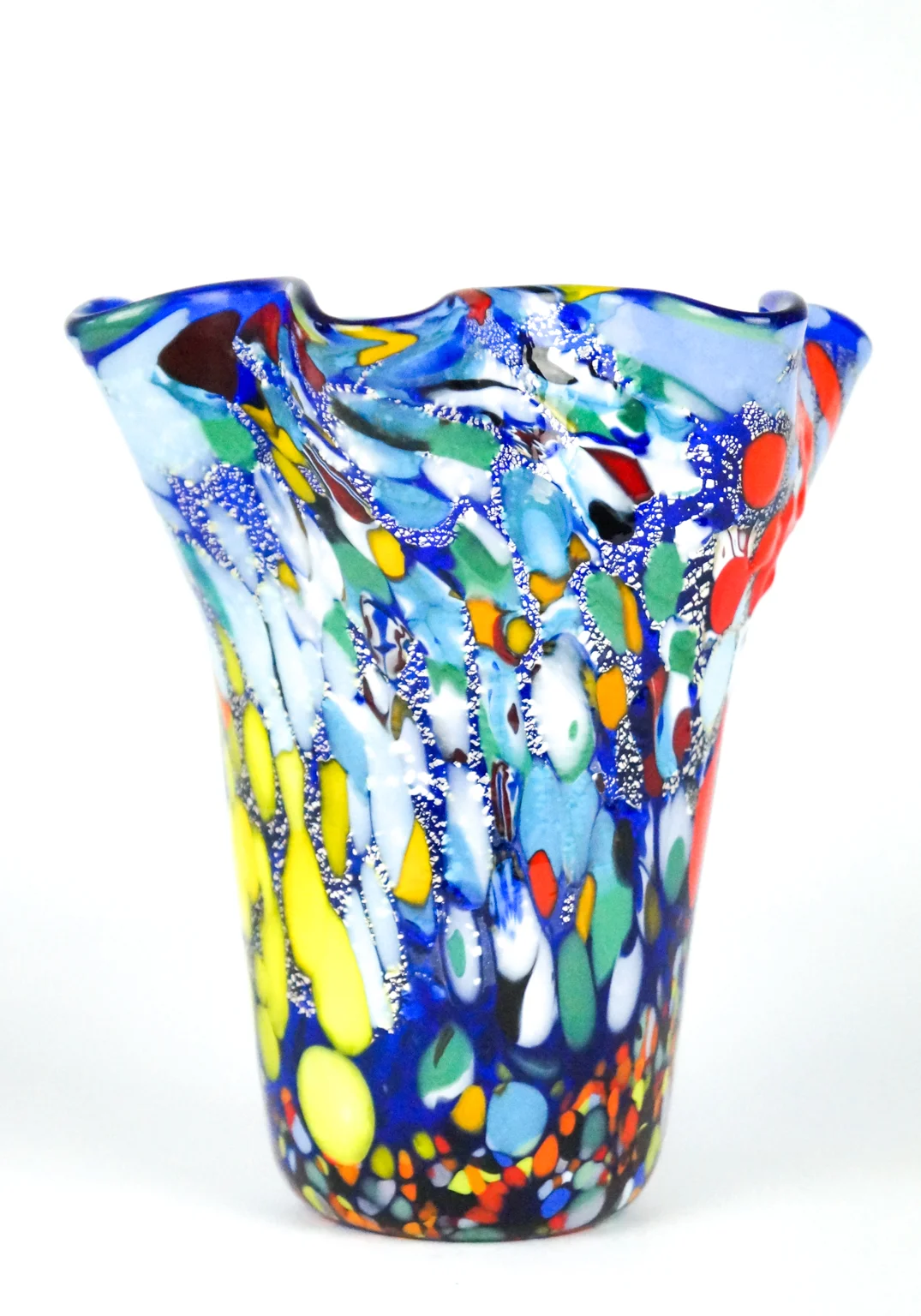 Murano blown glass blue vase with assorted filigree decorations, murrina Millefiori, “Mace” and silver leaf.