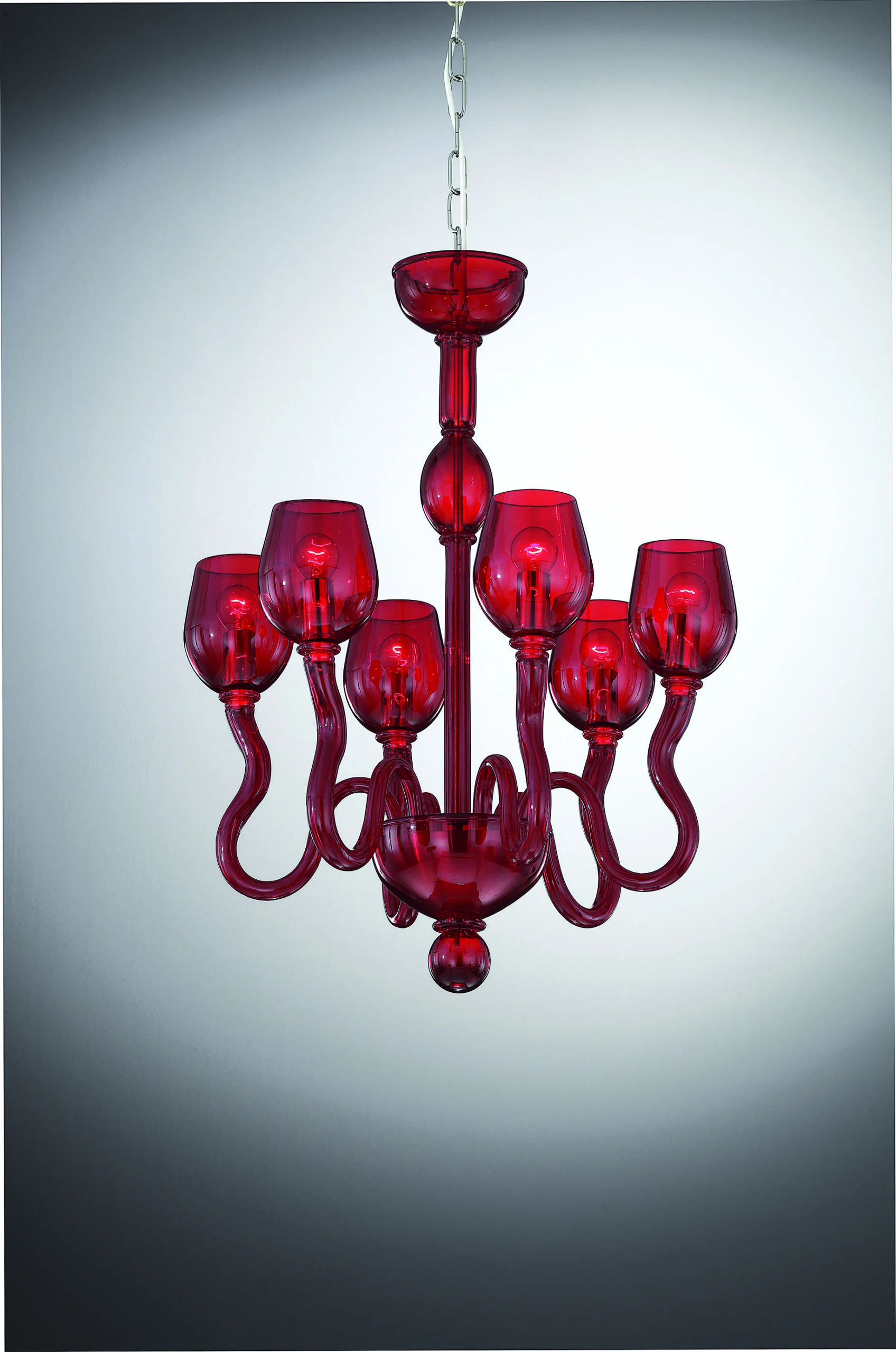 Elegant venetian glass chandelier \”Roma\” with 6 lights colour red. Completely handmade, carried out by the best Masters Murano artisans. This magnificent work will give light to any environment spreading elegance and warmth.