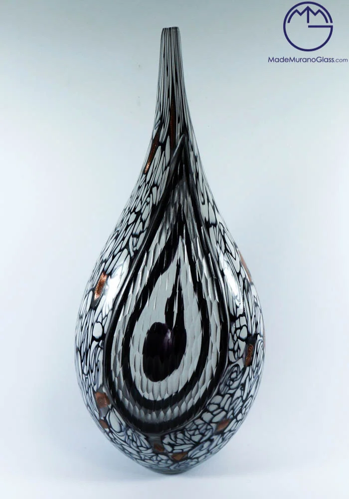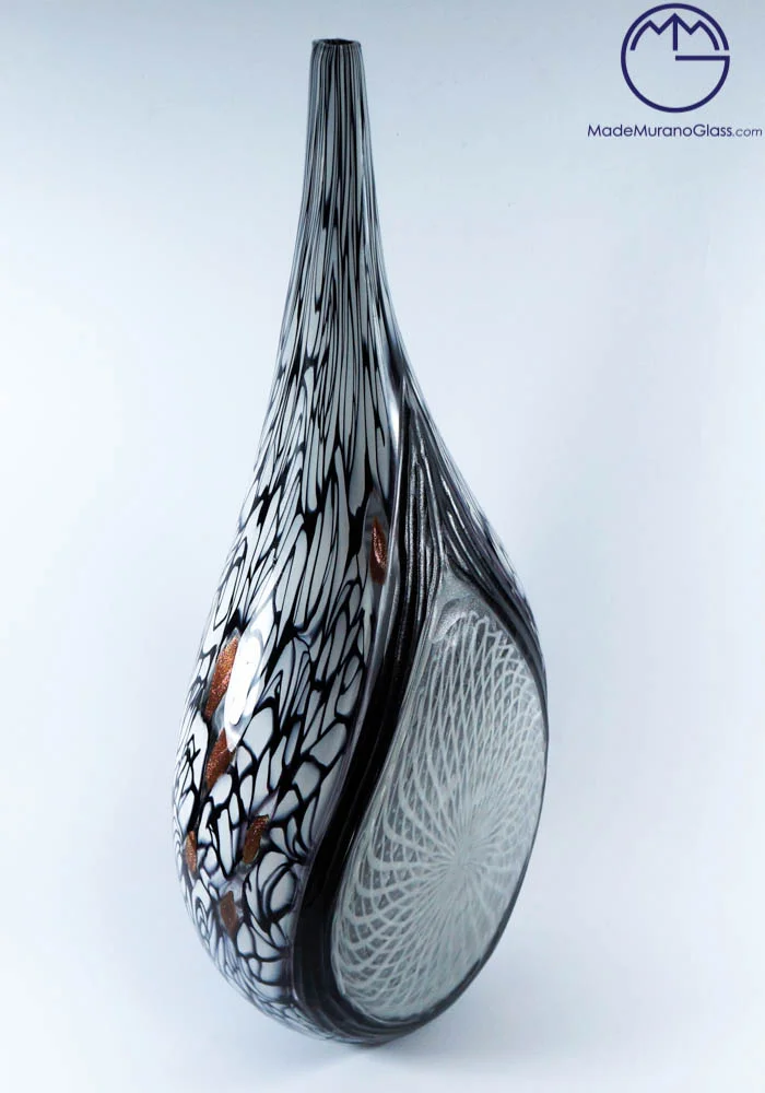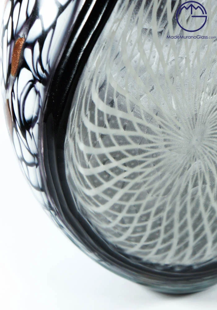 Exclusive Murano collection vases in Murano glass colours white, black, avventurina and white central web. Processing is called “engraved” by Murano artisans which engrave each piece in a long and meticulous way. Each item is produced with Murano glass and each piece is slightly different from other ones due to its handcrafted characteristic.