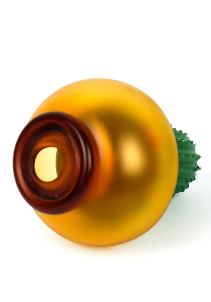 The vase of the plant is satin amber colored, the plant is green and the vase is decoded inside with “Mace” multicolored glass.