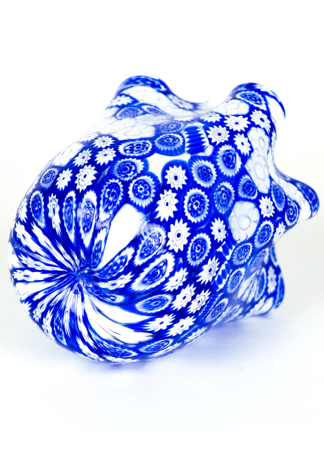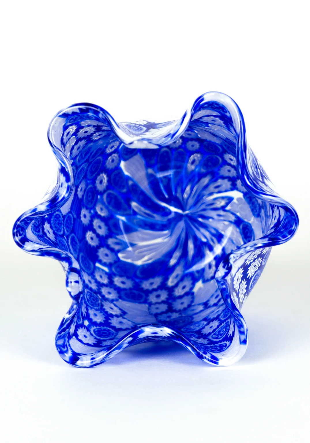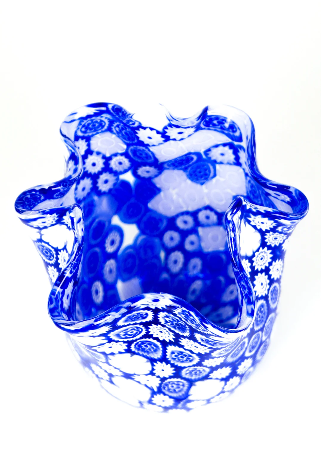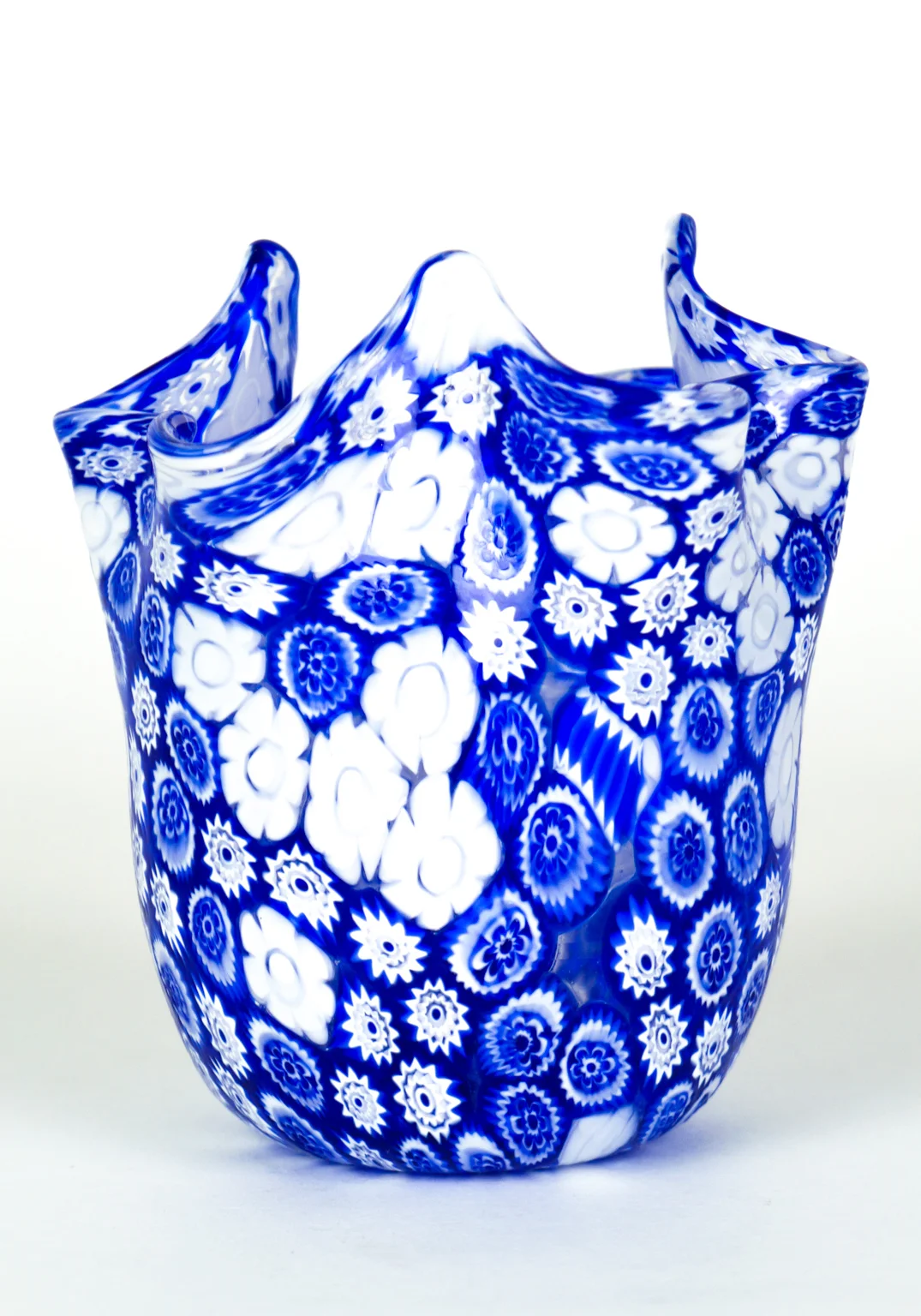 Fantastic Murano collection vases of venetian blown glass. Handkerchief-shaped with Murrine Millefiori blue and white.