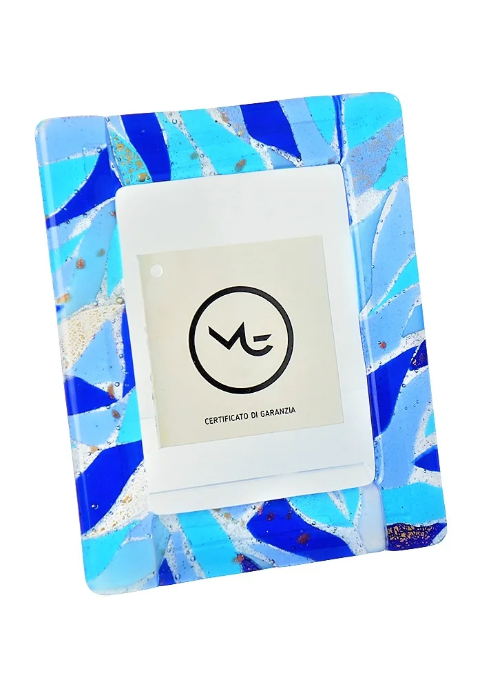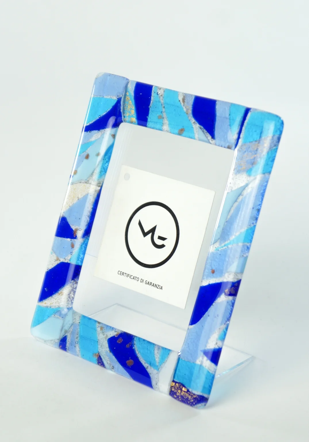Murano glass photo frame handmade with the fusion glass processing technique in the blue, light blue, white, crystal, aventurine and gold leaf 24kt flakes.
