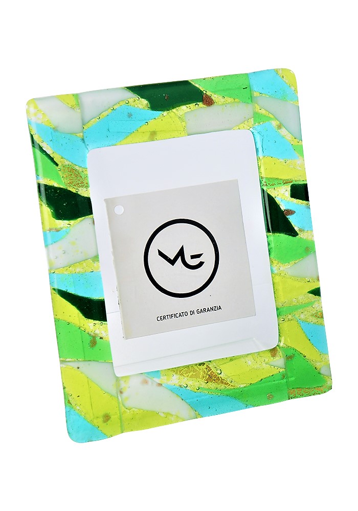 Murano glass photo frame handmade with the fusion glass processing technique in the green, emerald green, dark green, white, crystal, aventurine and gold leaf 24kt flakes.