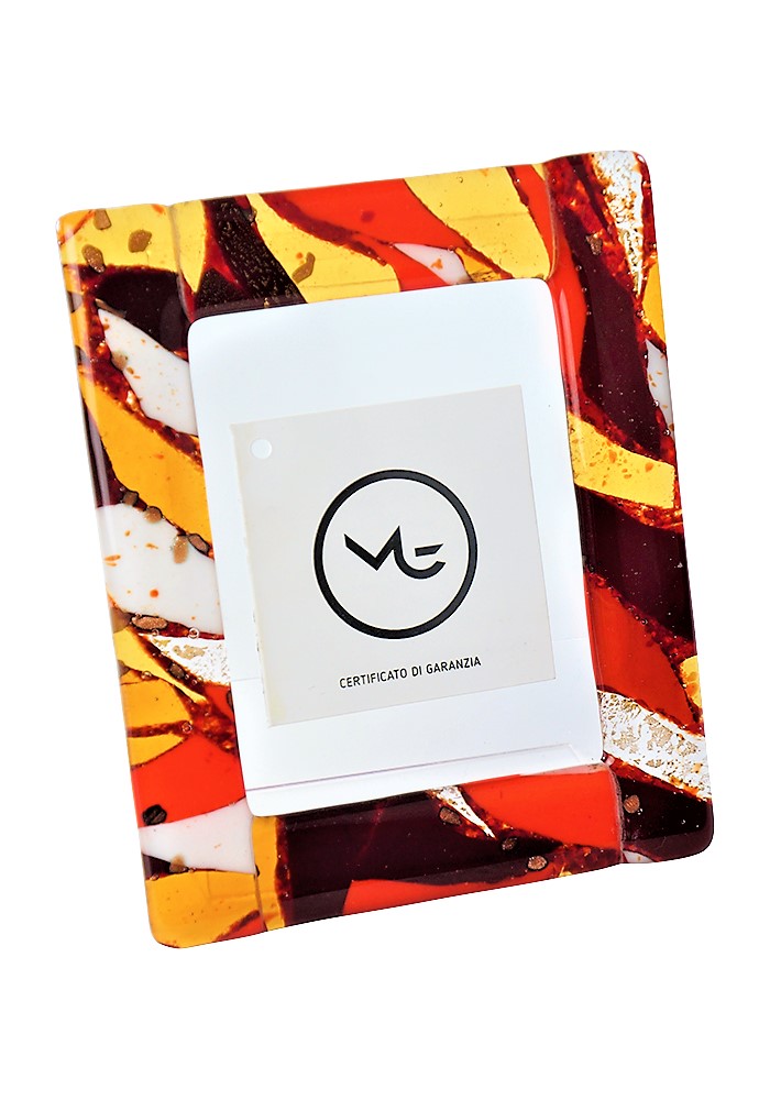 Murano glass photo frame handmade with the fusion glass processing technique in the red, orange, yellow, amber, white, crystal, aventurine and gold leaf 24kt flakes.
