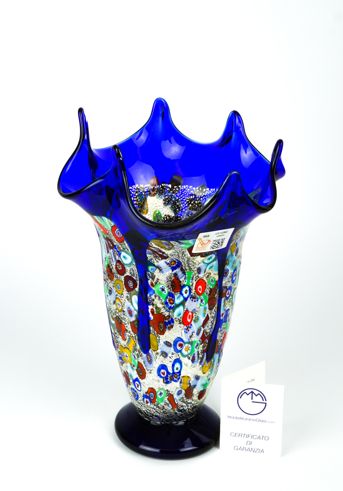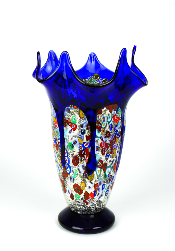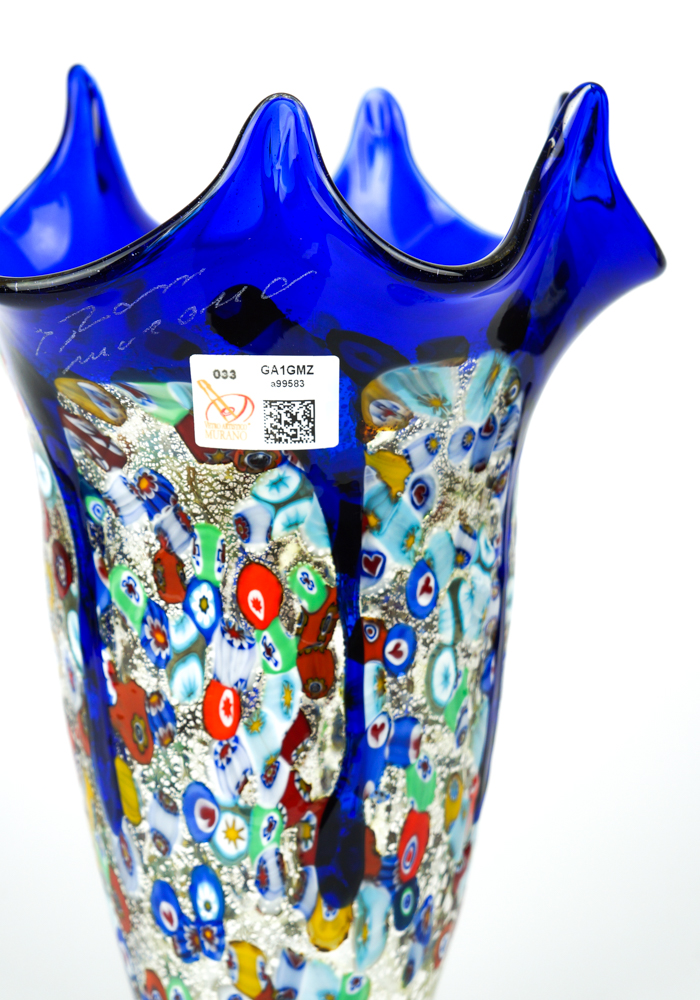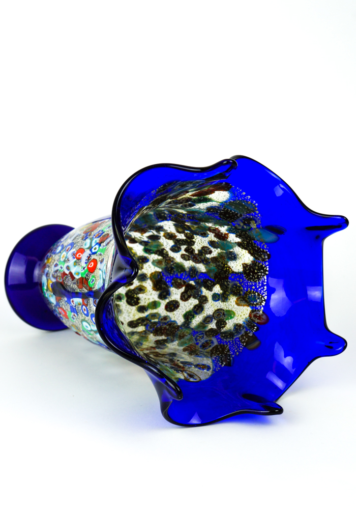 Murano blown glass vase with decorations in Murrina millefiori, silver leaf and blue drippings.