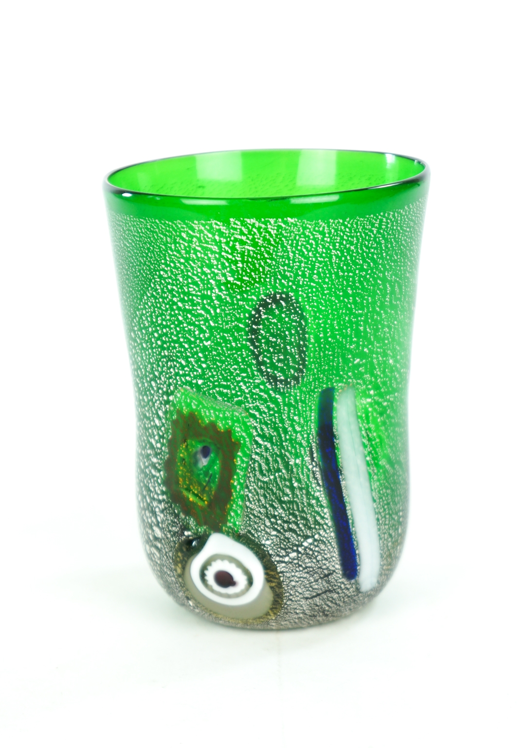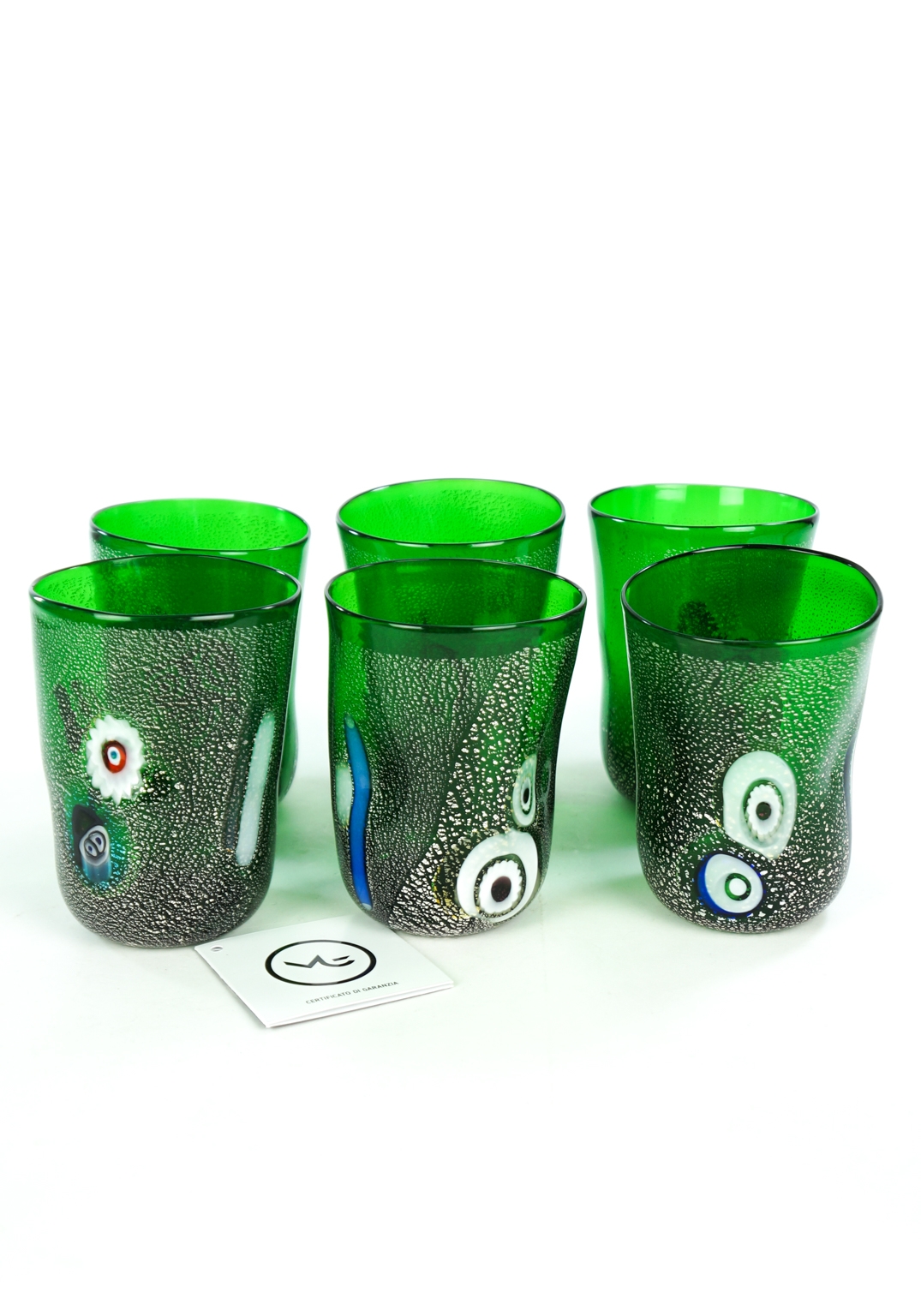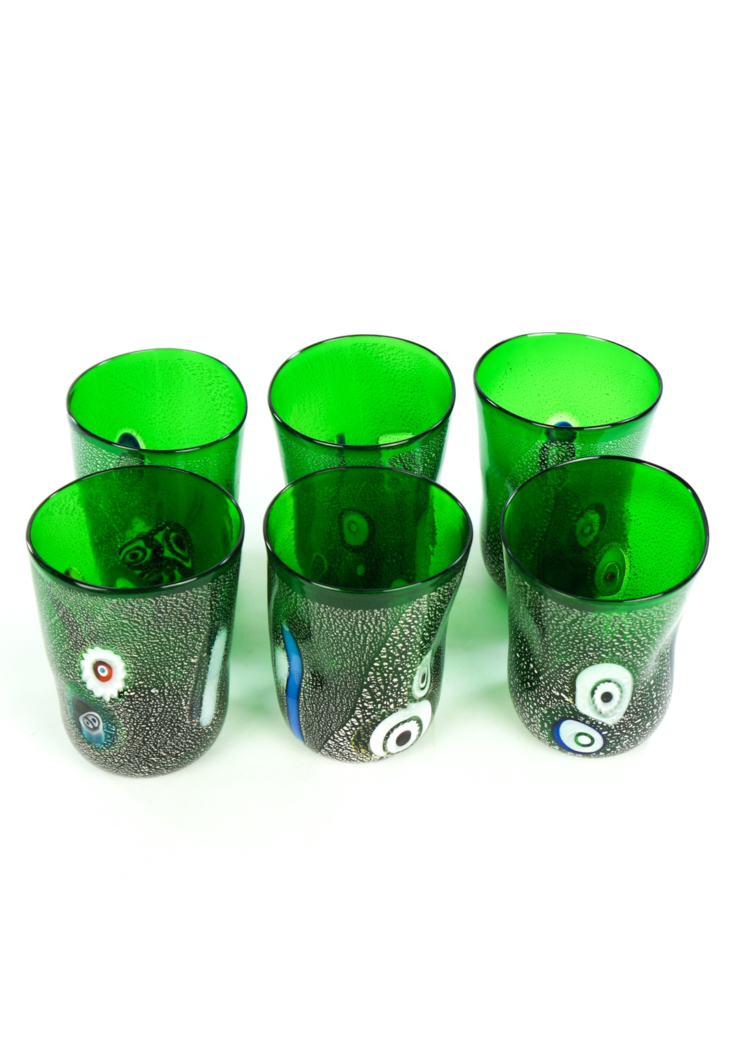 The set includes Six Murano Glass Tumblers with decoration in murrina Millefiori and real silver leaf.