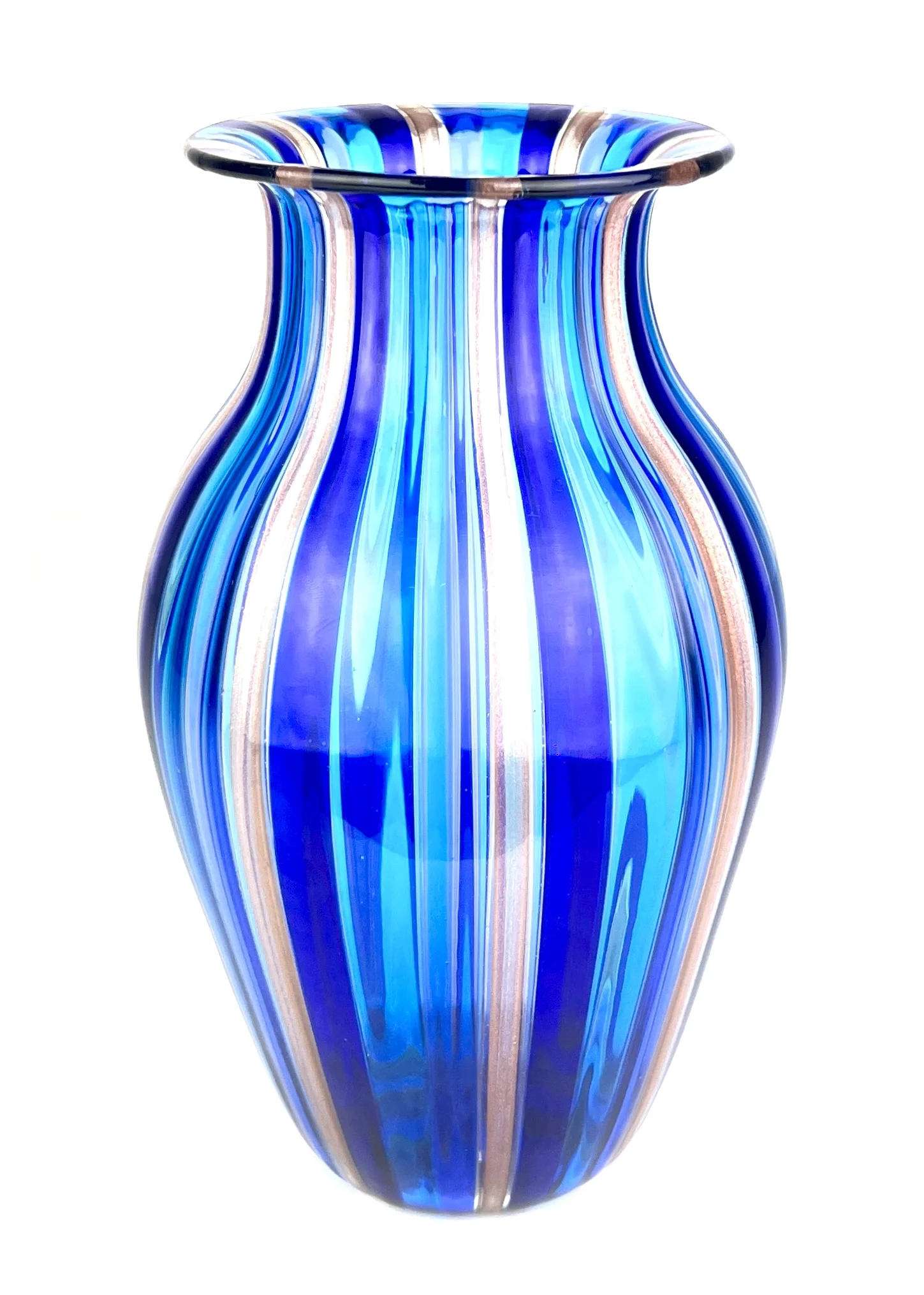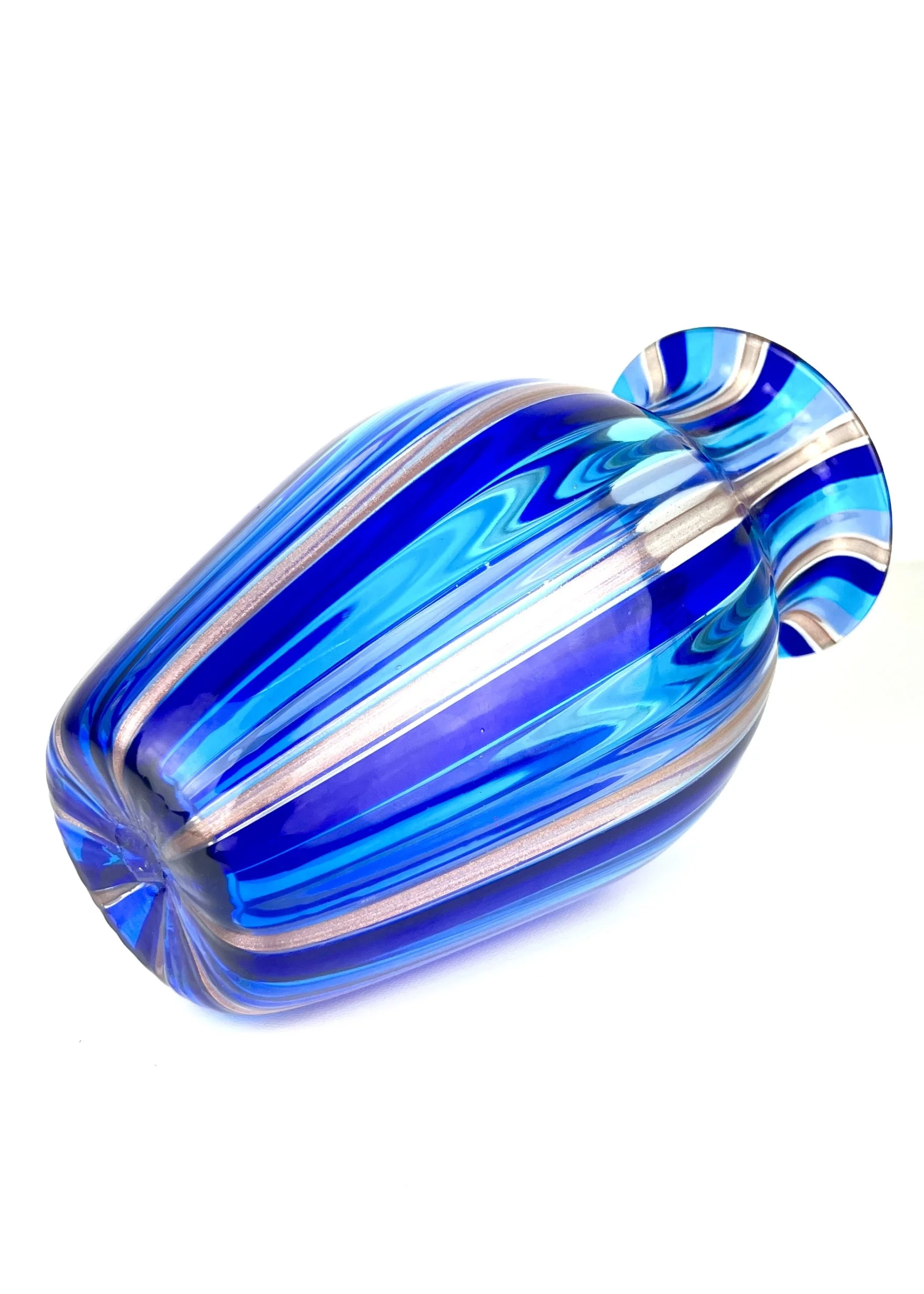 Murano blown glass vase with blue, light blue and aventurine kanne.