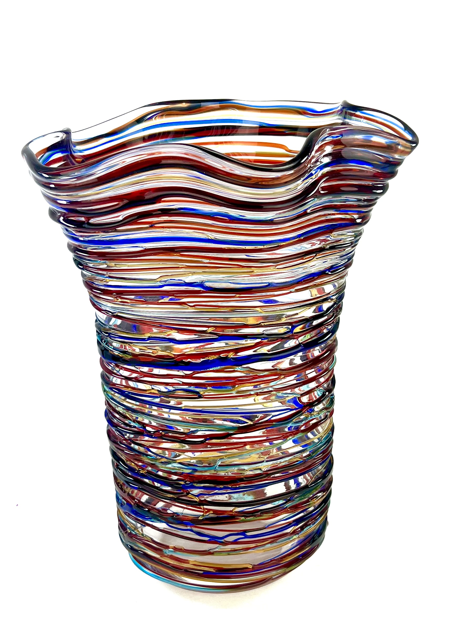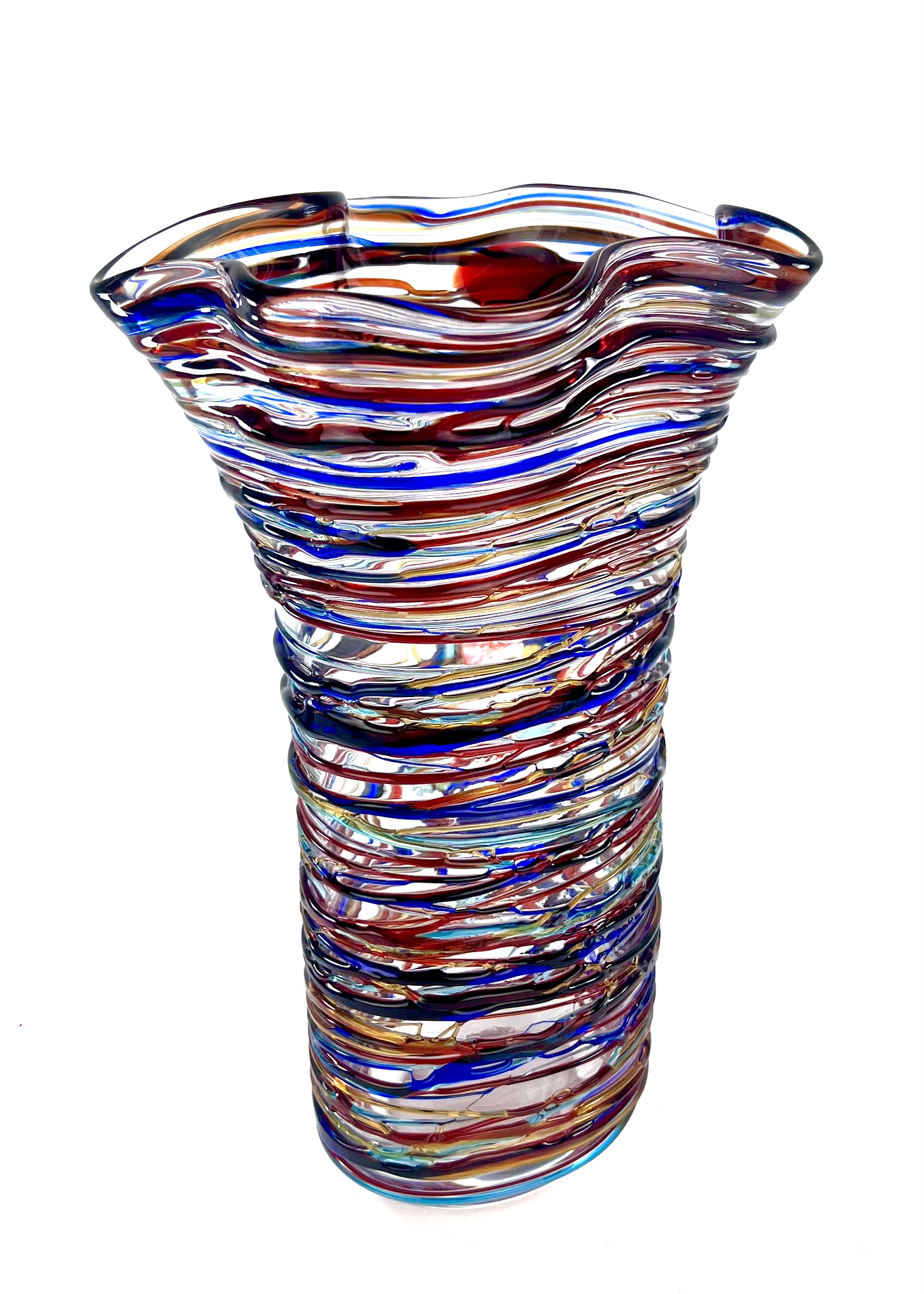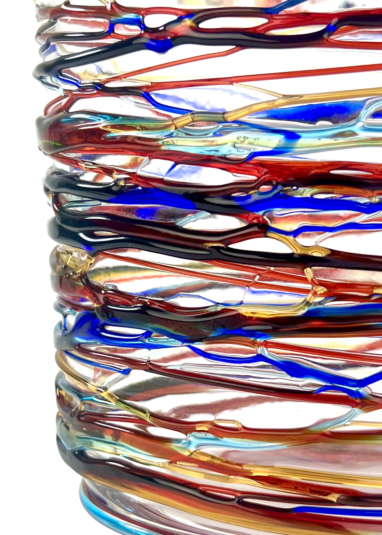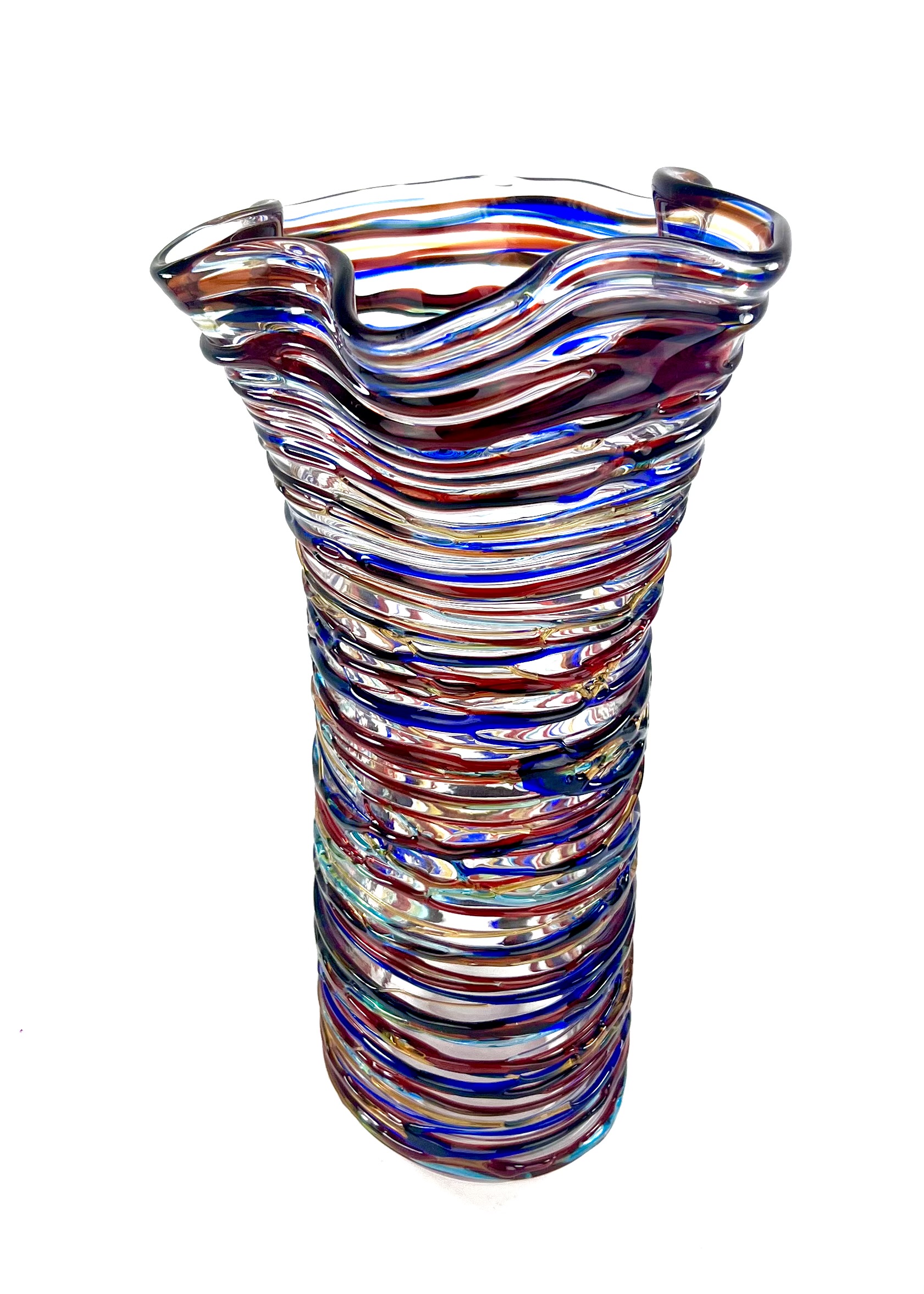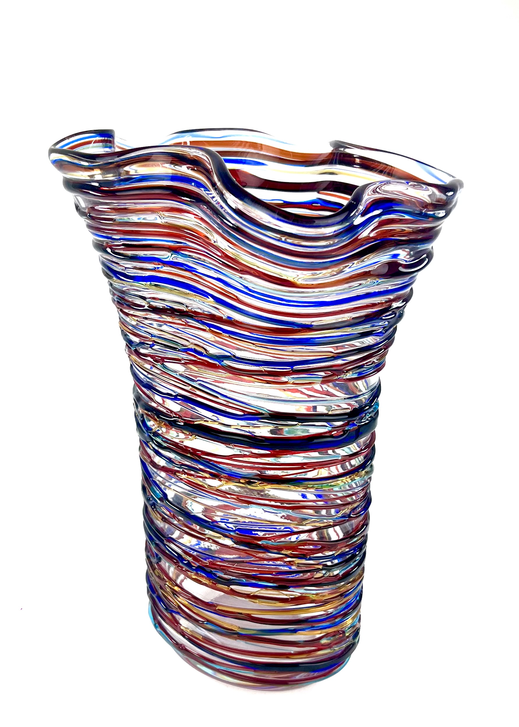 Once the vase has been made, the Murano artisans cover it with glass drippings in relief in the colors red, blue, light blue and amber.