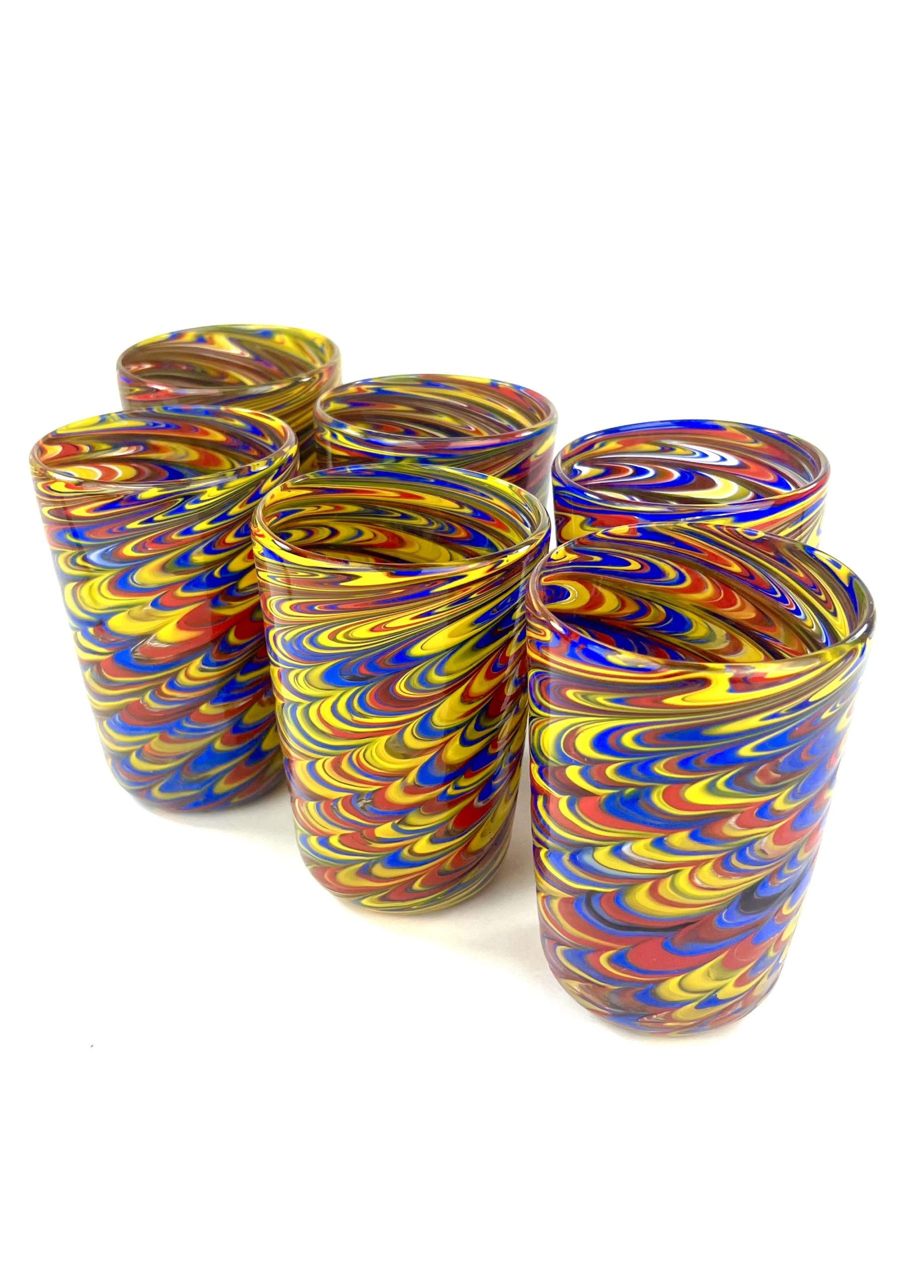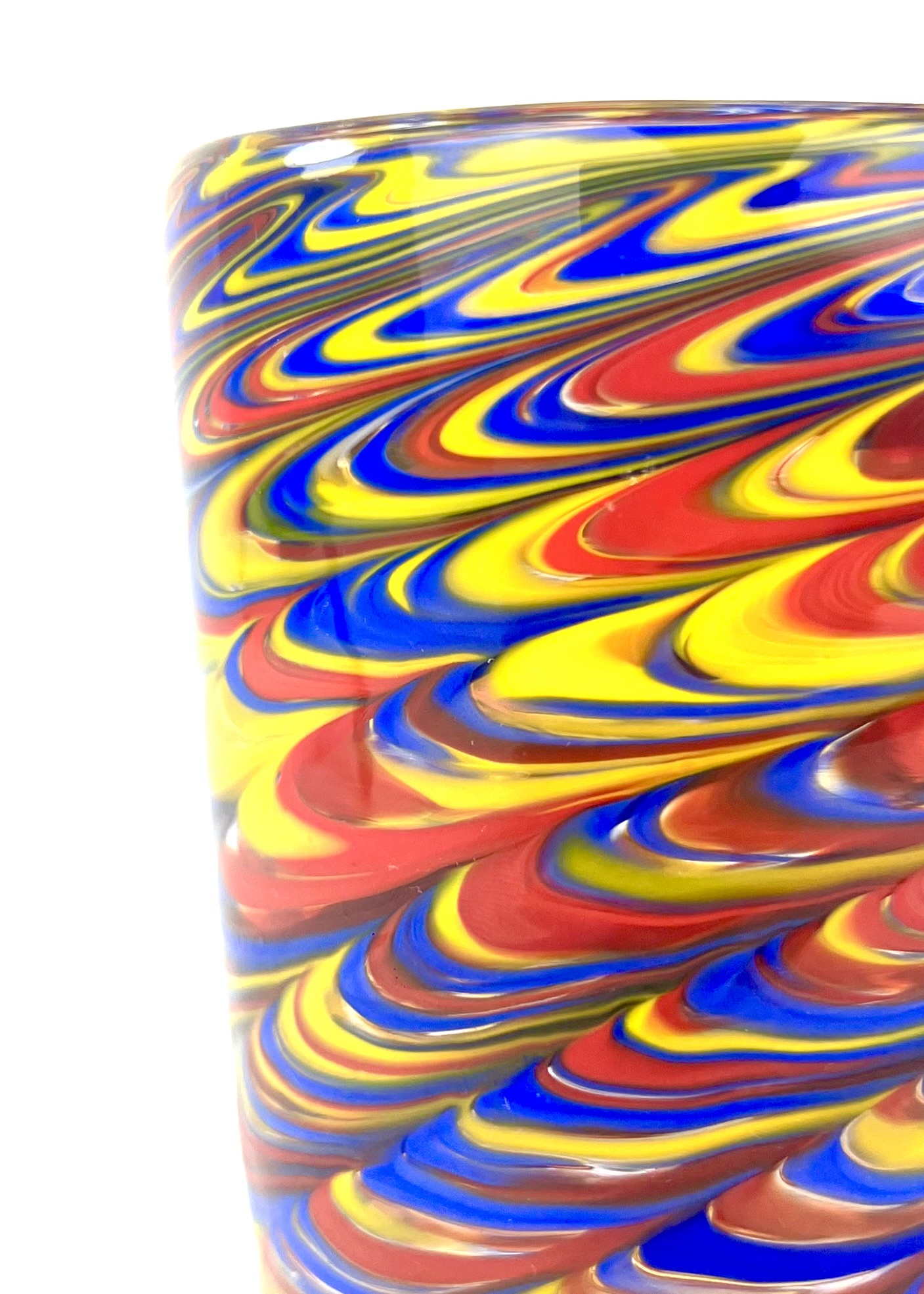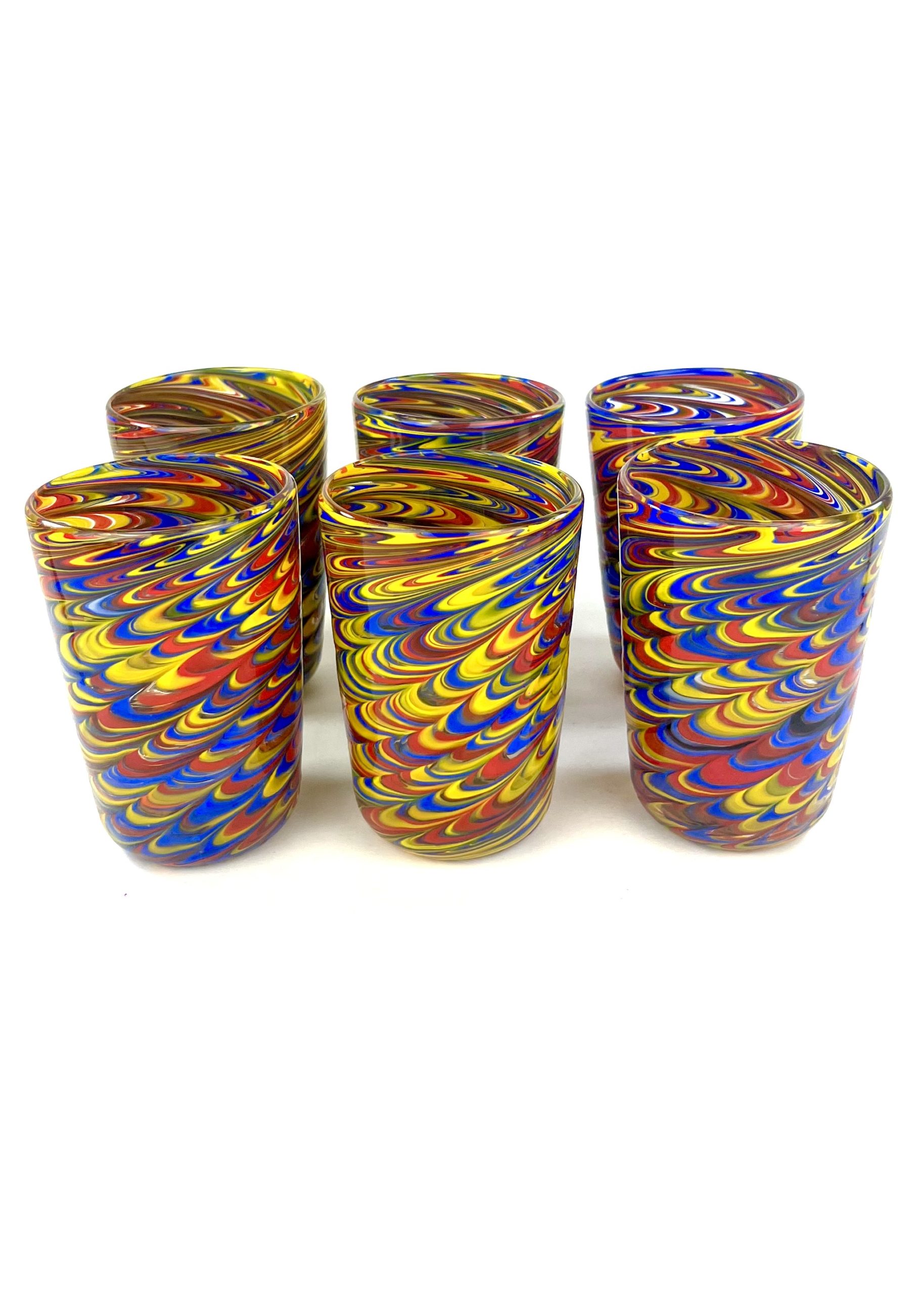 The set includes six handmade Murano drinking glasses in the colors yellow, red and blue.