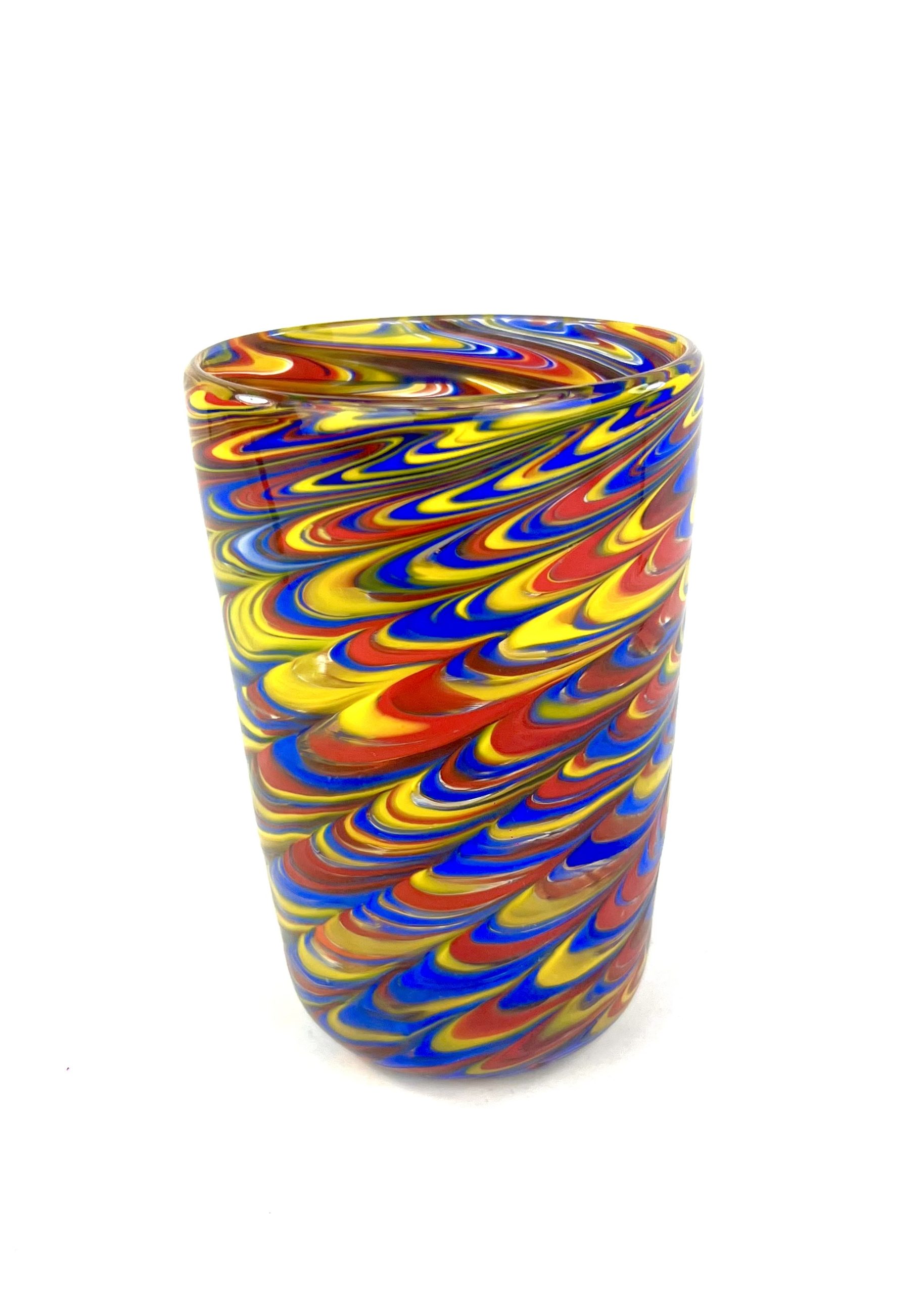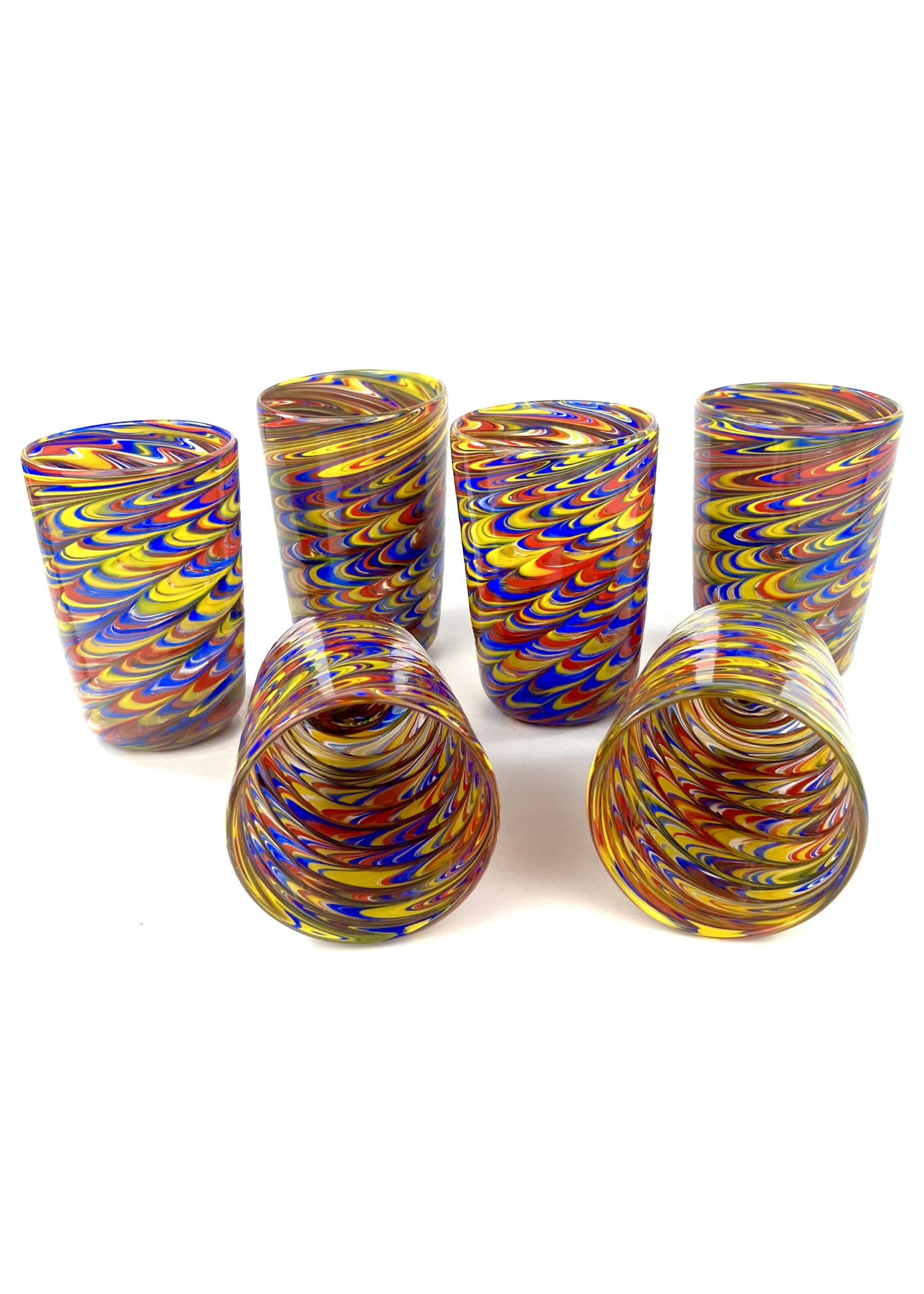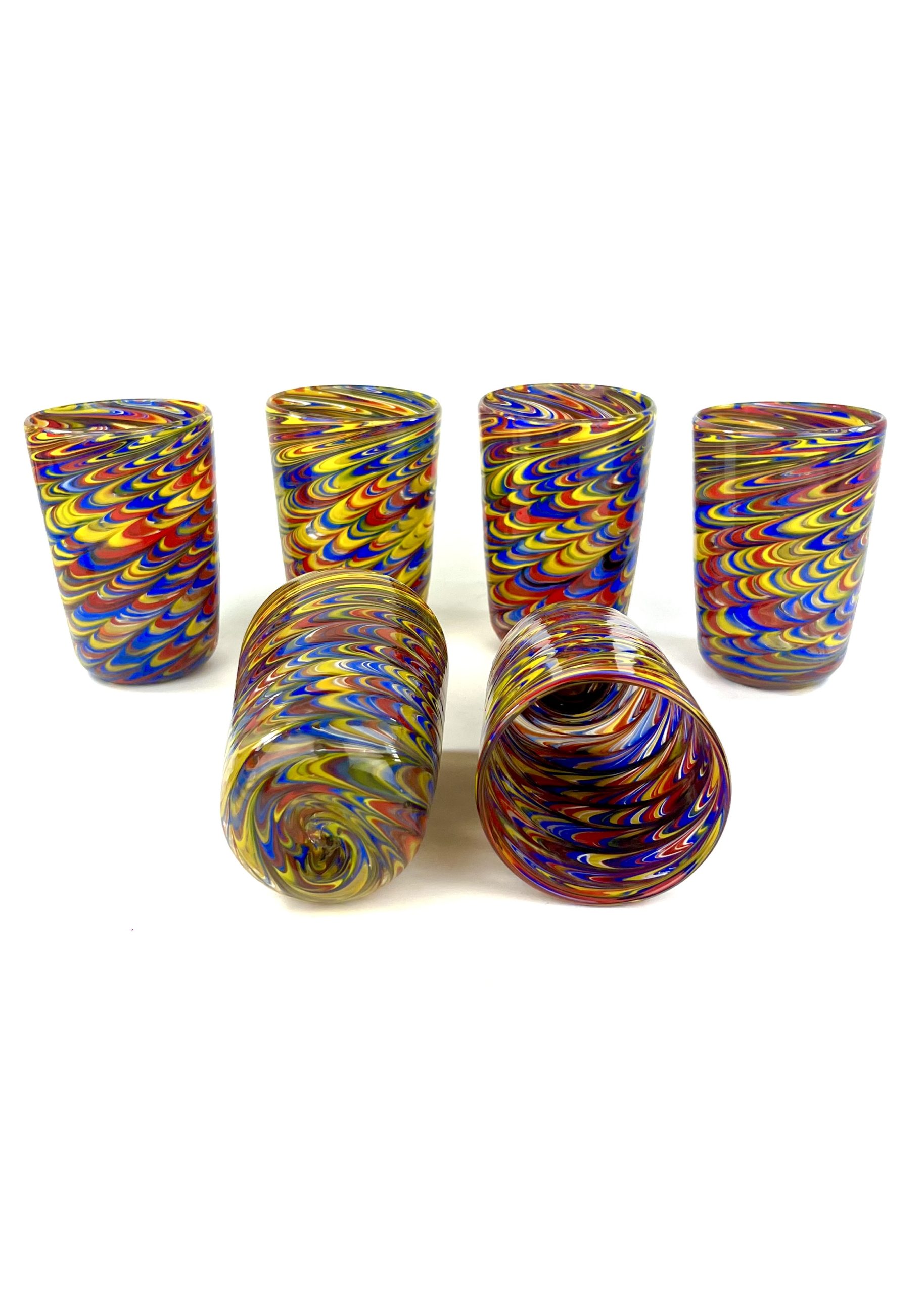 The set includes six handmade Murano drinking glasses in the colors yellow, red and blue.