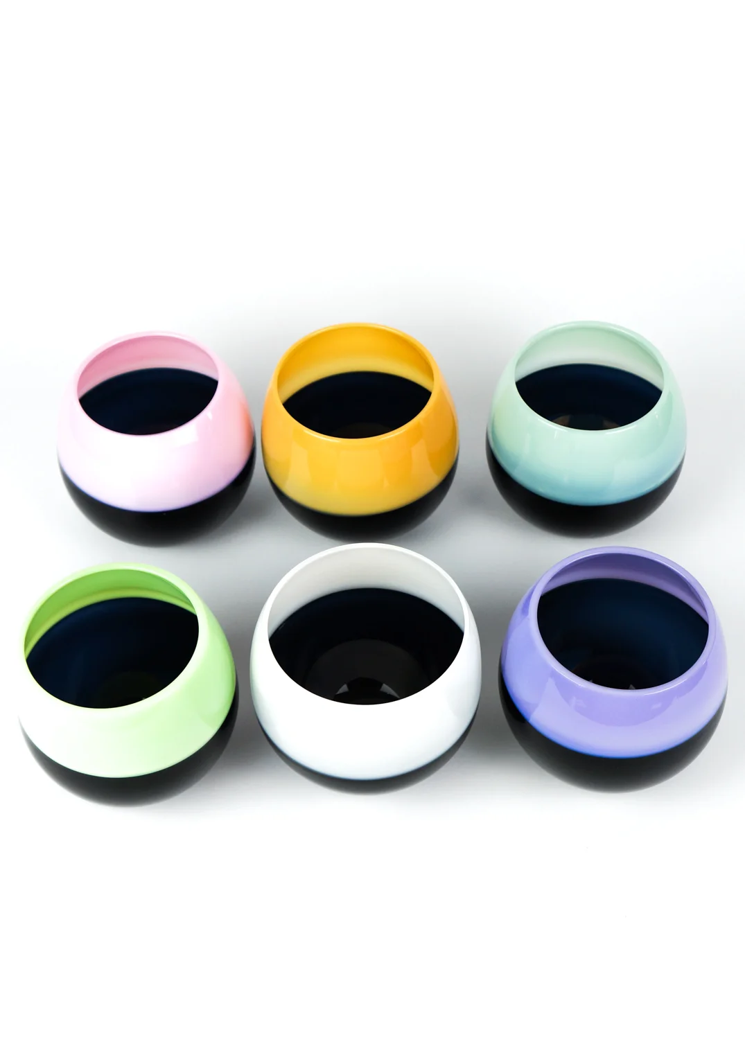 Exclusive set of Six Murano blown glass glasses for water or wine, made entirely by hand with “Incalmo” processing, lower part color black and multicolored upper part.