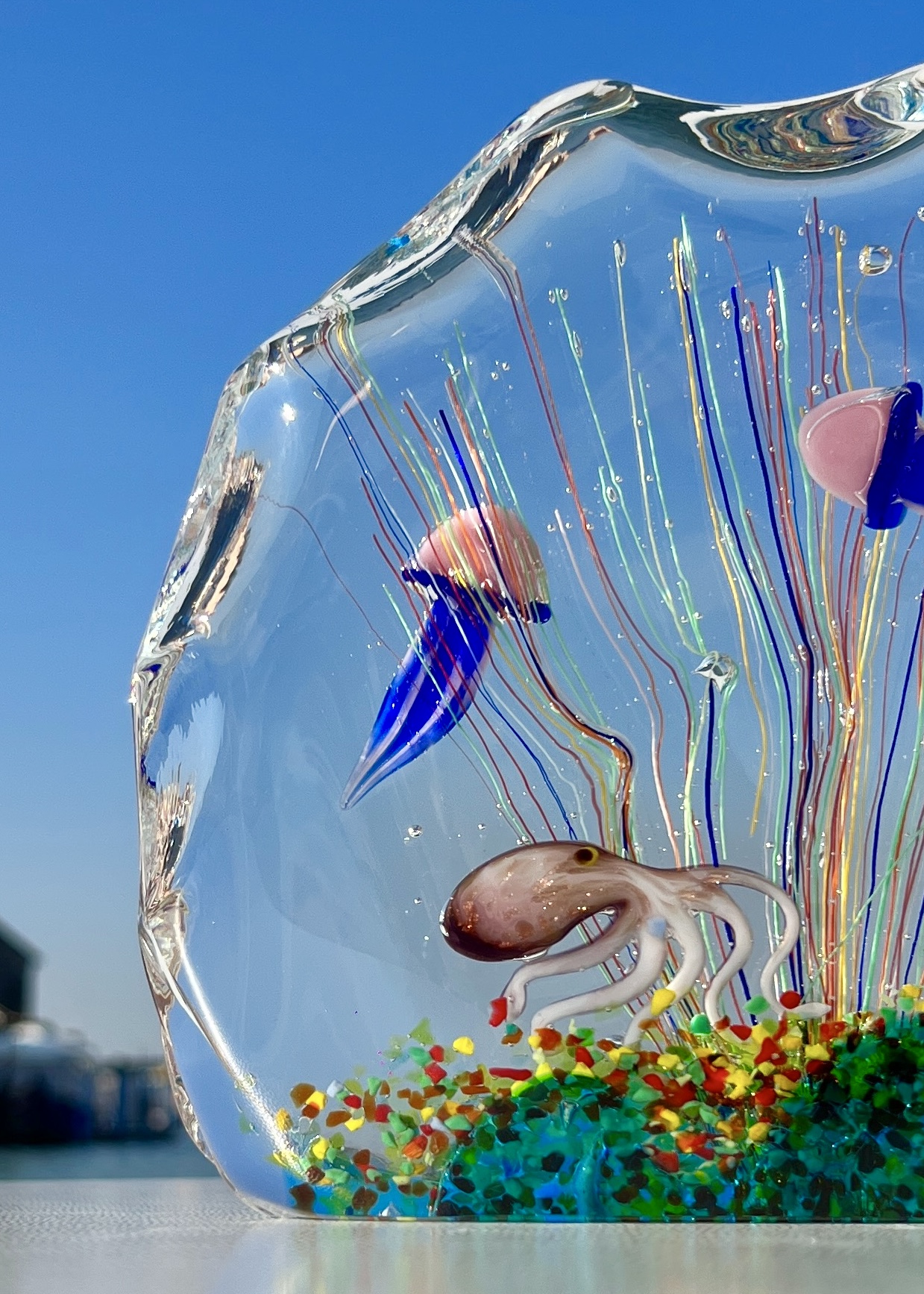 The sculpture contains 3 jellyfish, 1 octopus and various marine decorations.