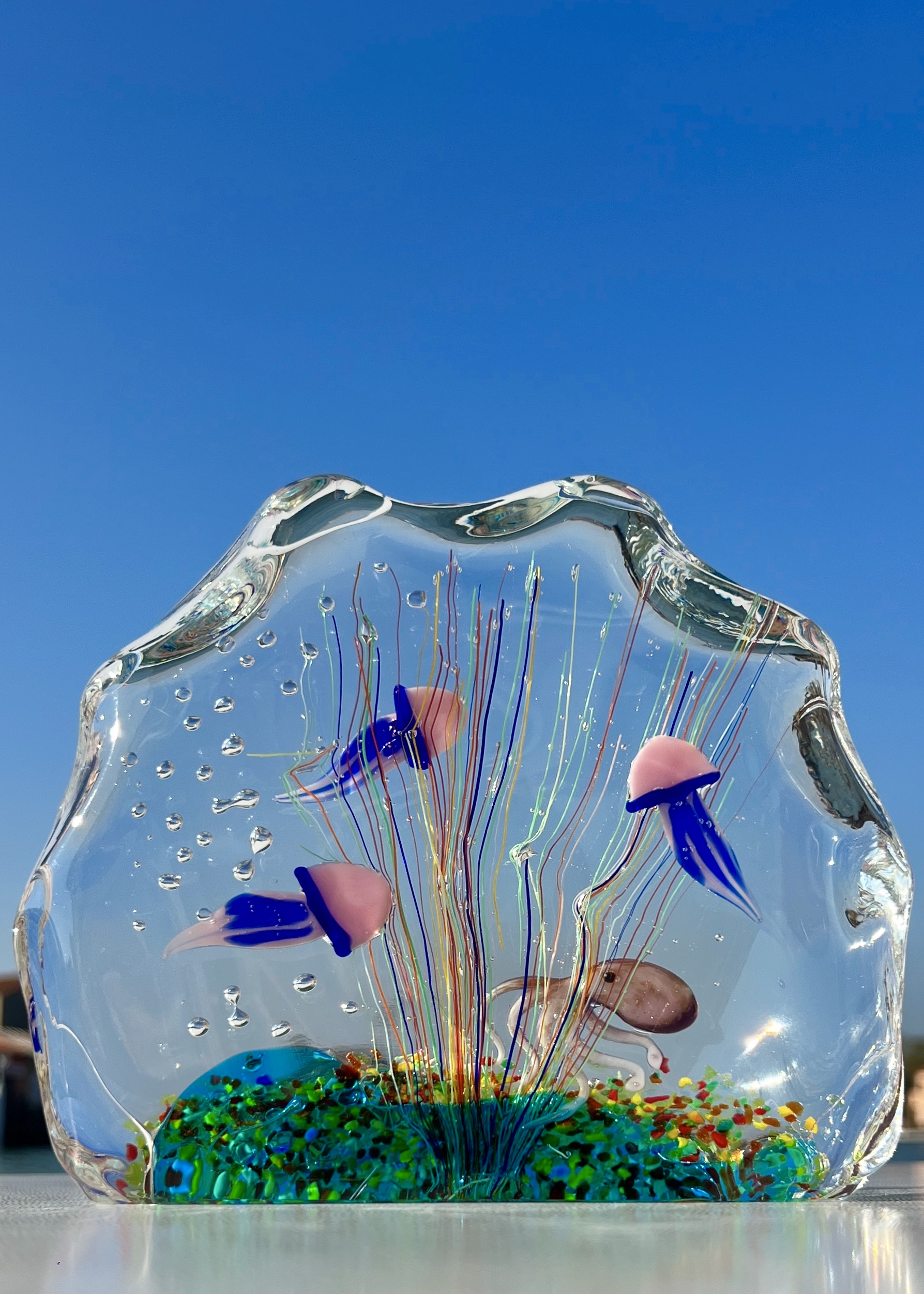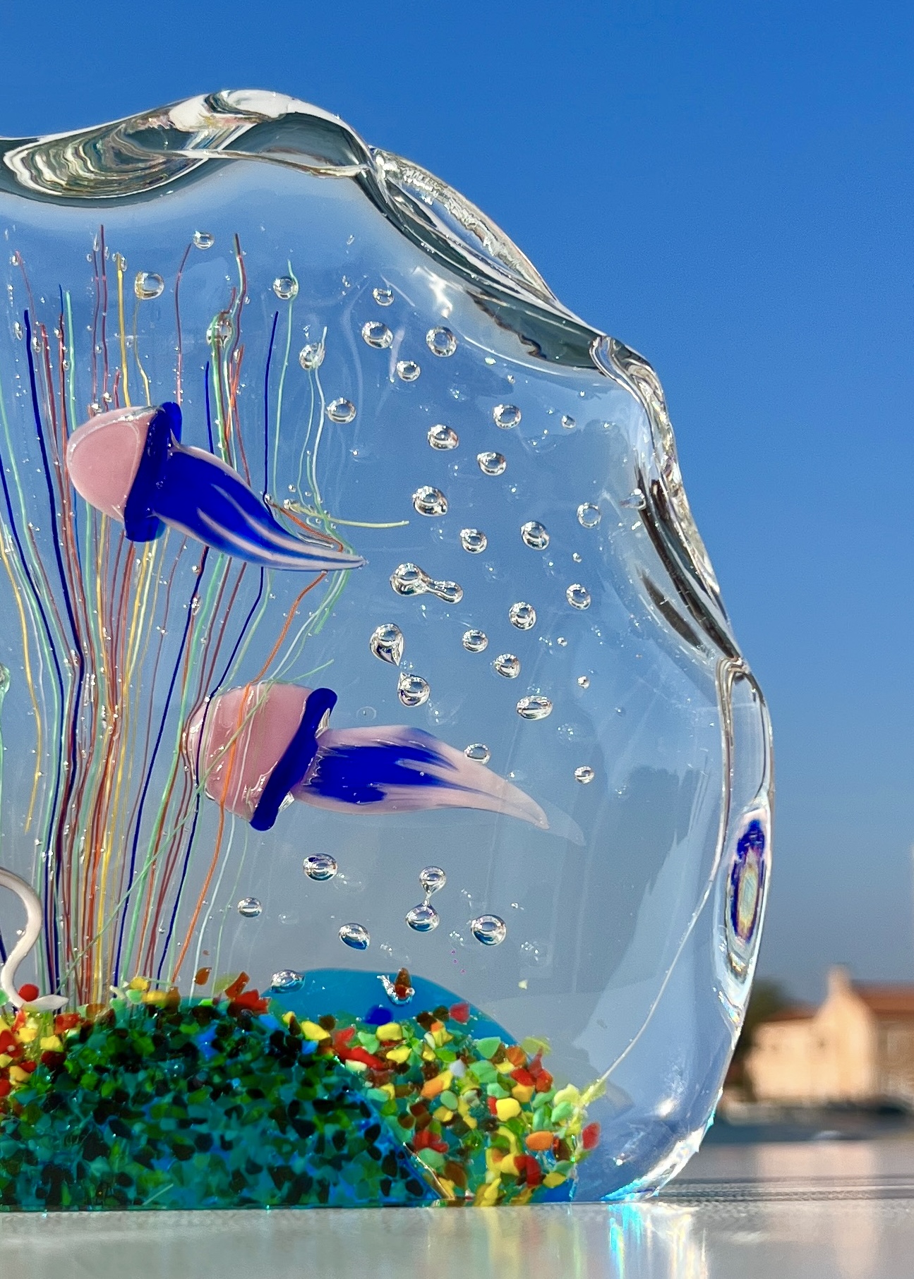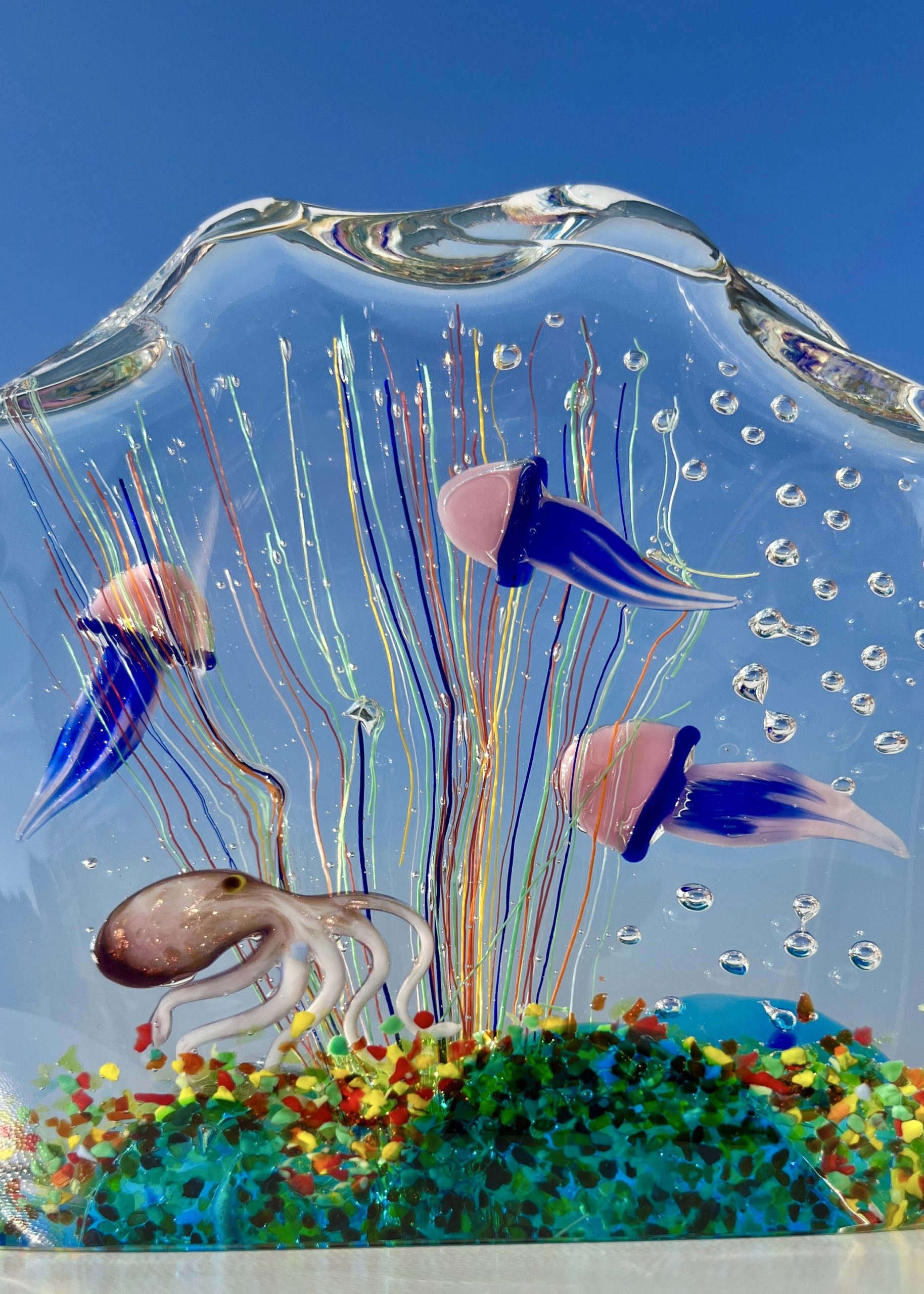 Half-moon aquarium sculpture in Murano glass.