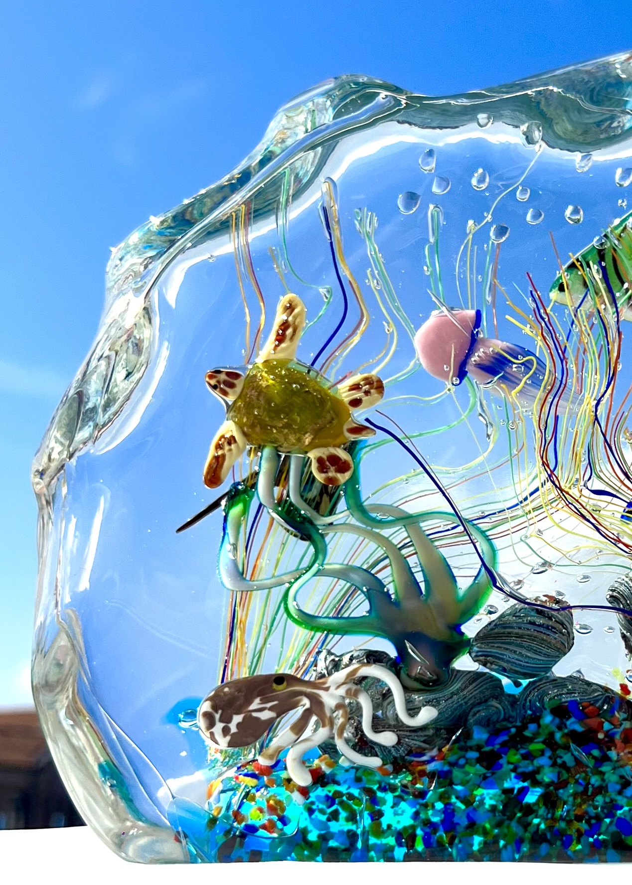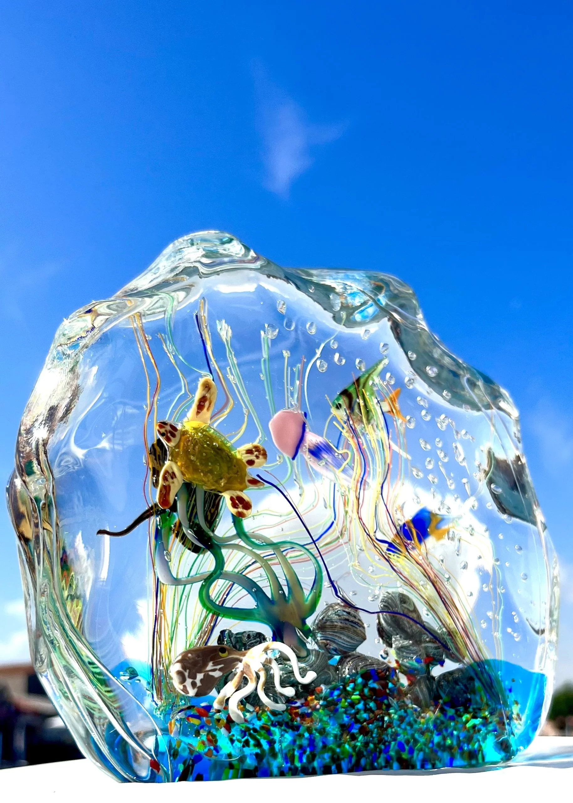The sculpture contains 1 sea turtle, 1 octopus, 1 breed fish, 1 jellyfish, 2 tropical fish, 1 sea anemone, 1 cliff and various marine decorations.