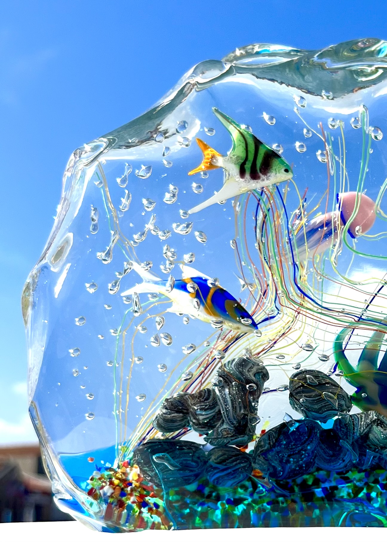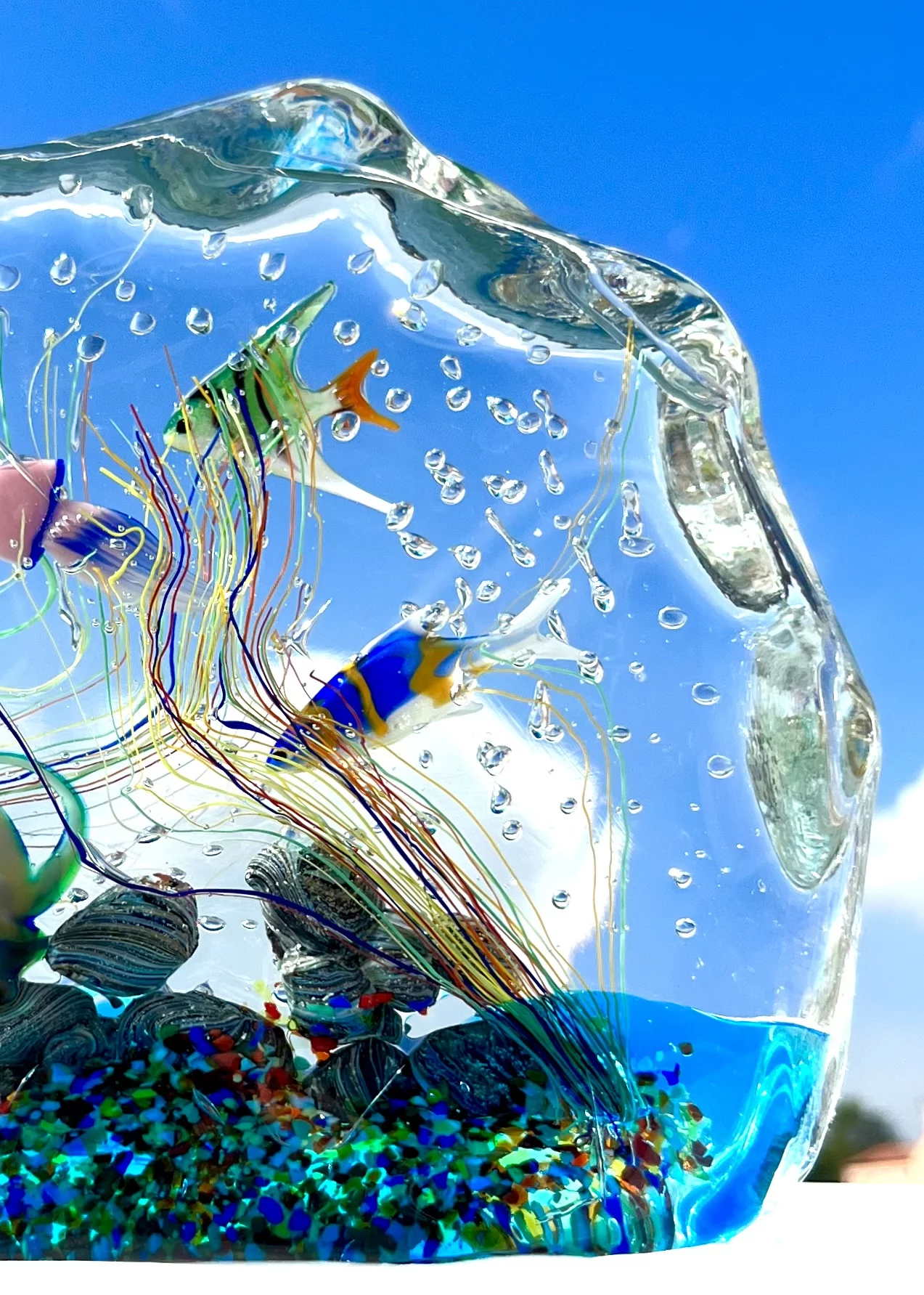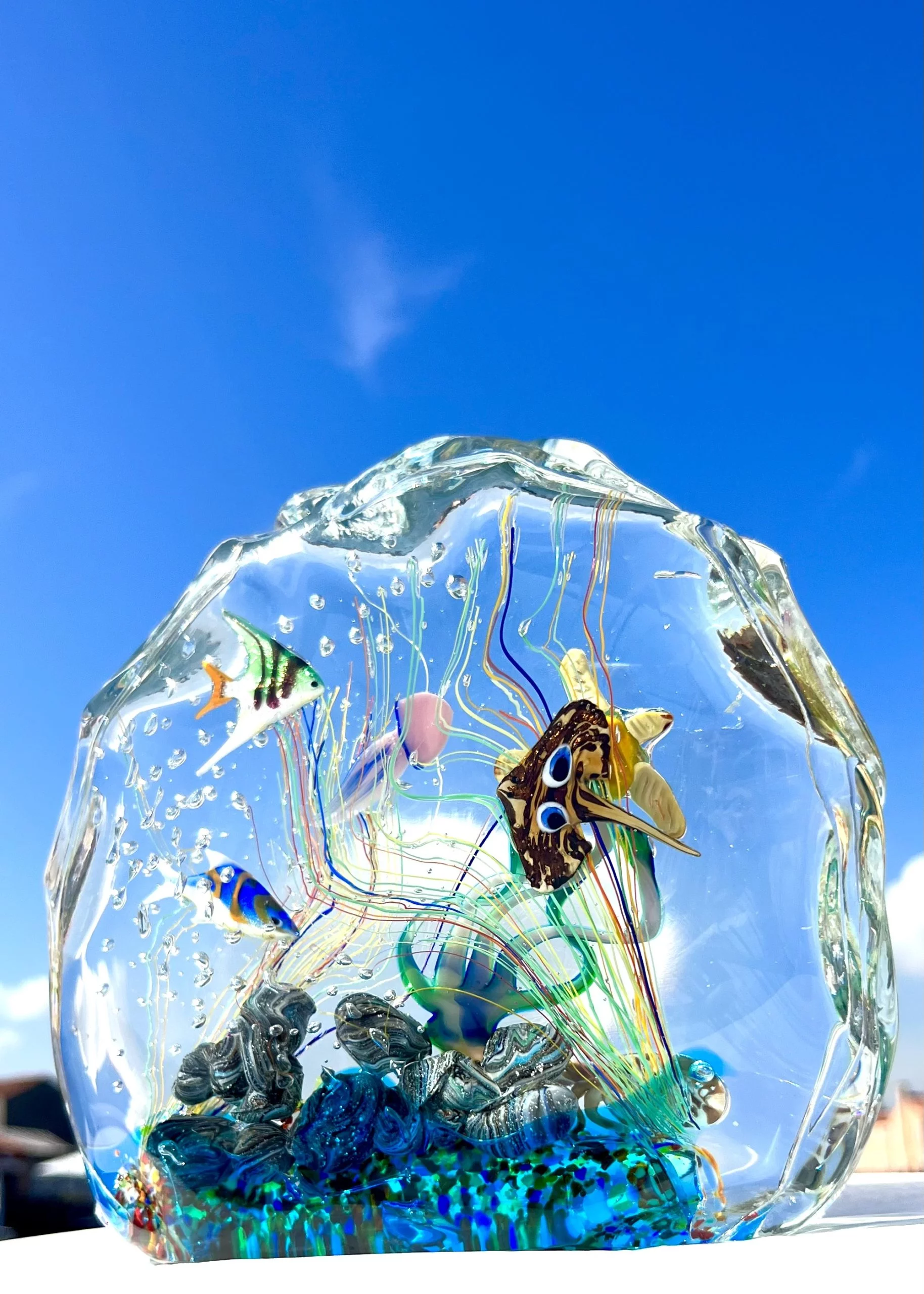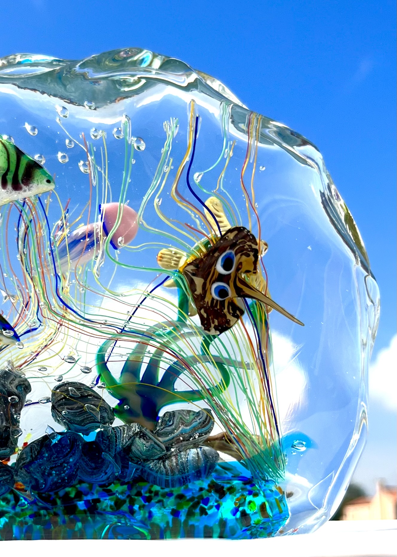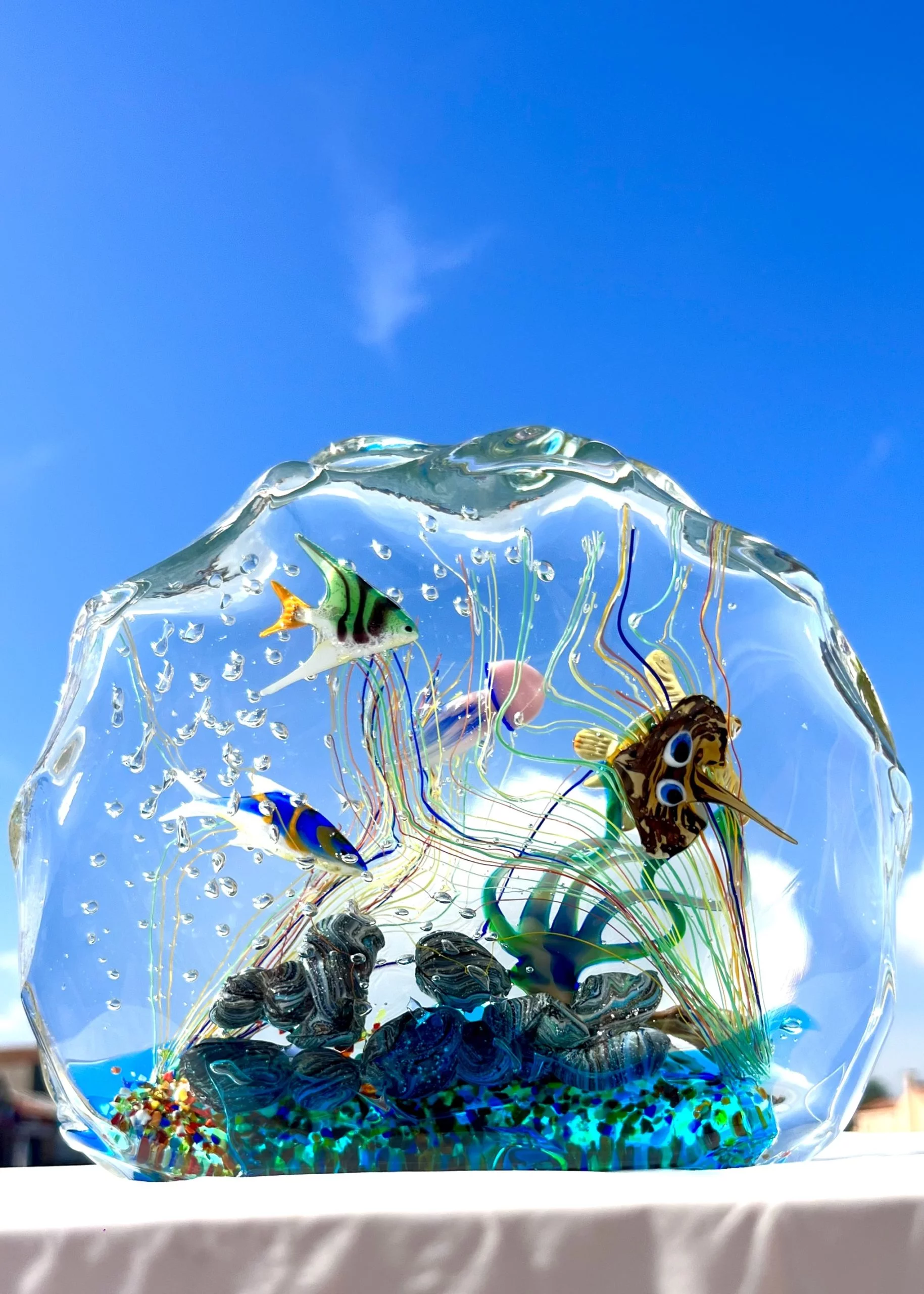 Half-moon aquarium sculpture in Murano glass.