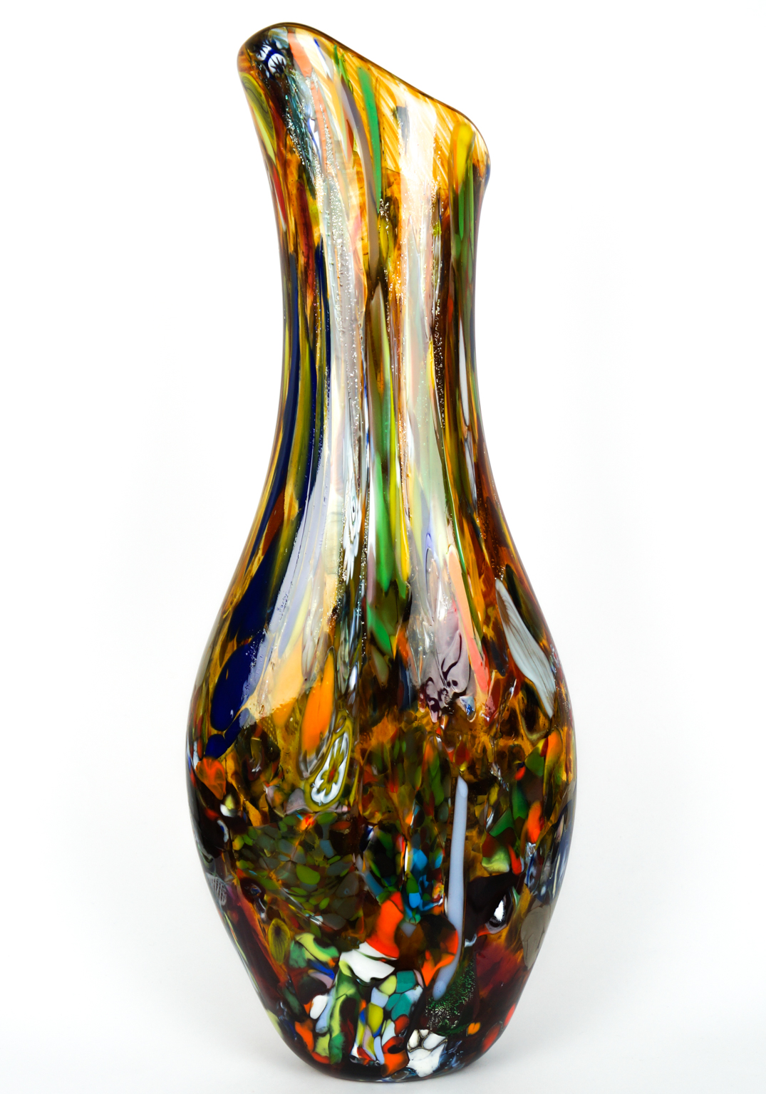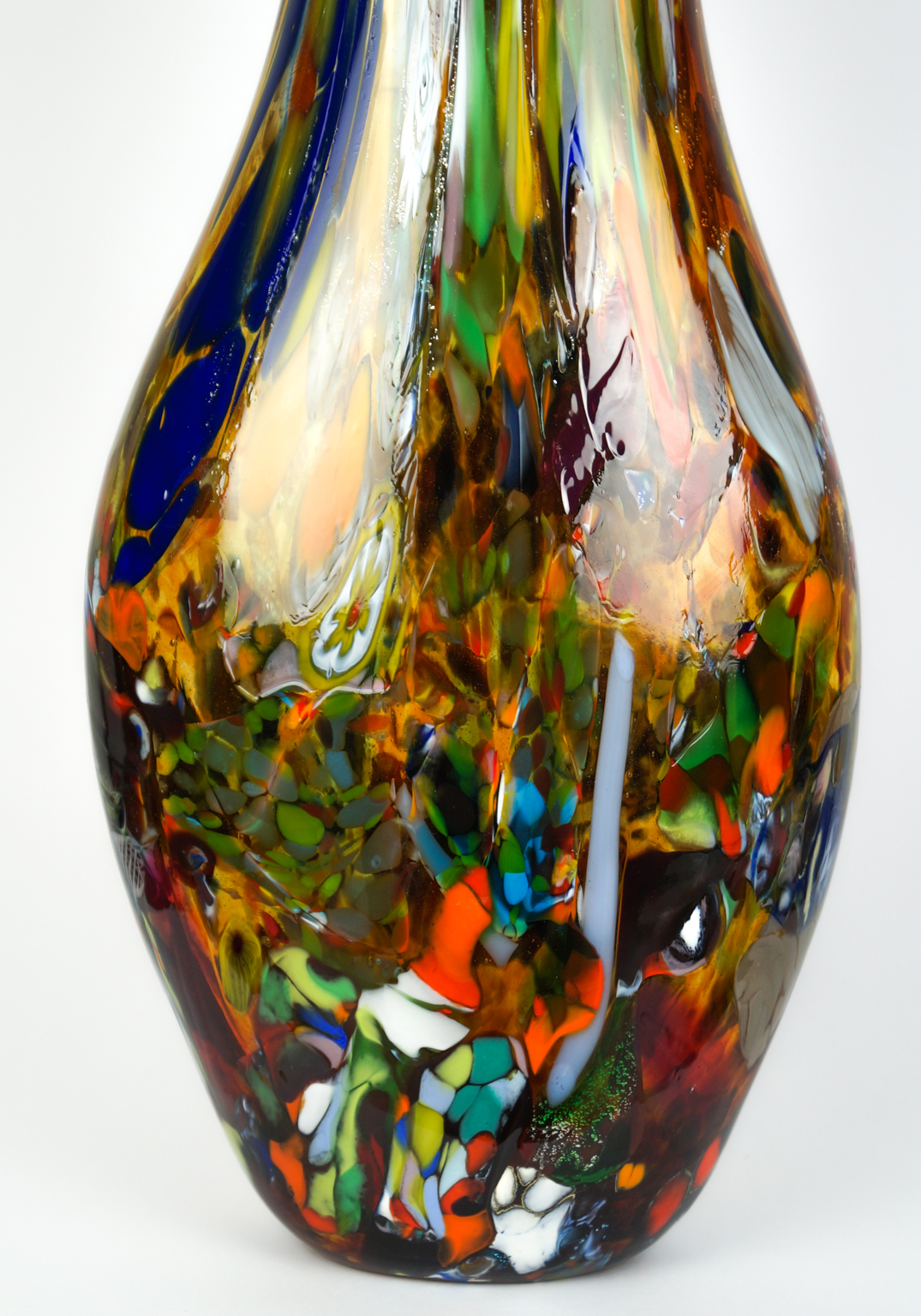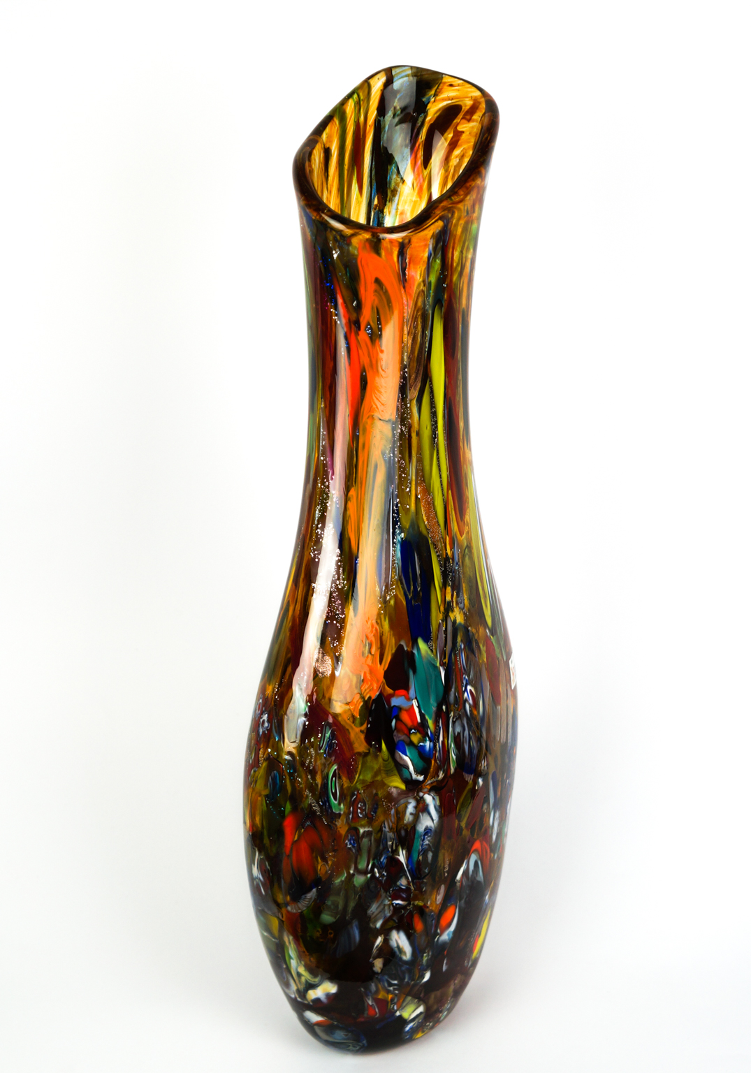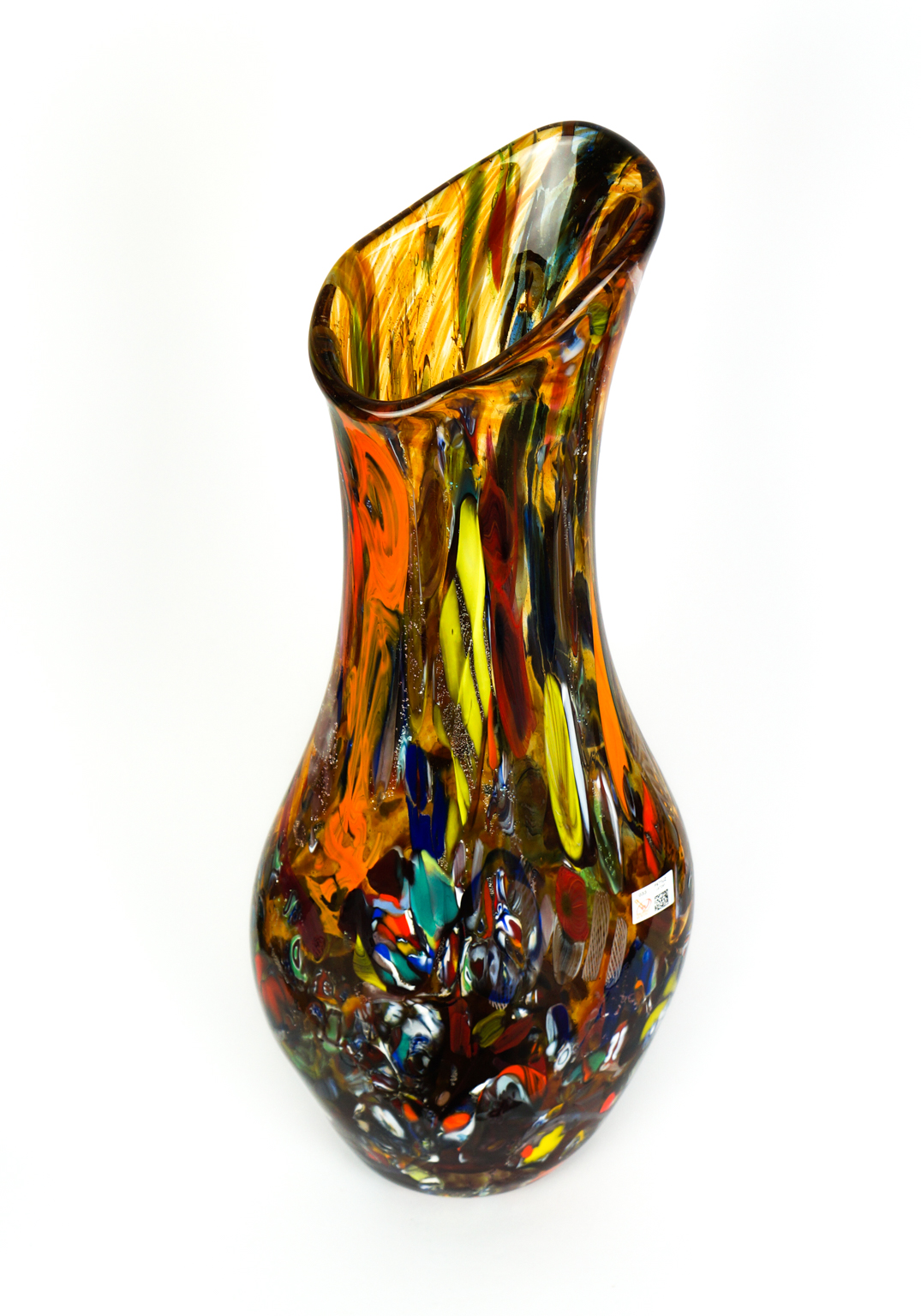 Venetian blown glass amber vase with assorted filigree decorations, Millefiori, “Mace” and silver leaf. “Costantini” glassmaker Master mixes these colors in an ever different way, making the works so unique and inimitable. Vase signed with cold engraving. The venetian glass vase has the label Marchio Vetro Artistico®.
