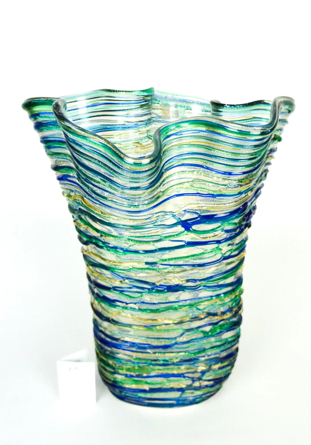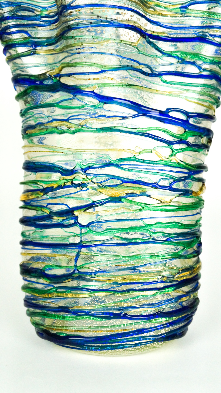 Exclusive vase in Murano blown glass entirely handmade in real silver leaf with external applications with green, amber and aquamarine glass threads.