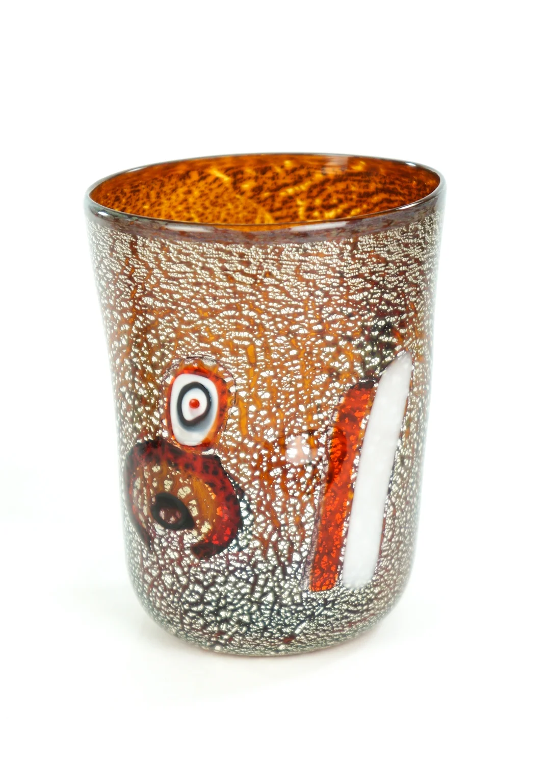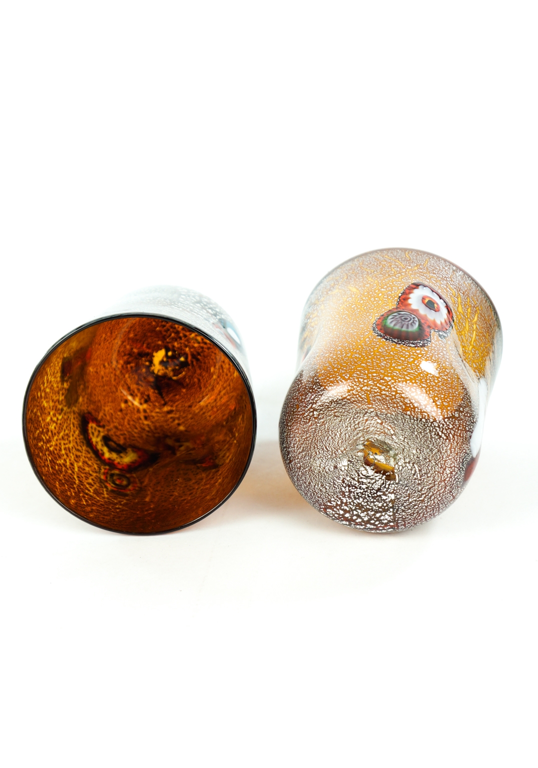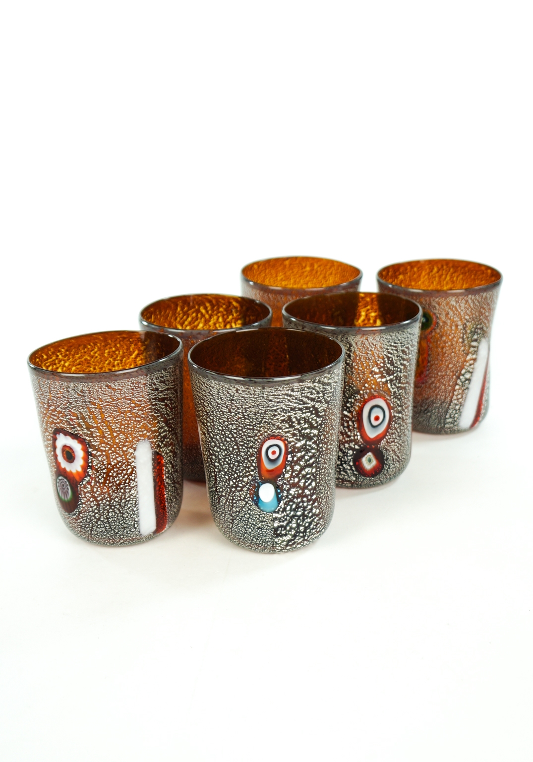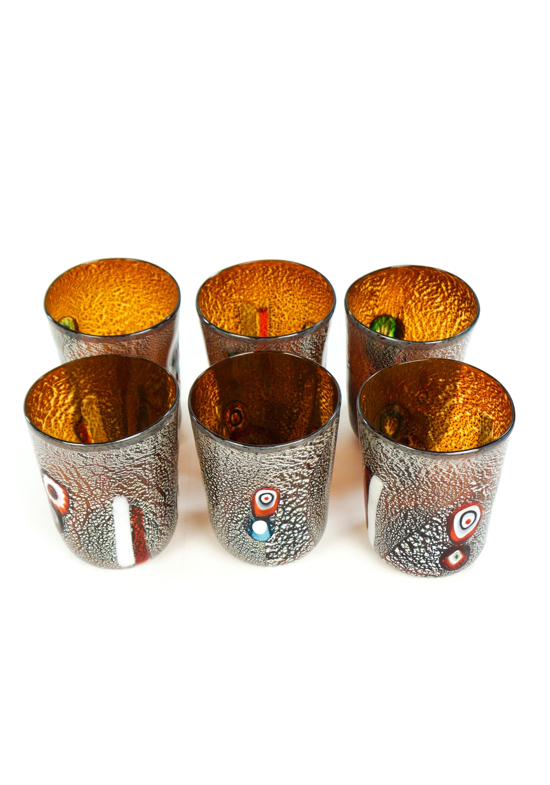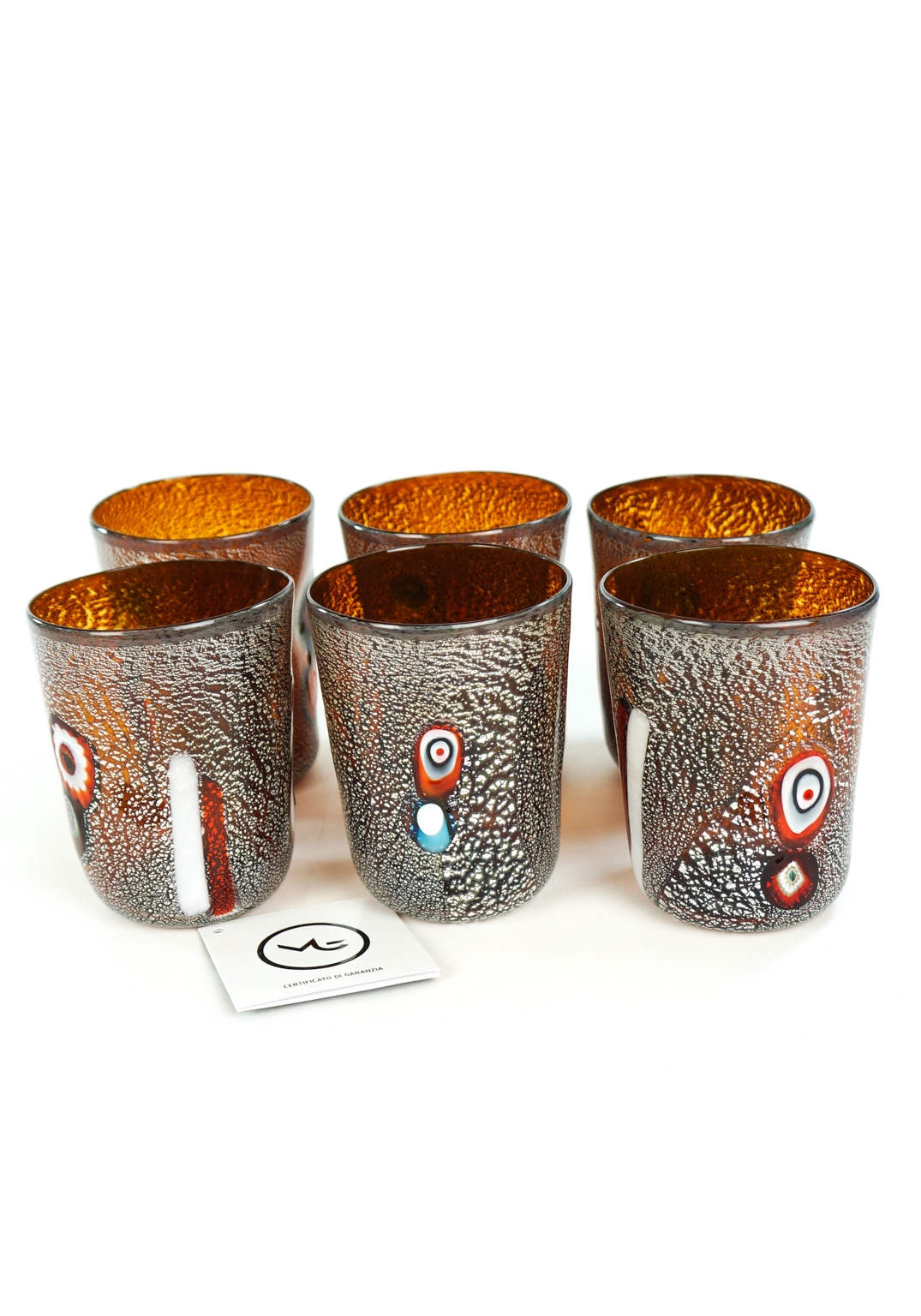 The set includes Six Murano Glass Tumblers with decoration in murrina Millefiori and real silver leaf.