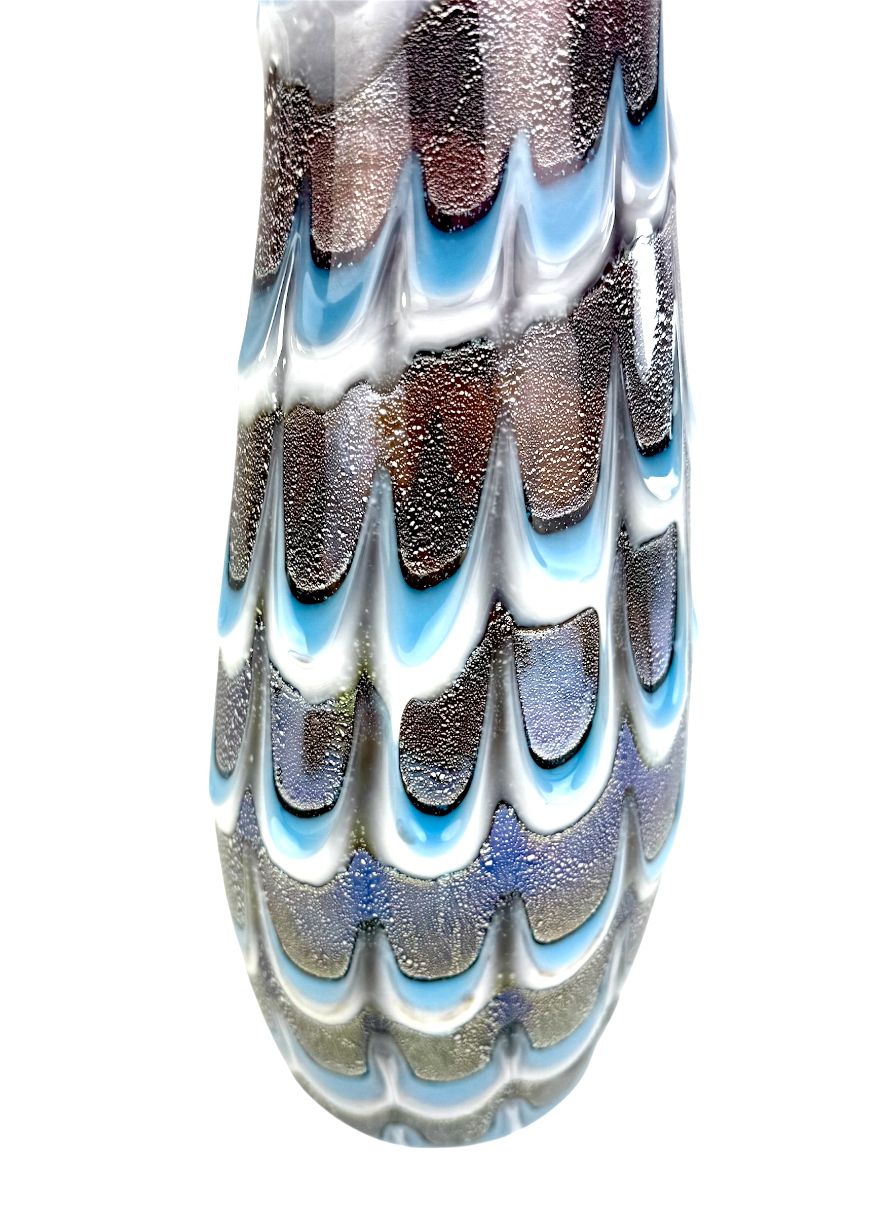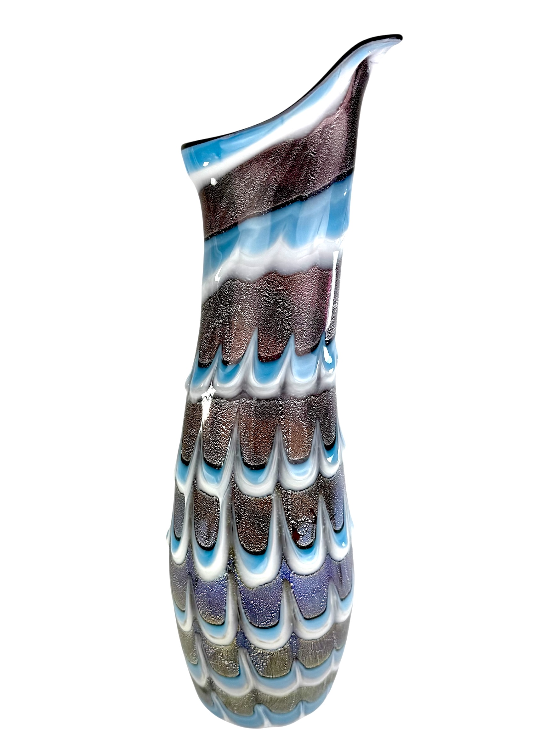 To create the Fenicio, the glass masters must rotate the mass of glass while another glass master pours another mass over it, forming a spiral.