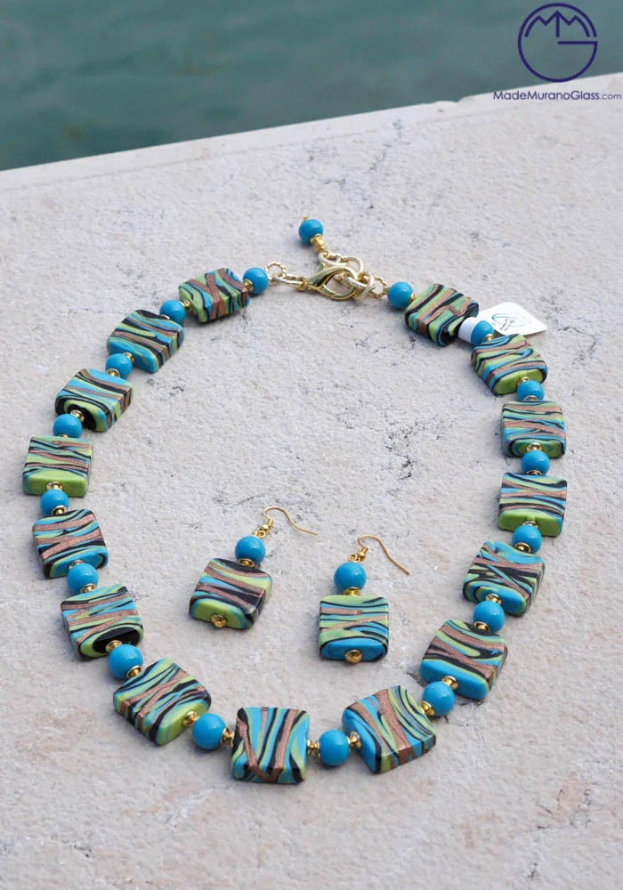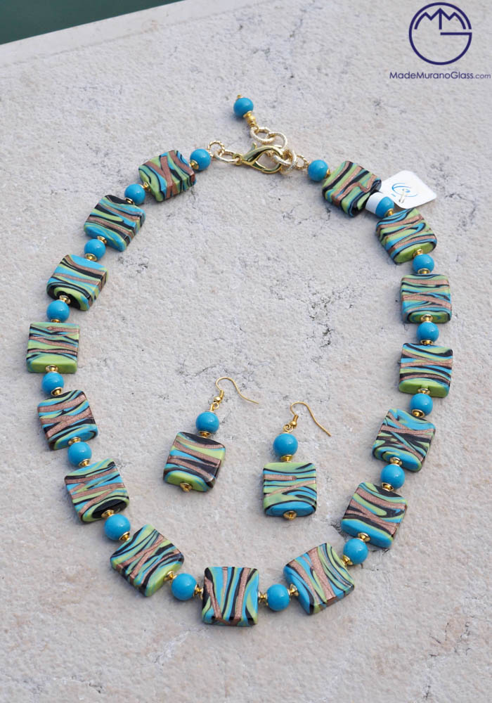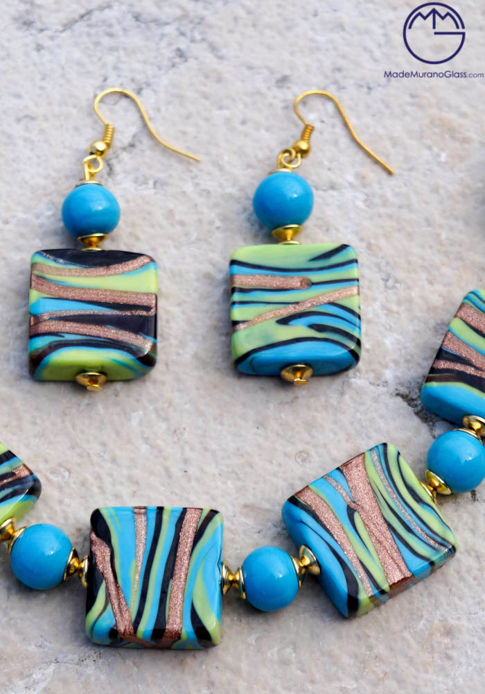 Wonderful necklace and earrings in Murano glass, completely handmade with coloured beads and “avventurina“. Venetian glass jewellery are carried out with “lume” technique. Elegant, class and sophistication are suitable words for this amazing Murano collection jewellery.