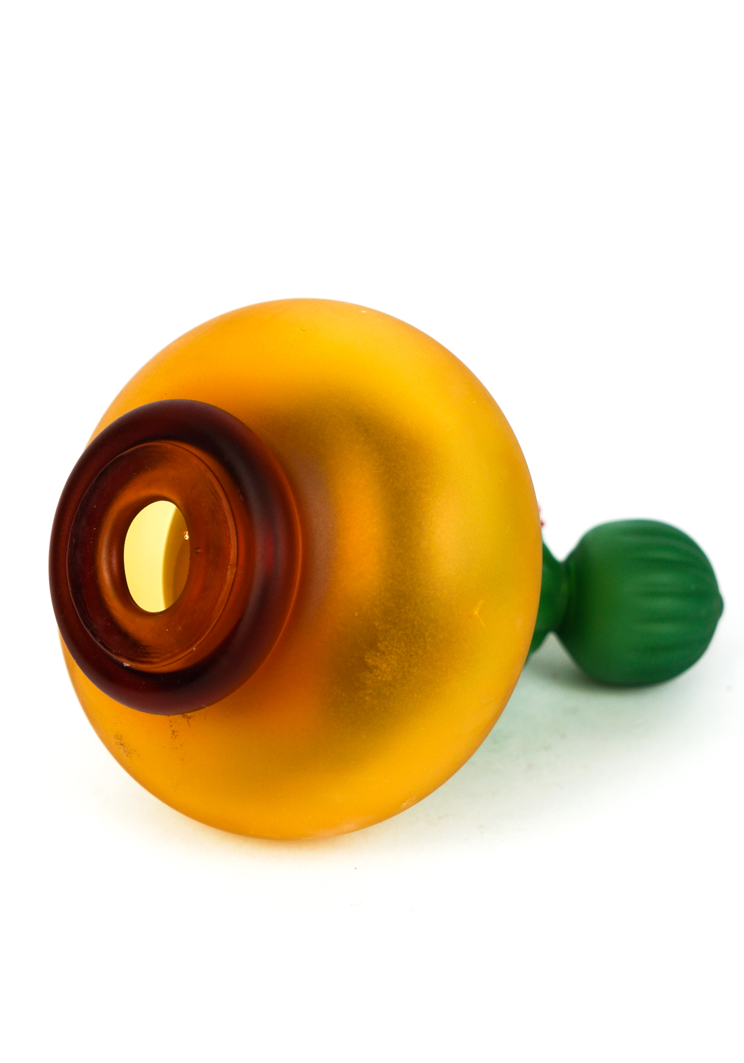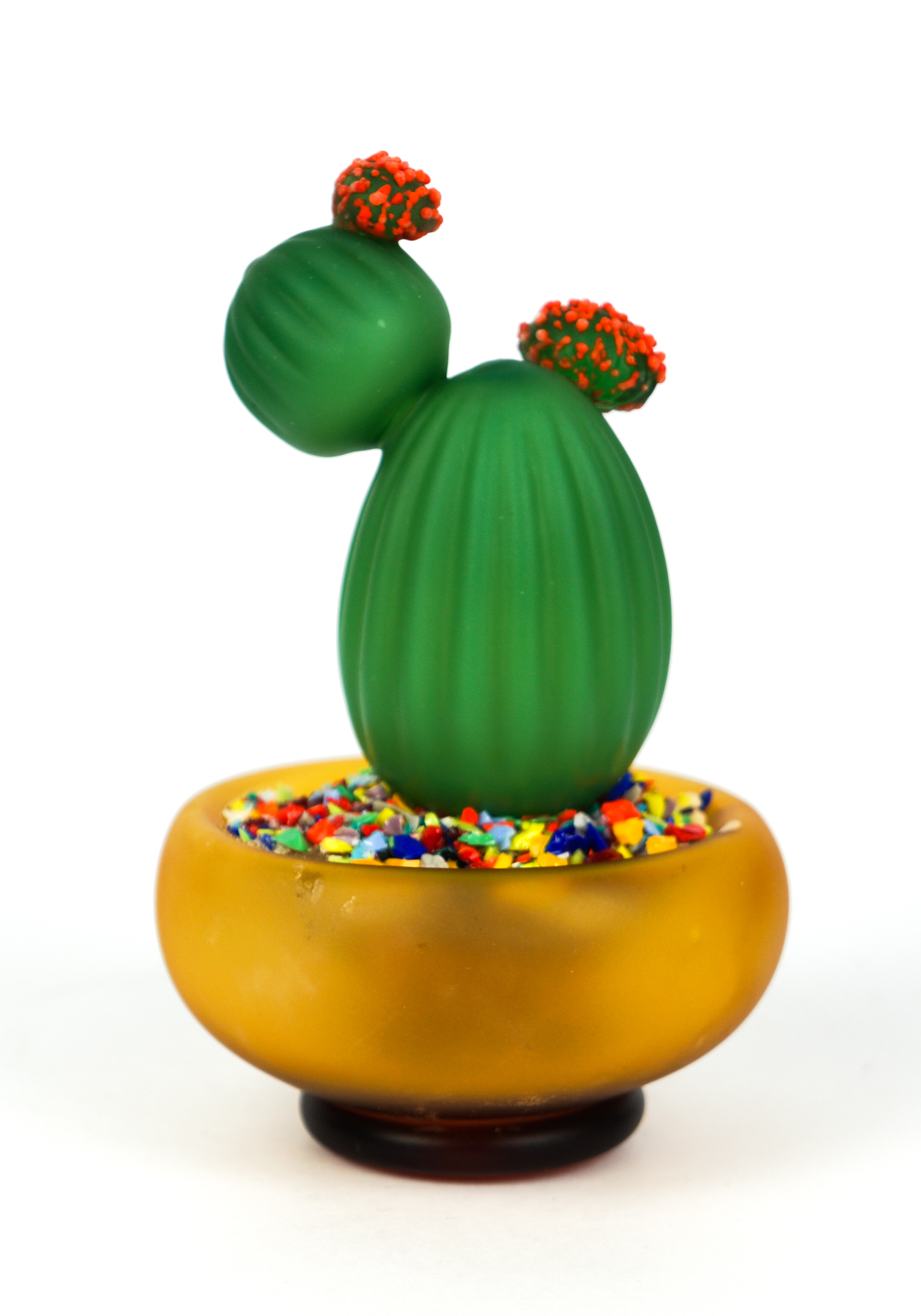 The vase of the plant is satin amber colored, the plant is green and the vase is decoded inside with “Mace” multicolored glass.